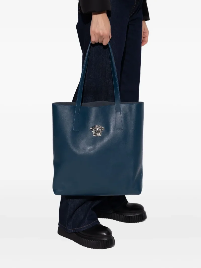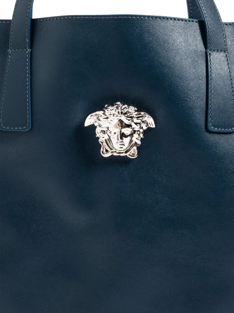 Geanta Versace La Medusa Leather Tote bleumarin, realizata din piele, cu forma dreptunghiulara, manere circulare, compartiment principal si decorata cu logo Medusa. 100% piele de vitel; 100% piele de vitel.