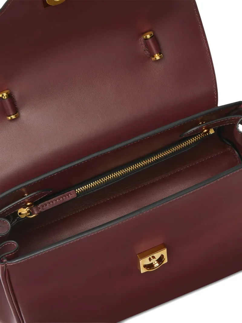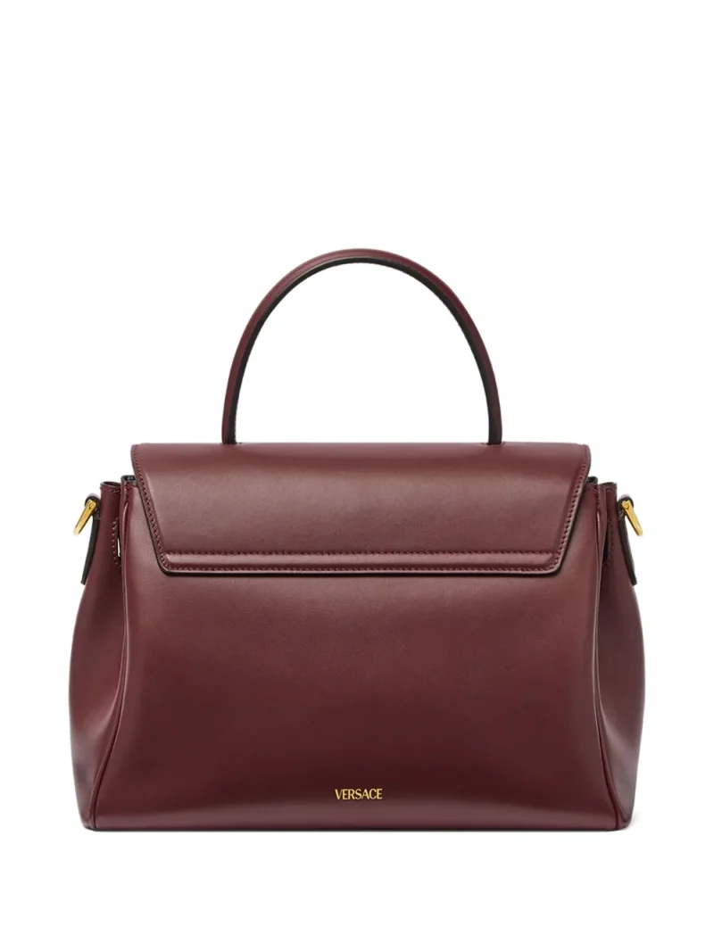Geanta Versace La Medusa visiniu, realizata din piele, cu maner circular, inchidere cu clapeta si magnet, compartiment principal, bareta de umar ajustabila, Chain-Link masiv atasat si logo Medusa la exterior. Detalii: Latime- 15 cm; Inaltime- 18 cm; Adancime- 22 cm. 100% piele; 100% piele.