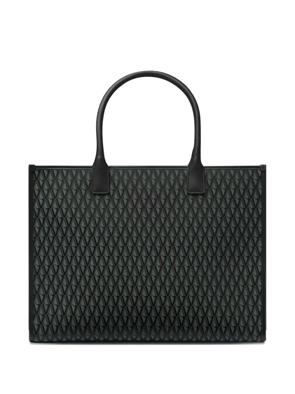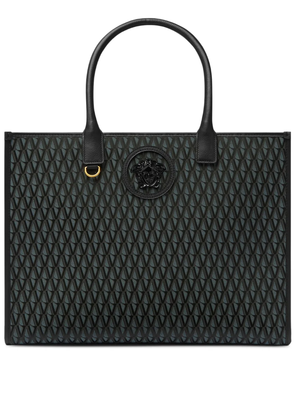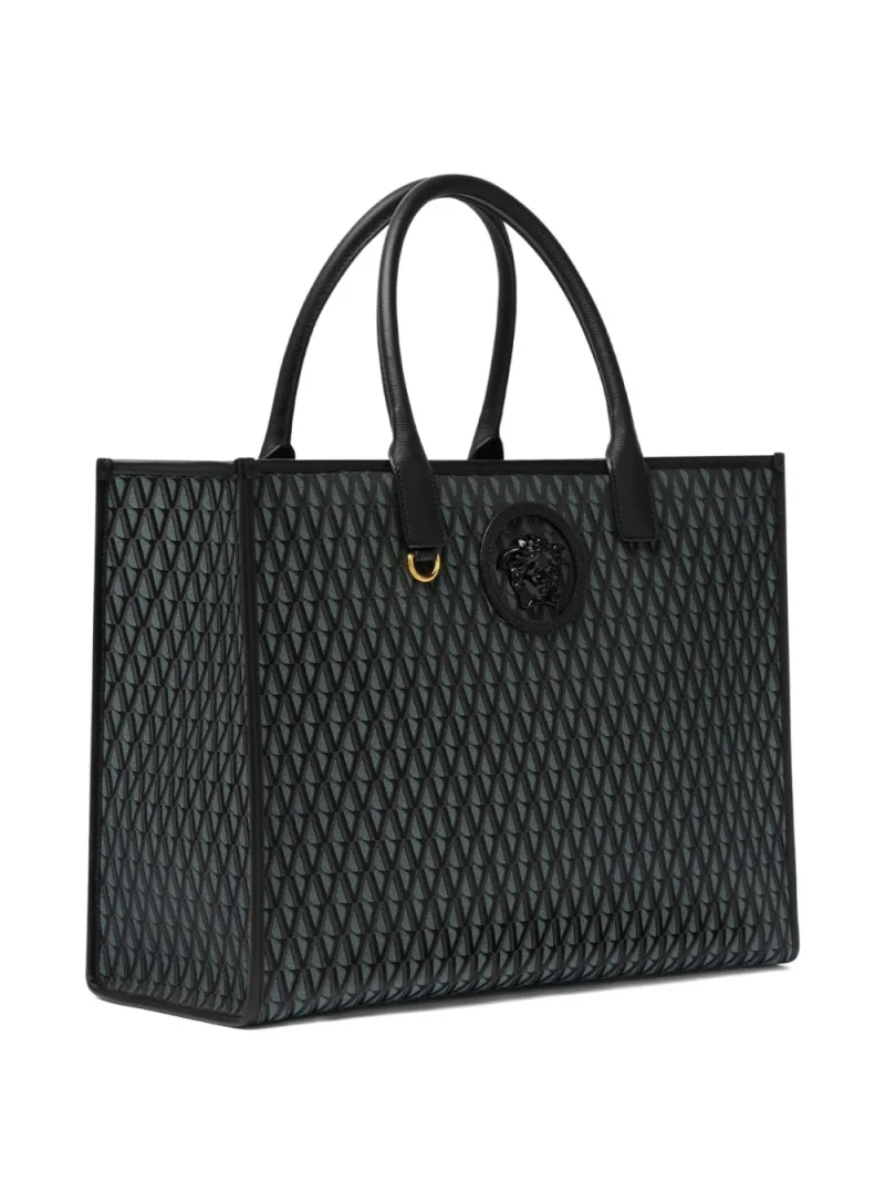 Geanta Versace monogram tote negru, doua manere superioare, inchidere cu capsa, buzunar interior cu inchidere fermoara, logo pe partea din fata. 100% piele