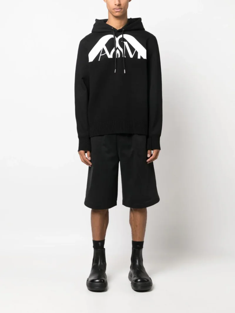 Hanorac negru din bumbac si lana, cu gluga si snur, maneci lungi, emblema AMQ Seal imprimata pe partea din fata, deisgn din panouri cu aparente diferite si tiv drept. Potrivit pentru sezonul toamna/iarna. 50% bumbac; 50% lana.