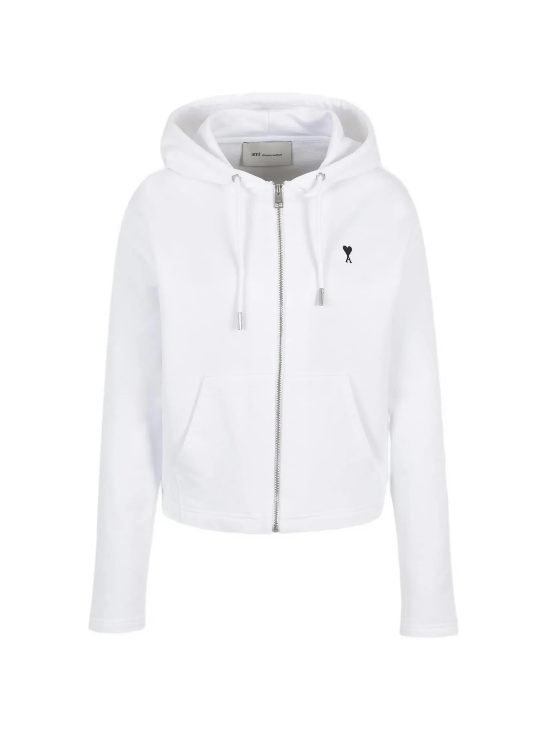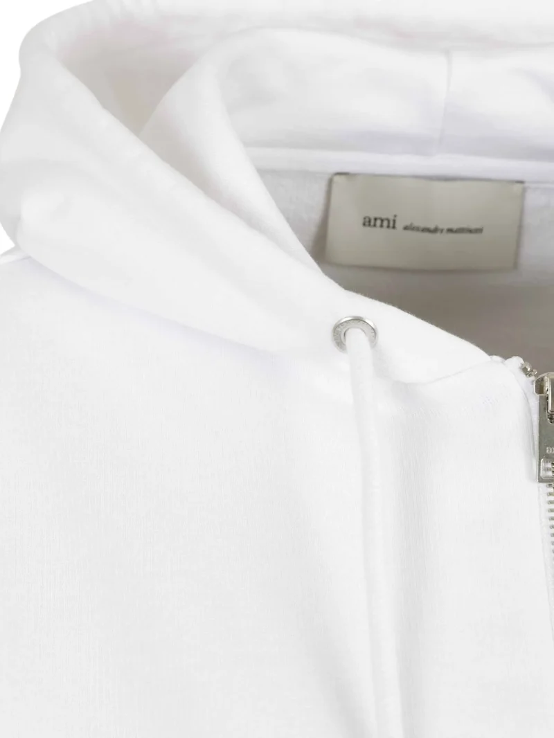 Hanorac AMI Paris zip embroidered alb, cu gluga cu snur reglabil, inchidere frontala cu fermoar, maneci lungi, logo brodat si buzunar frontal tip marsupiu. 100% bumbac