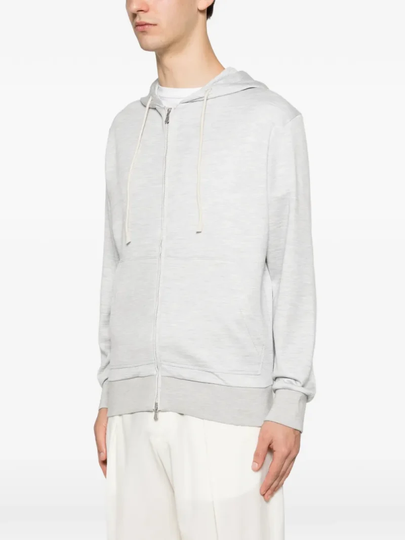 Hanorac Eleventy Zip-Fastening gri, realizat din mix de materiale, cu gluga, inchidere cu fermoar bidirectional si snur, maneci lungi, mansete elastice, buzunare laterale si terminatii ribbed. Potrivit pentru sezonul primavara/vara. 57% matase; 34% bumbac; 9% poliamida.