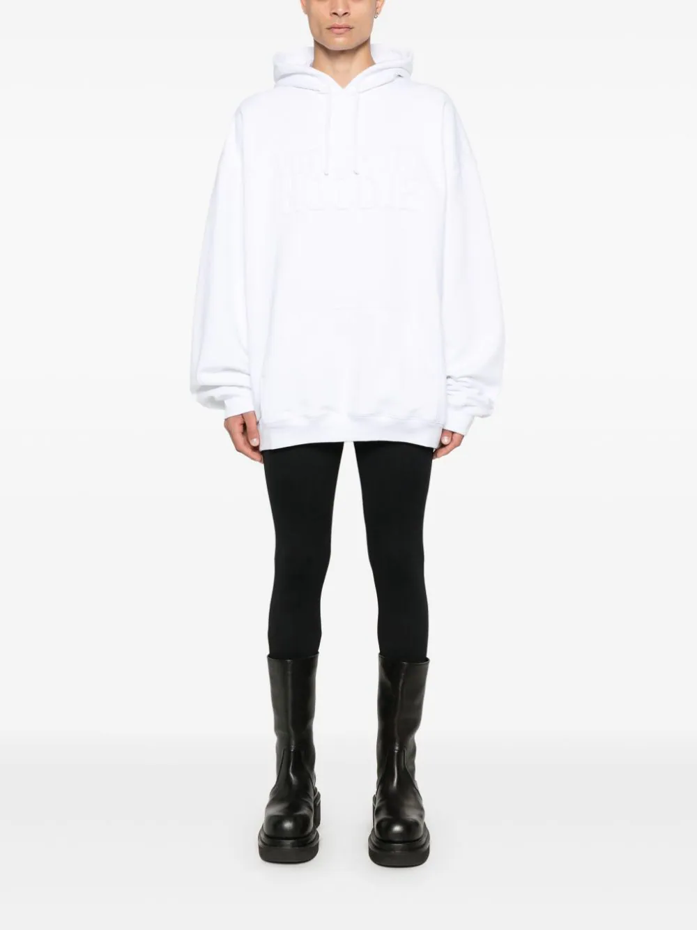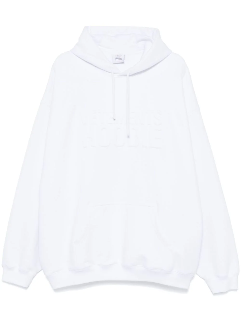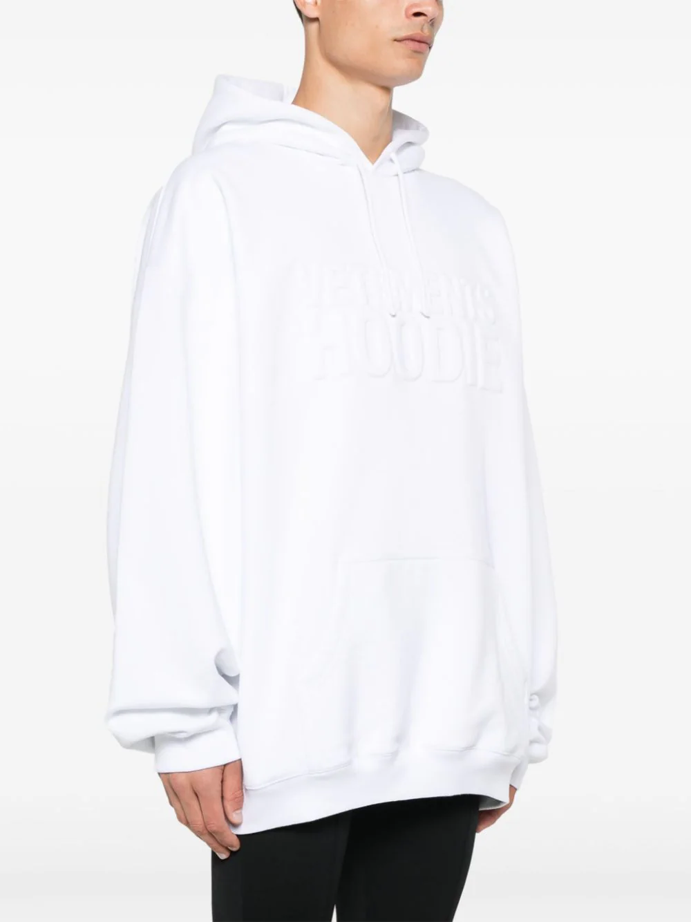 Hanorac VETEMENTS Logo-Embossed alb, din bumbac, oversized fit, cu gluga si snur, umeri cazuti, maneci lungi, mansete elastice, logo in relief pe partea din fata, logo brodat pe gluga, buzunar aplicat si tiv drept. Potrivit pentru sezonul toamna/iarna. 80% bumbac; 20% poliester; 100% bumbac.