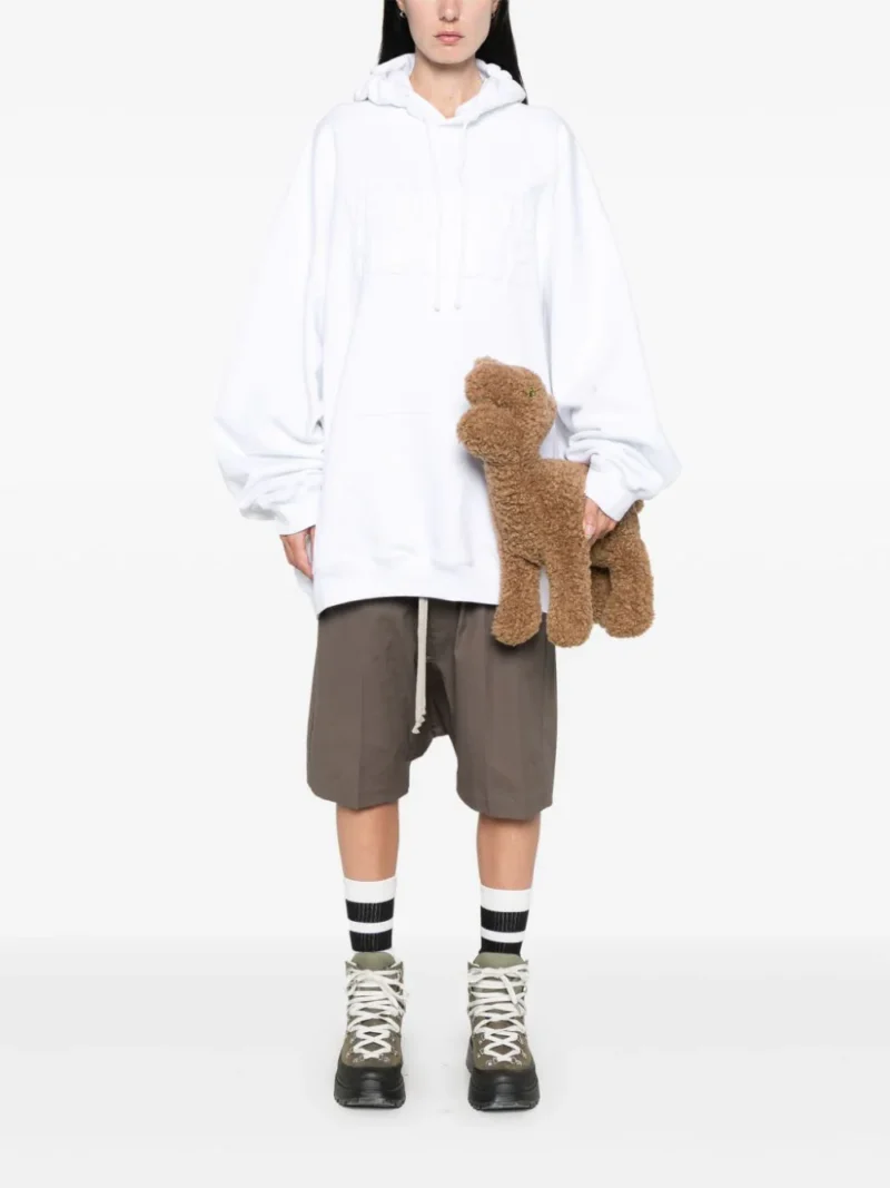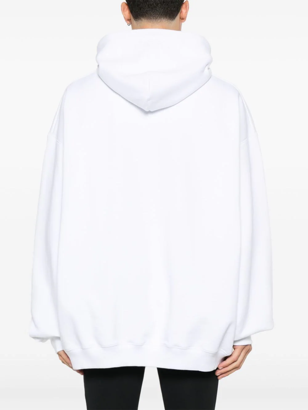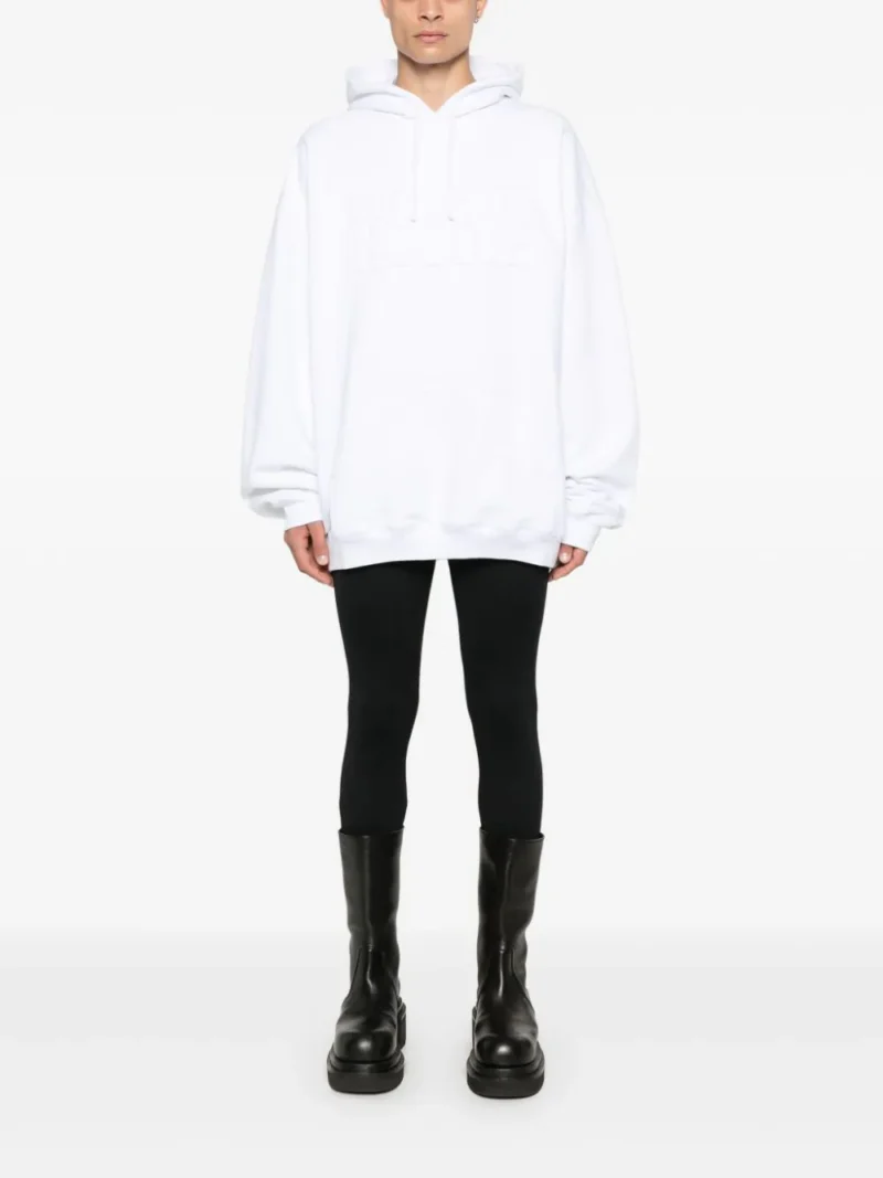 Hanorac VETEMENTS Logo-Embossed alb, din bumbac, oversized fit, cu gluga si snur, umeri cazuti, maneci lungi, mansete elastice, logo in relief pe partea din fata, logo brodat pe gluga, buzunar aplicat si tiv drept. Potrivit pentru sezonul toamna/iarna. 80% bumbac; 20% poliester; 100% bumbac.