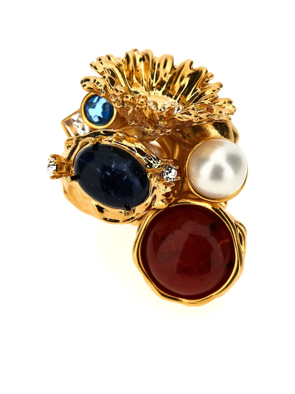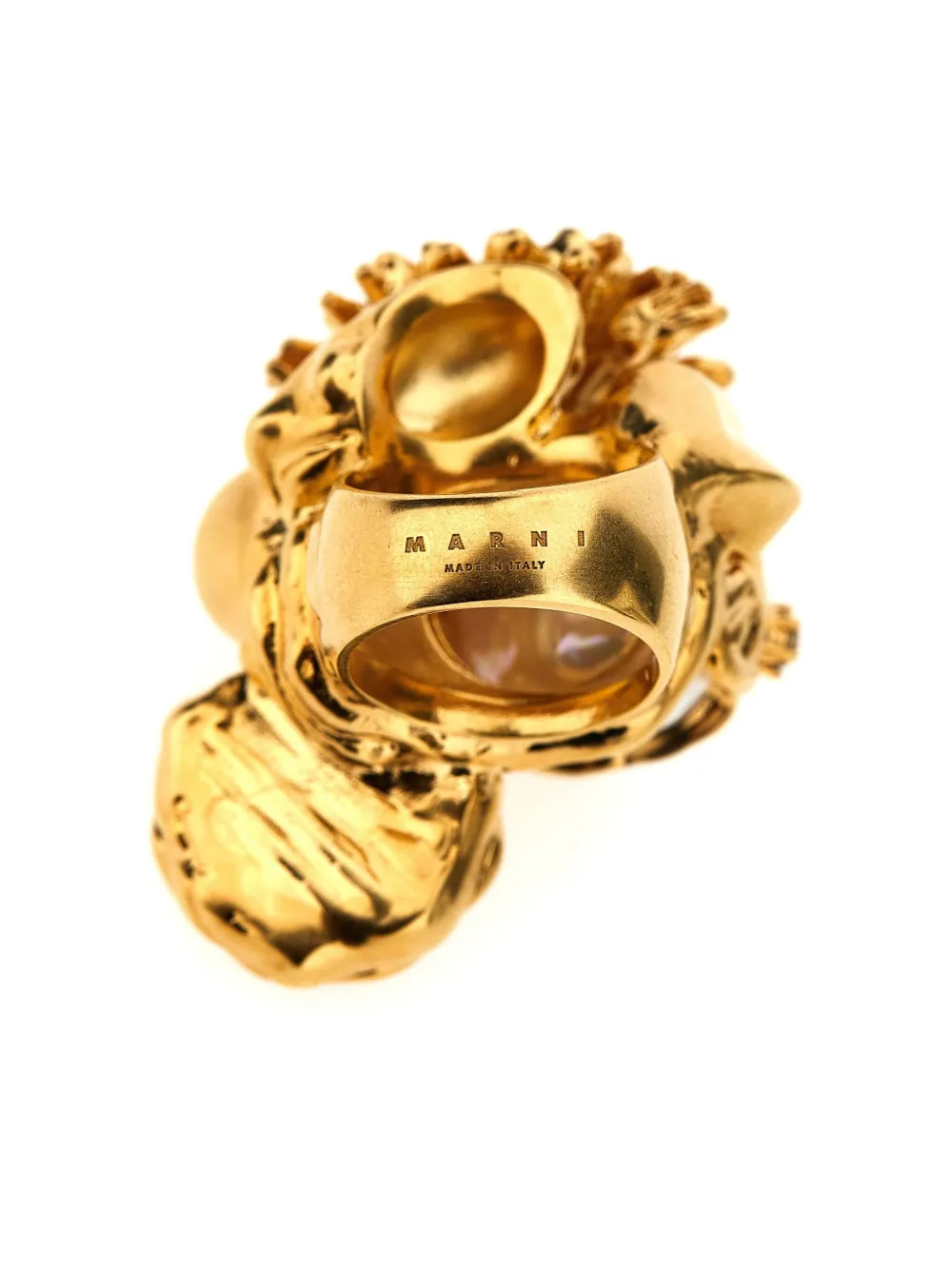 Inel Marni Multilayer auriu, din alama, design art-deco, cu cristale sclipitoare incrustate, perla si pietre decortive si logo Marni gravat. 100% alama.