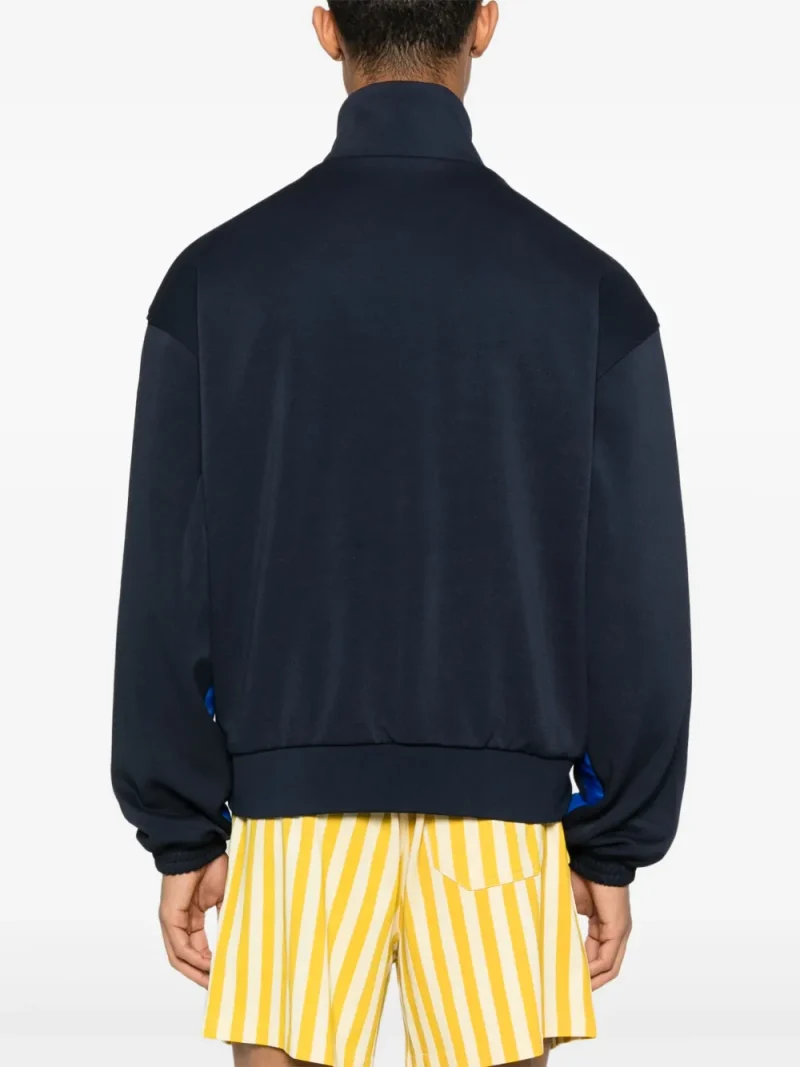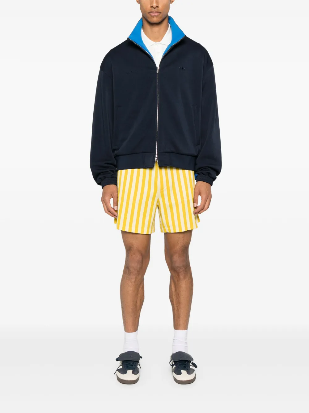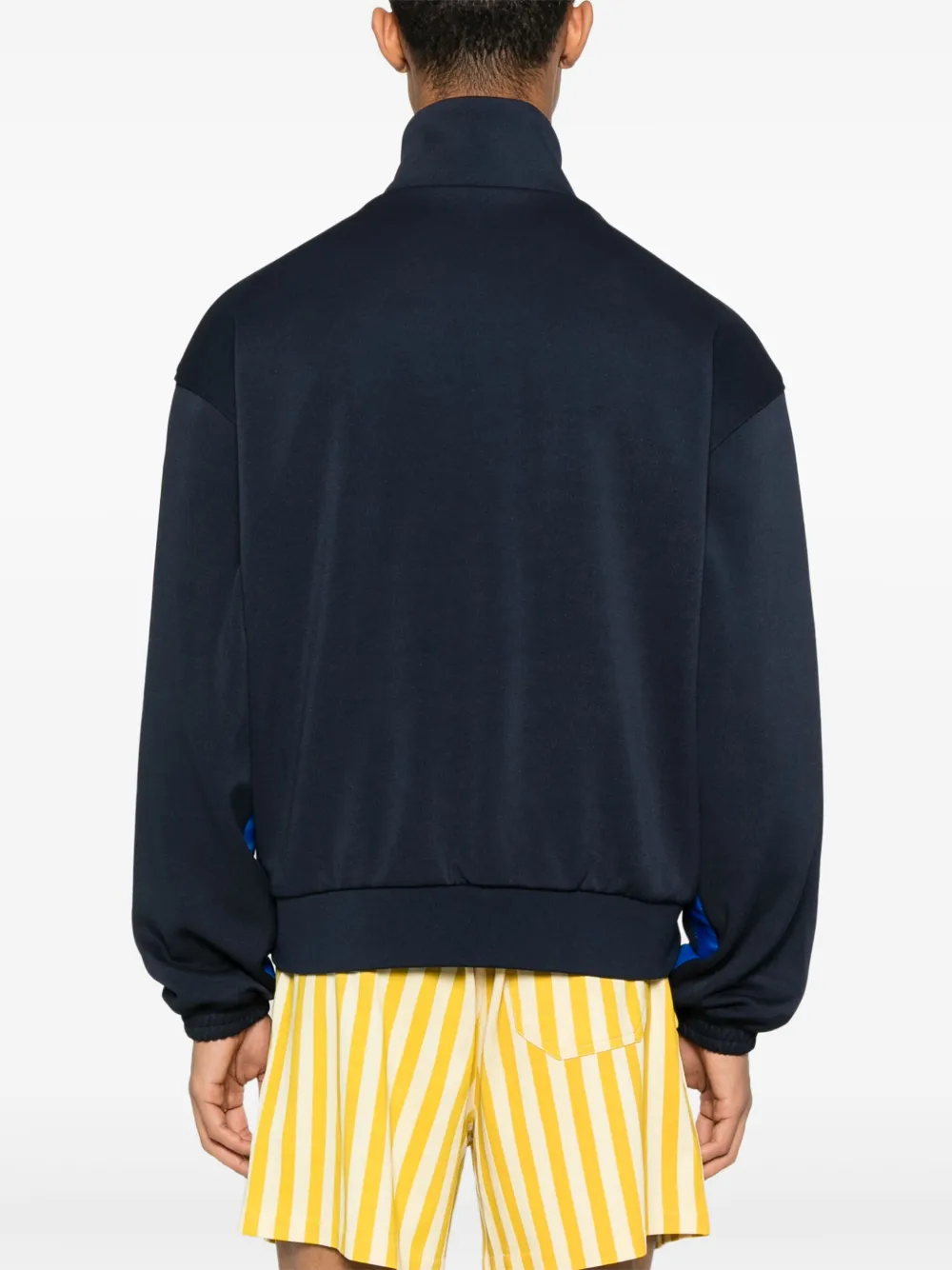 Jacheta Adidas x Wales Bonner Trefoil-Logo bleumarin, cu guler inalt, inchidere cu fermoar frontal bidirectional, maneci lungi, mansete elastice, buzunare laterale, detaii cobtrastante si logo brodat. Potrivit pentru sezonul toamna/iarna. 96% poliester; 4% elastan.