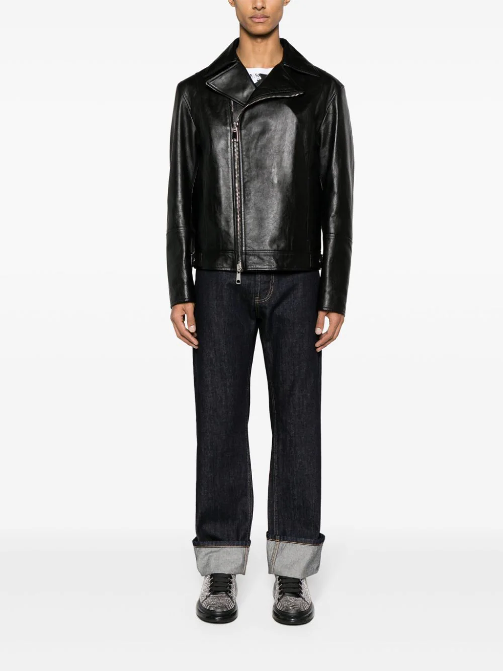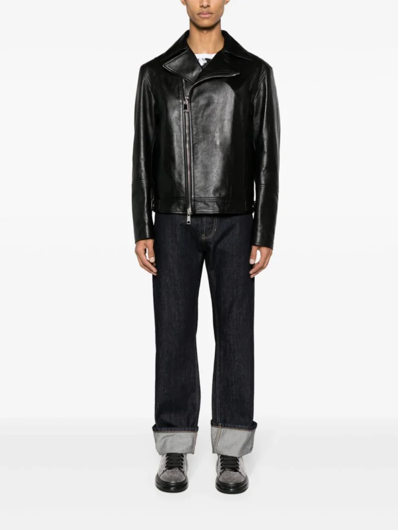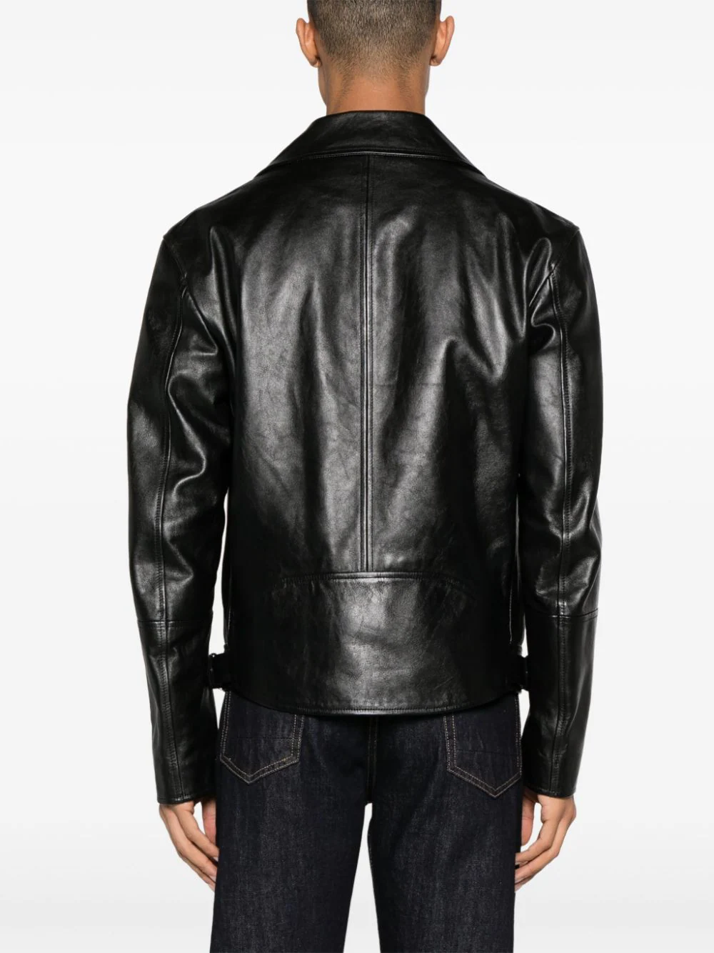 Jacheta neagra din piele de vitel, tip biker, cu rever, inchidere asimetrica cu fermoar, maneci lungi, buzunare laterale, captuseala din viscoza si tiv drept. Potrivita pentru sezonul primavara/vara. 100% piele de vitel; 100% viscoza.
