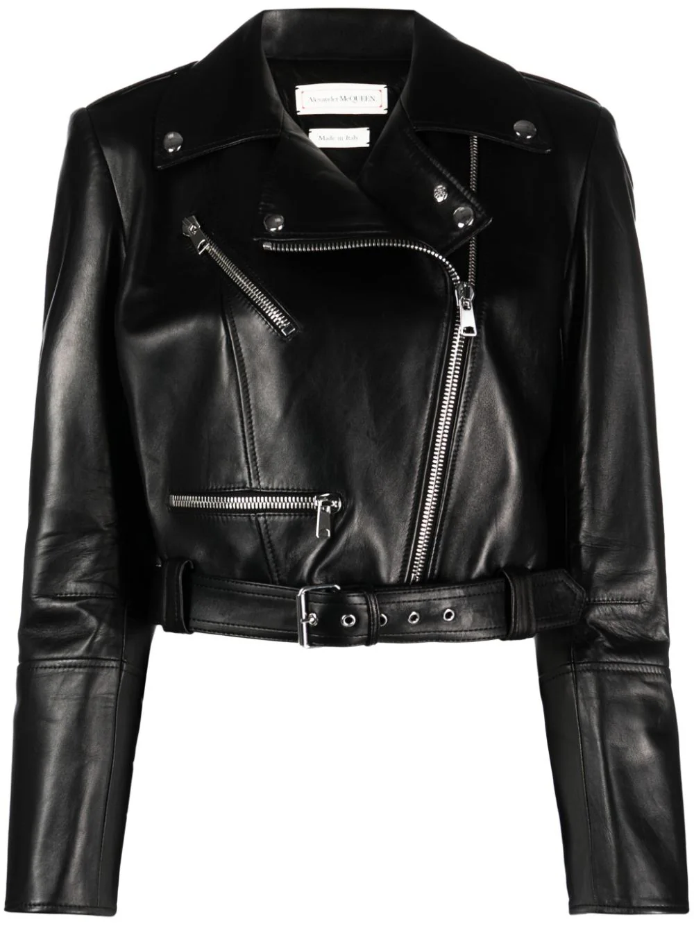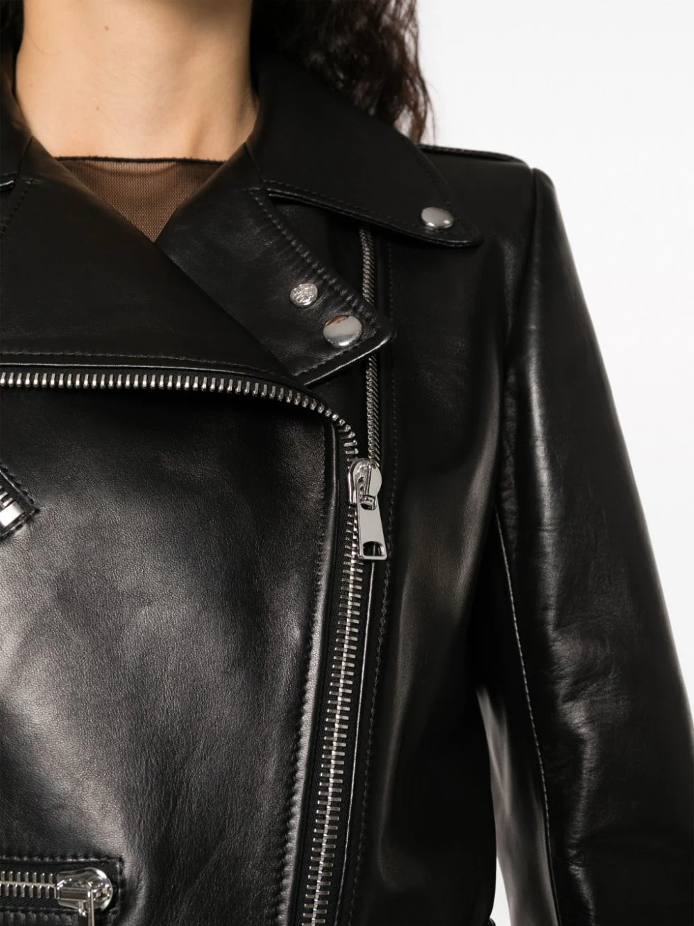 Jacheta neagra din piele de vitel, tip biker, cu rever lat crestat, inchidere asimetrica cu fermoar, maneci lungi, mansete cu fermoar. buzunare laterale, curea in jurul taliei si tiv drept. Potrivita pentru sezonul toamna/iarna. 100% piele de vitel.