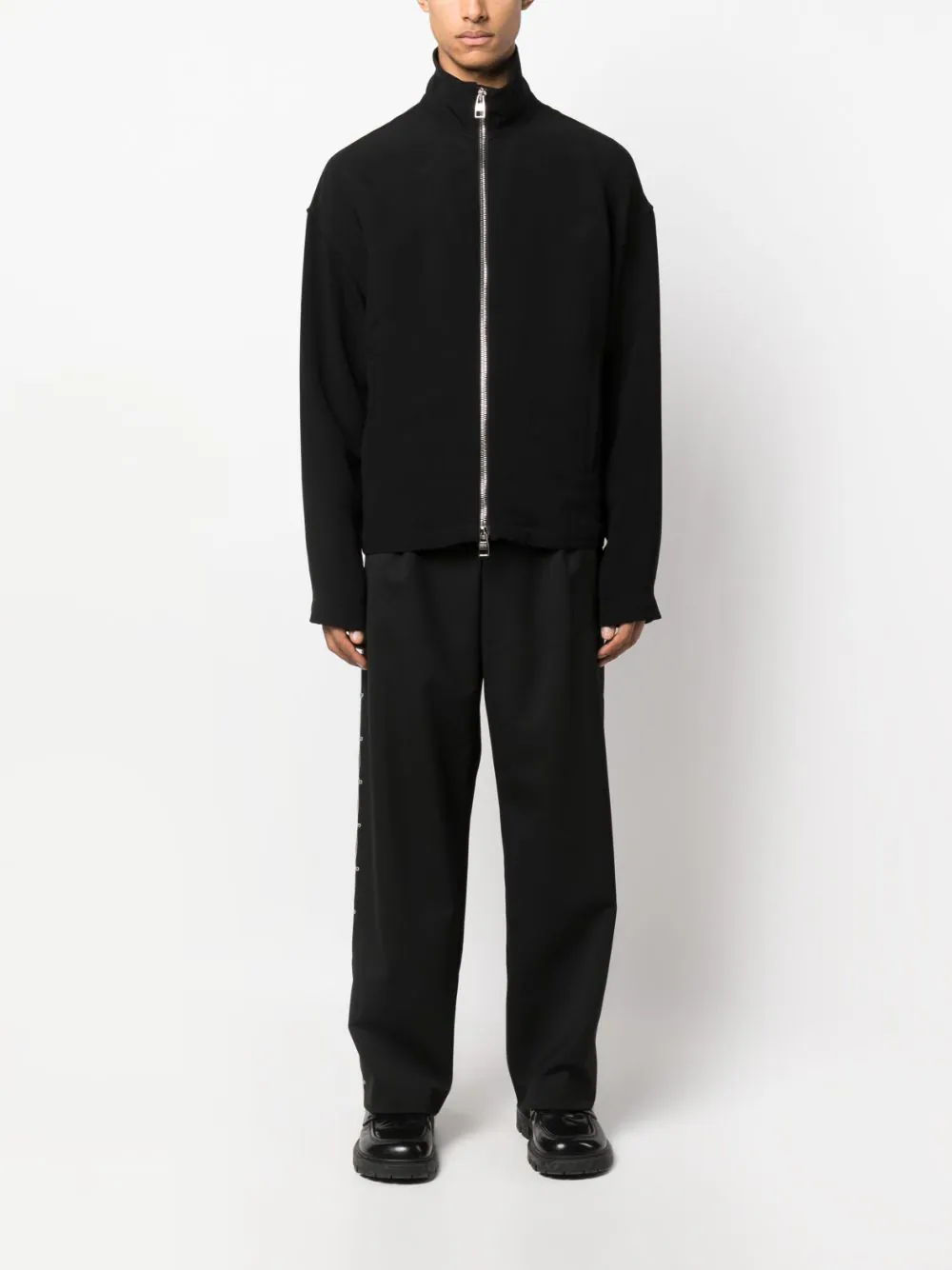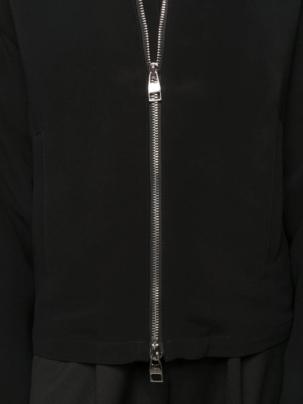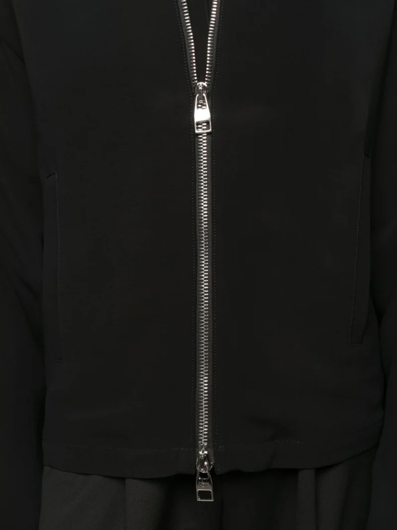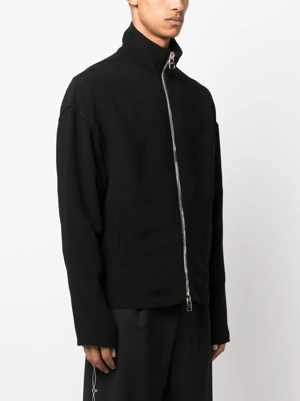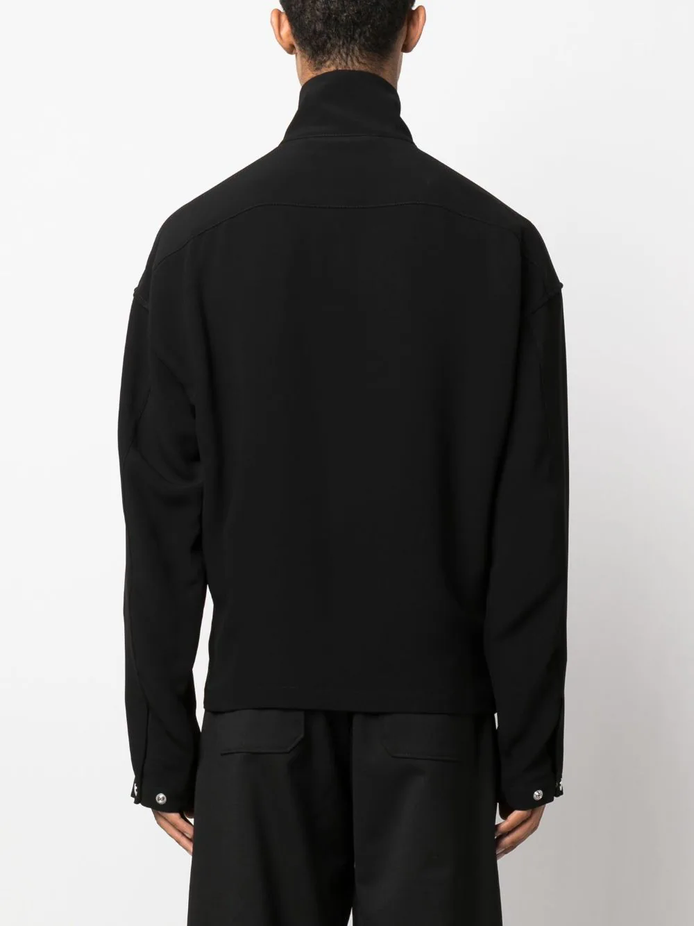 Jacheta neagra din viscoza, cu guler inalt, inchidere fermoar dublu, umeri cazuti, maneci lungi, mansete cu capse, buzunare laterale, captuseala din bumbac si tiv drept. potrivita pentru sezonul toamna/iarna. 100% viscoza; 100% bumbac.