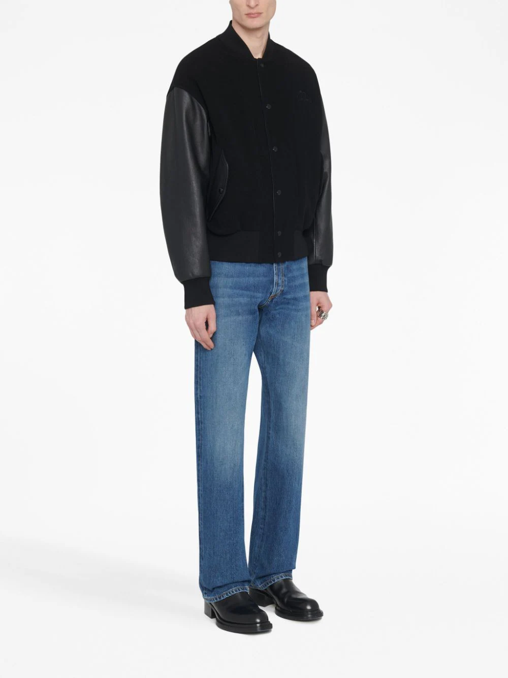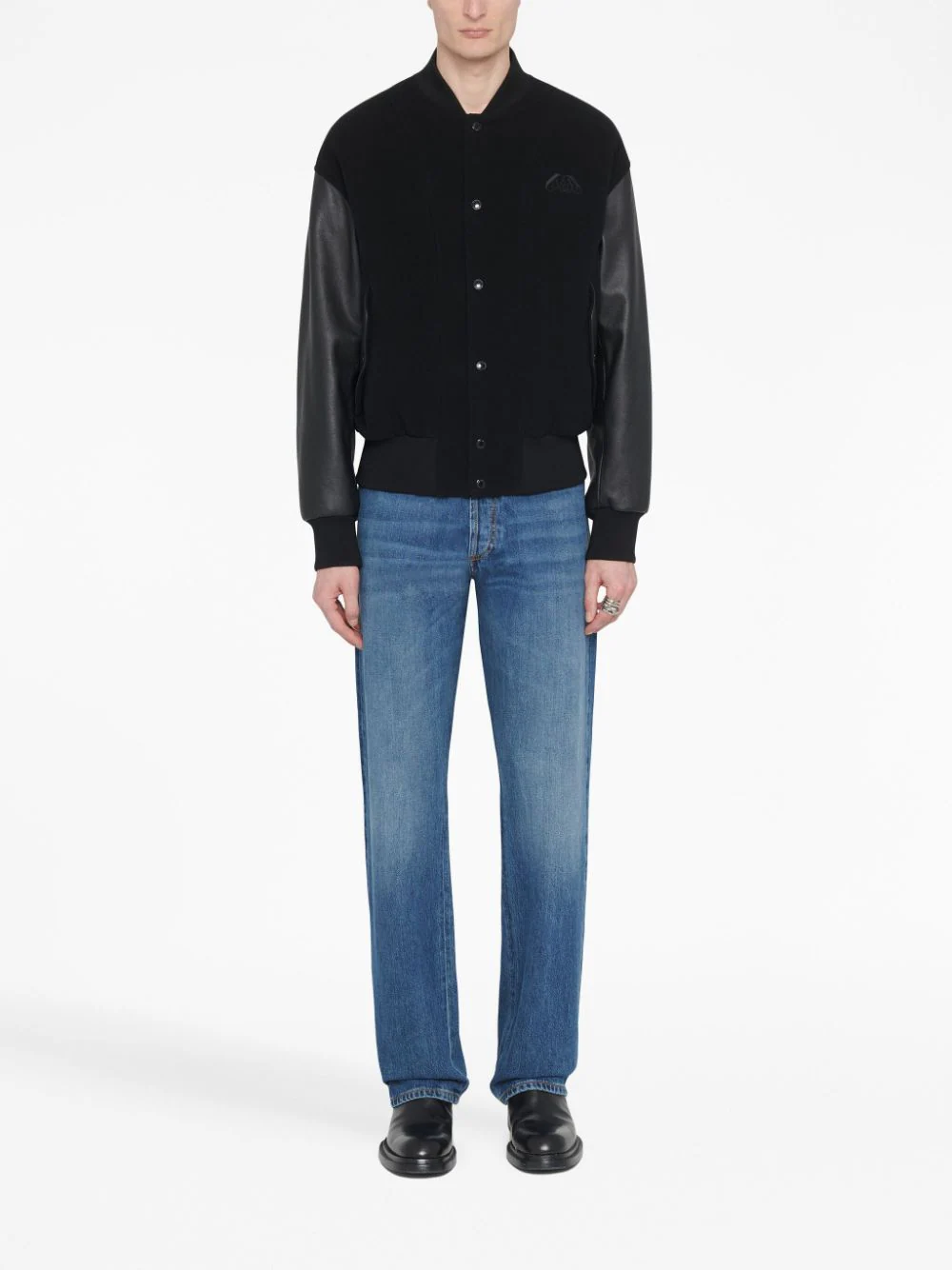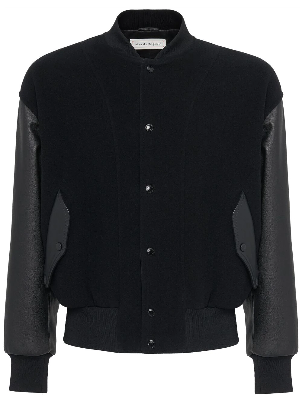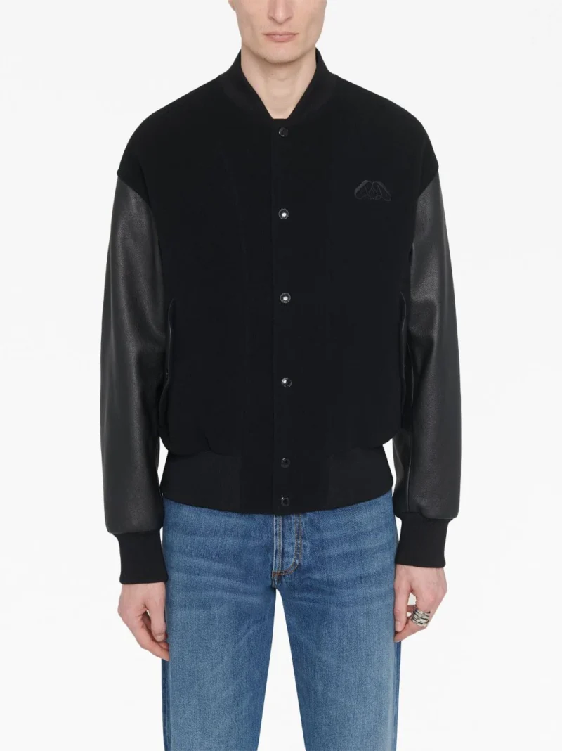 Jacheta neagra din poliamida, tip bomber, cu guler baseball, inchidere cu capse, maneci lungi din piele, mansete elastice, emblema AMQ Seal aplicata pe ambele parti, buzunare laterale si tiv elastic drept. potrivita pentru sezonul toamna/iarna. 100% piele de vitel; 100% poliamida.