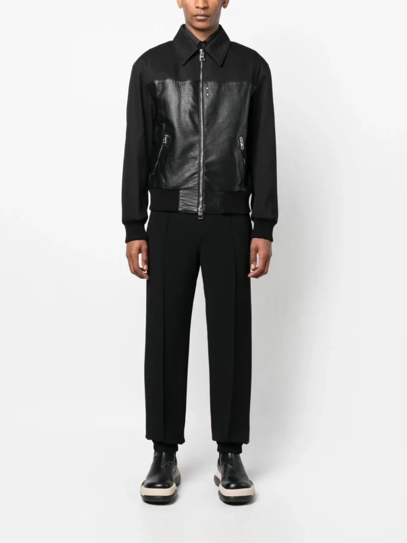 Jacheta neagra din piele de miel si textil, tip bomber, cu guler clasic, inchidere fermoar dublu, maneci lungi, mansete elastice, design din panouri, buzunare laterale, buzunar ascuns pe partea din fata, captuseala din cupro si tiv drept. Potrivita pentru sezonul toamna/iarna. 100% piele de miel; 100% textil; 100% cupro.