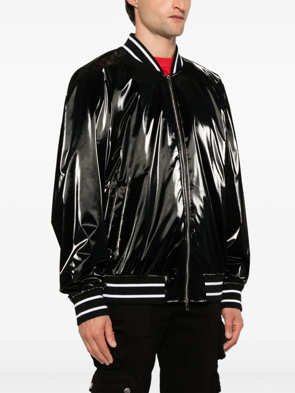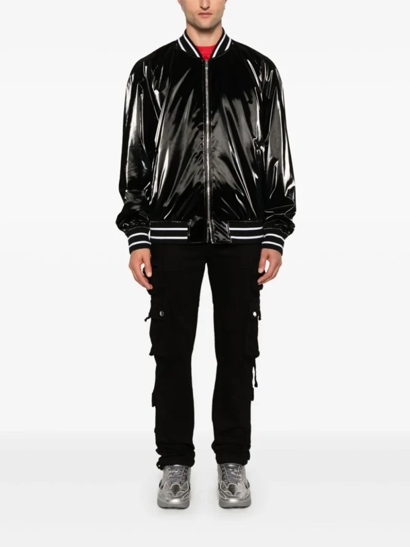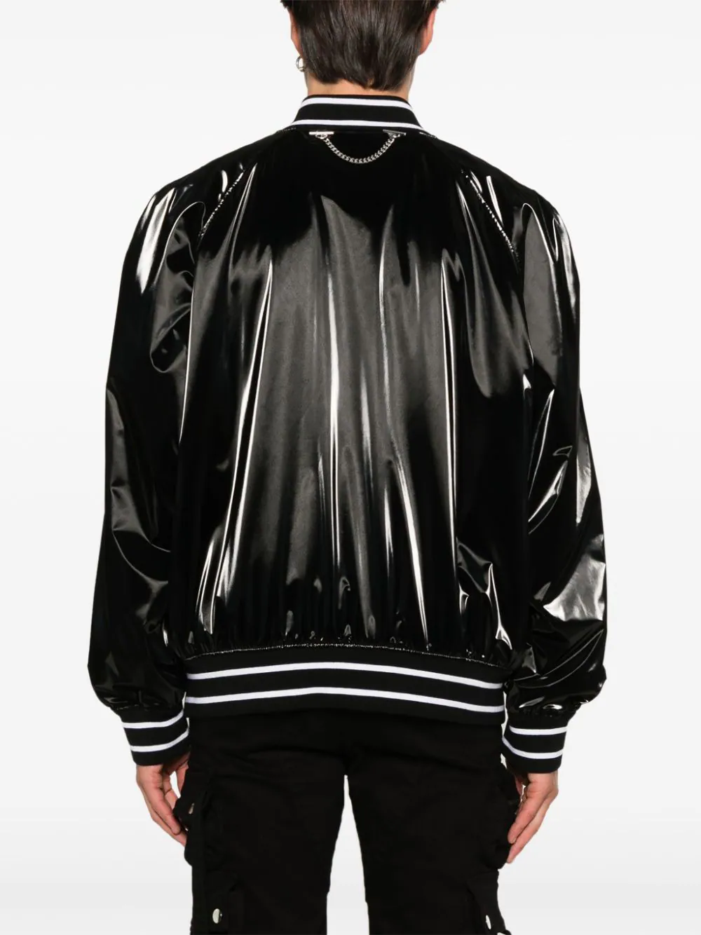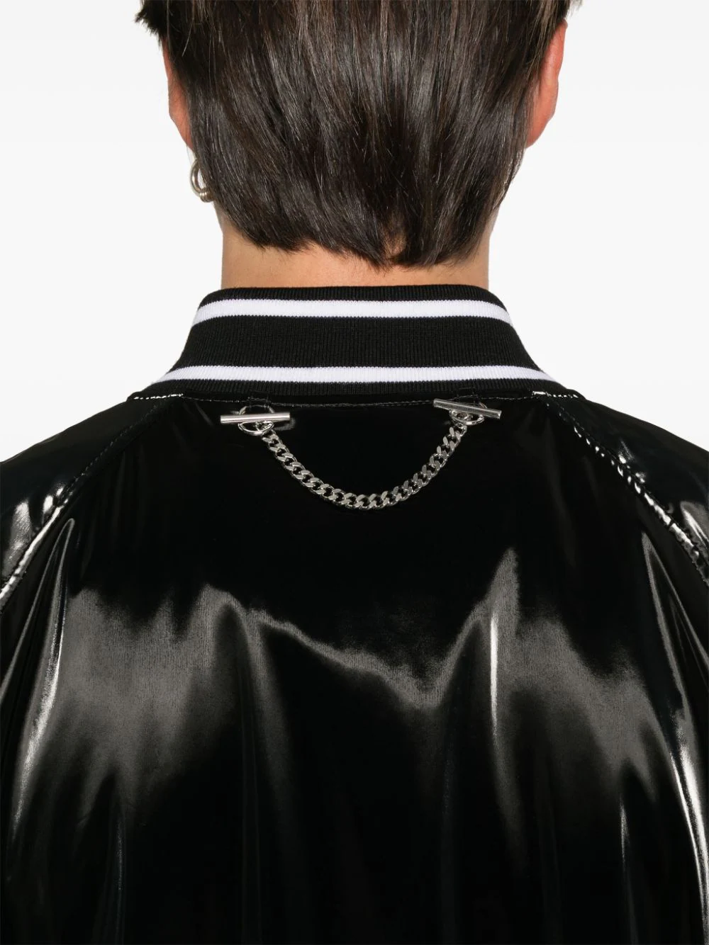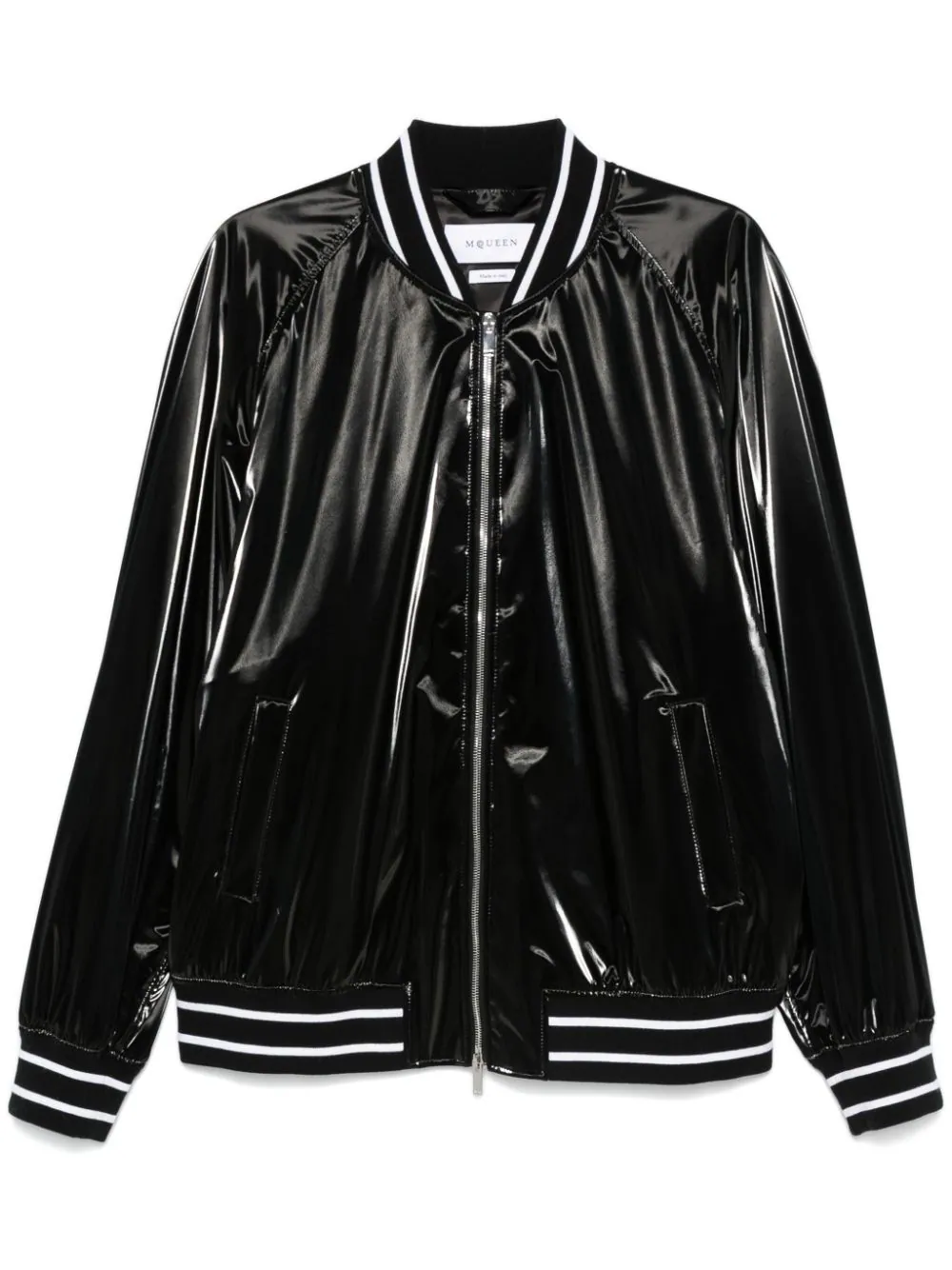 Jacheta Alexander McQueen Striped-Trim Bomber negru, tip bomber, din poliester lucios, cu guler tip baseball, inchiderec cu fermoar dublu, maneci lungi, mansete elastice tip ribbed cu dungi contrastante, buzunare laterale, decoratiune AMQ cu zale pe partea din spate si tiv elastic drept. Potrivita pentru sezonul toamna/iarna. 100% poliester.