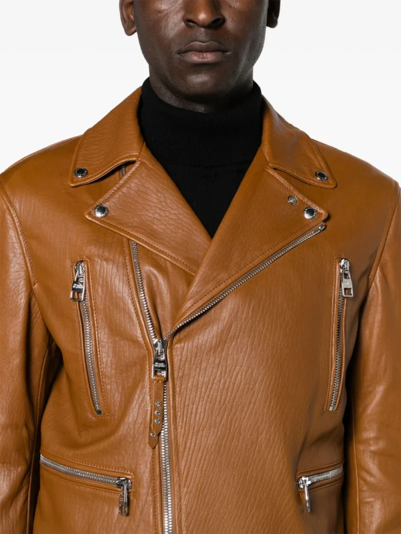 Jacheta maro din piele de miel, tip biker, cu design din panouri, rever crestat, inchidere cu fermoar dublu pe laterala, maneci lungi, patru buzunare pe partea din fata cu inchidere fermoar, captuseala din bumbac satinat si tiv drept. Potrivita pentru sezonul de toamna/iarna. 100% bumbac; 100% viscoza; 95% poliester; 5% poliamida; 100% piele de miel.