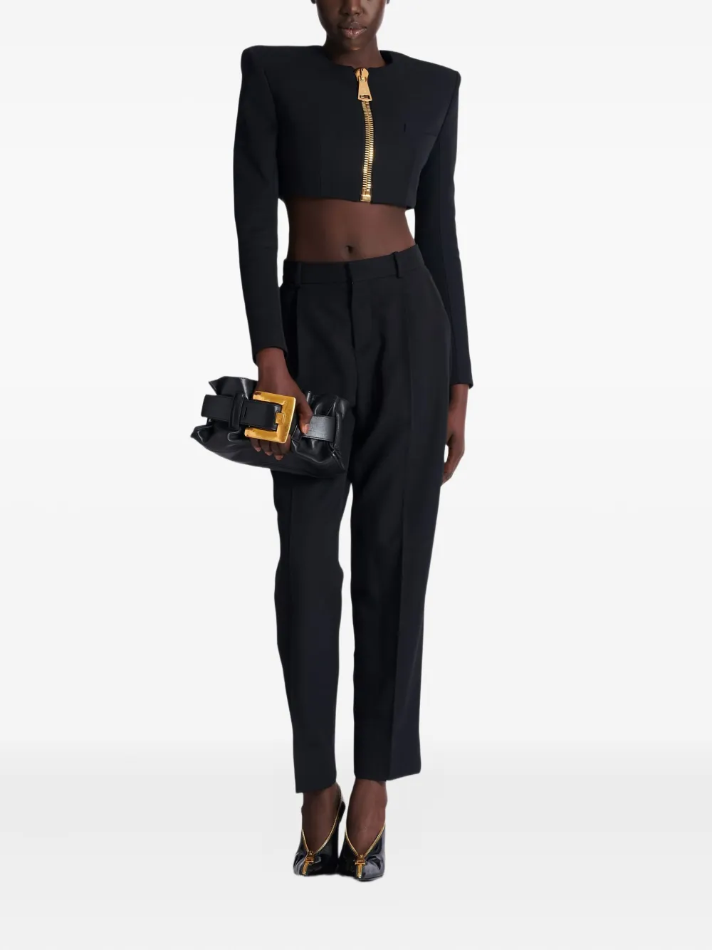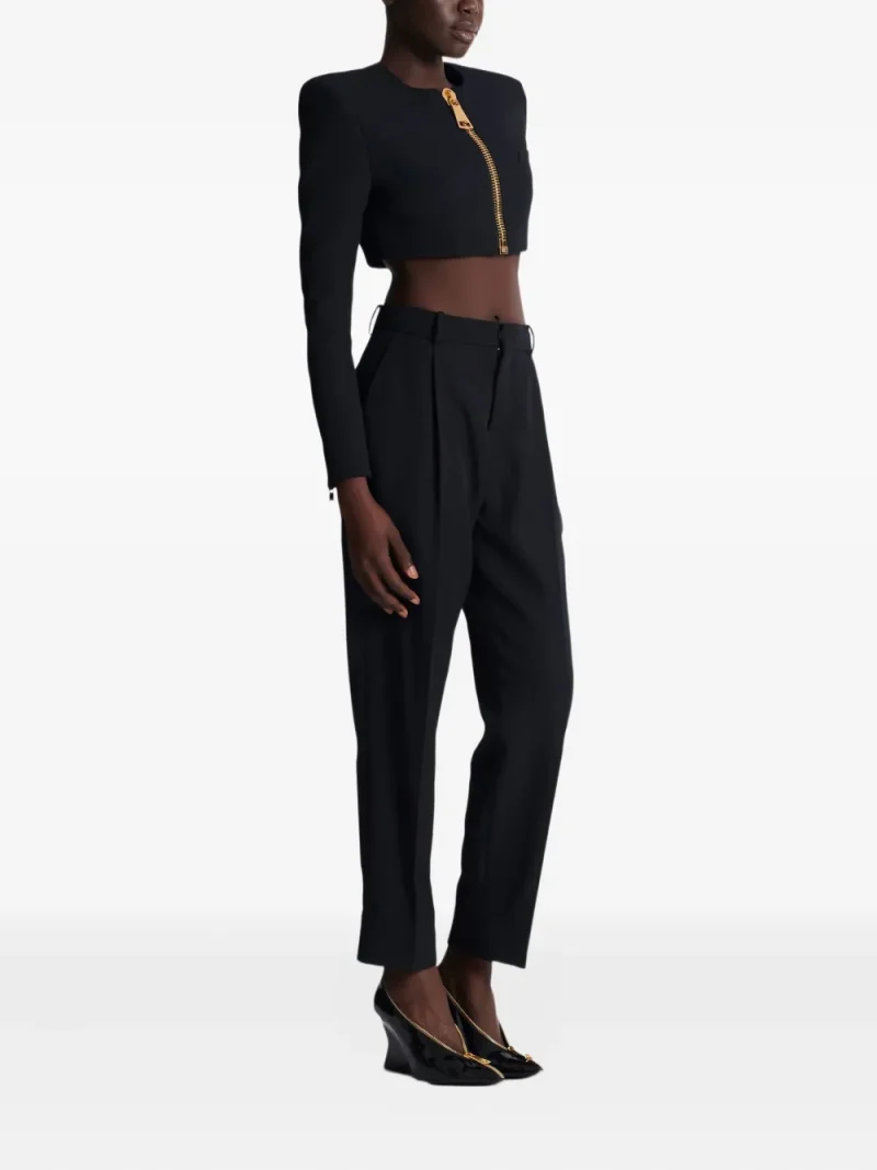 Jacheta Balmain padded-shoulder zip-front negru, inchidere centrala cu fermoar, maneci lungi, mansete cu fermoar, buzunar la piept.100% lana