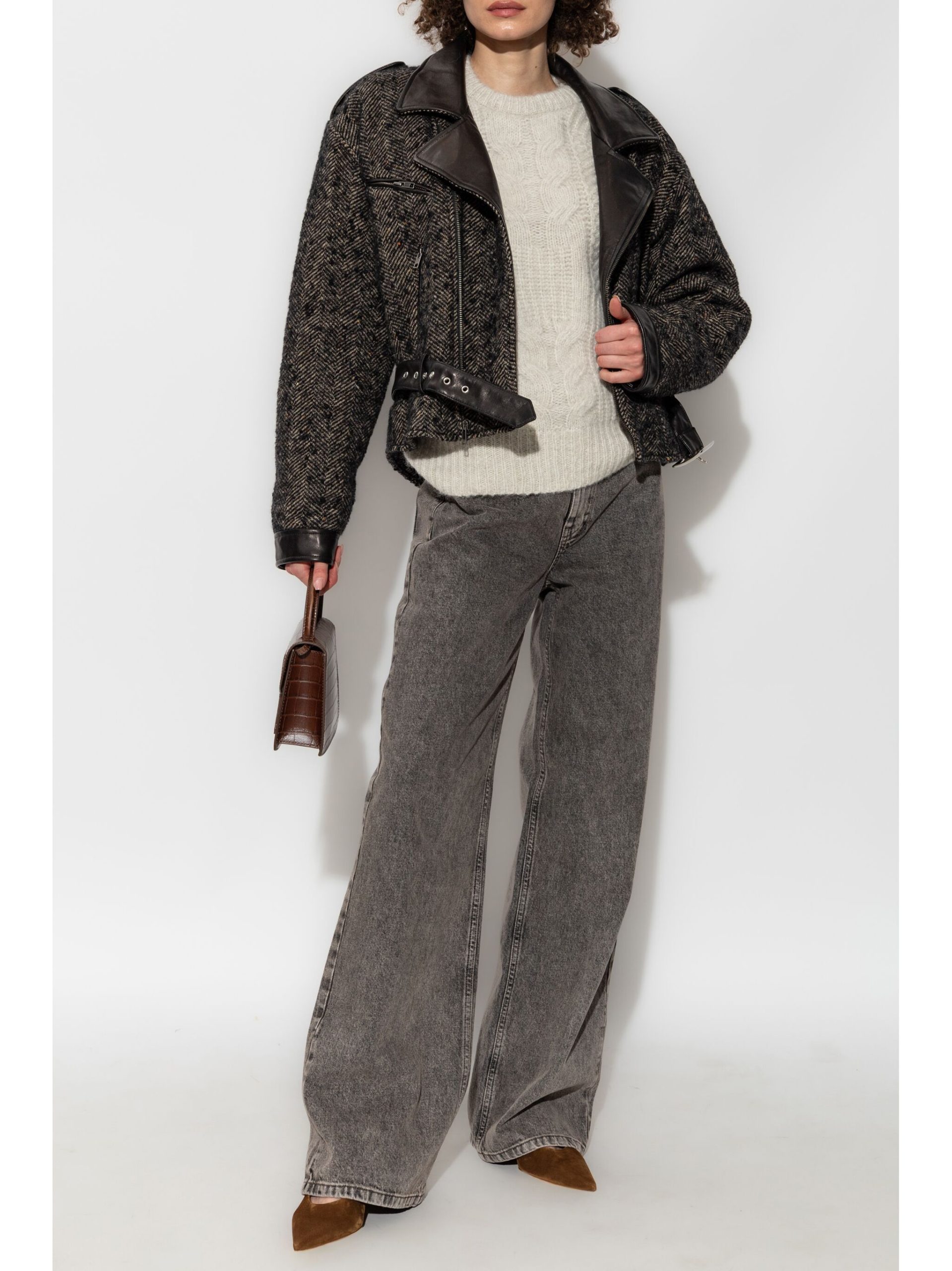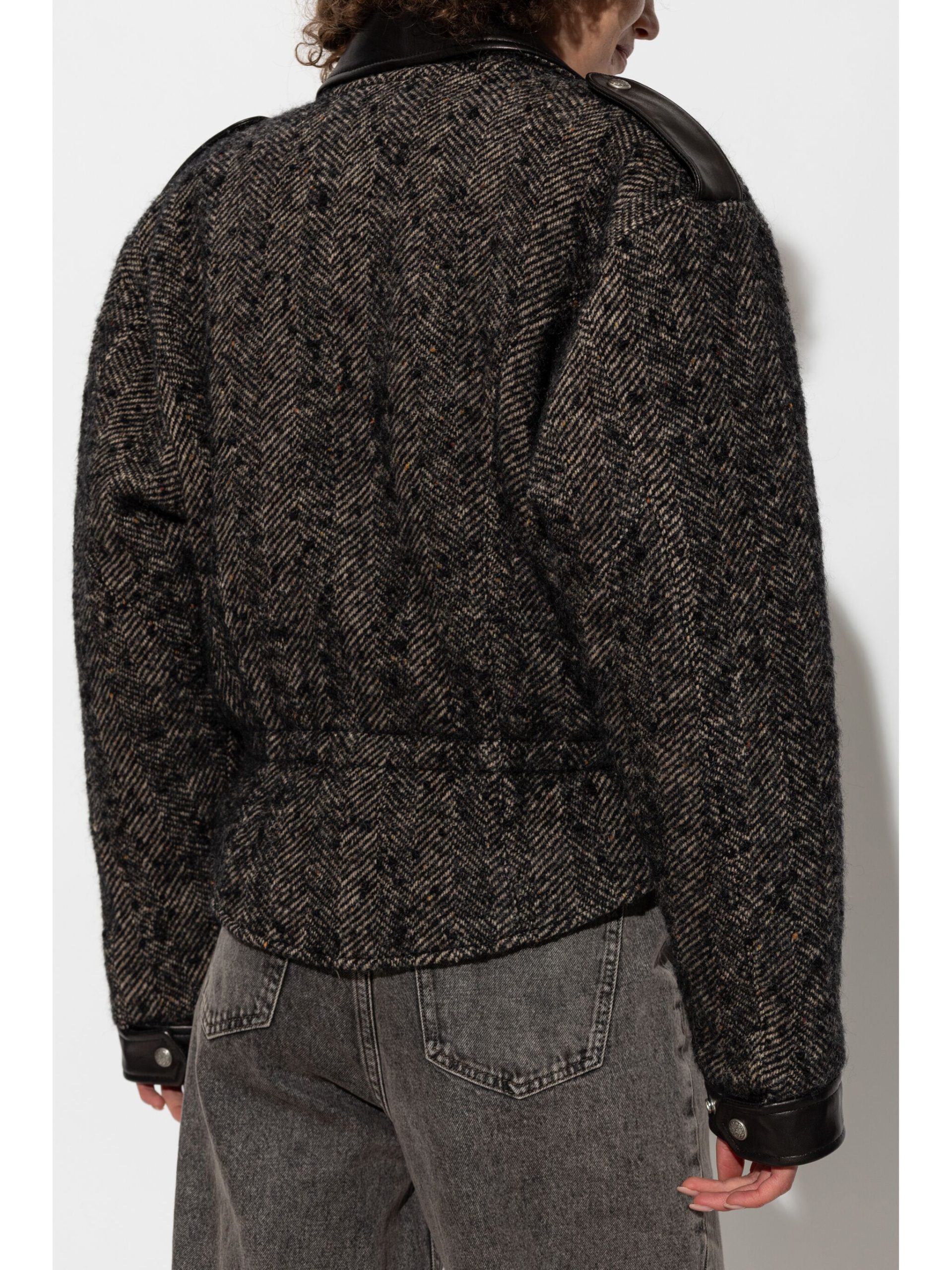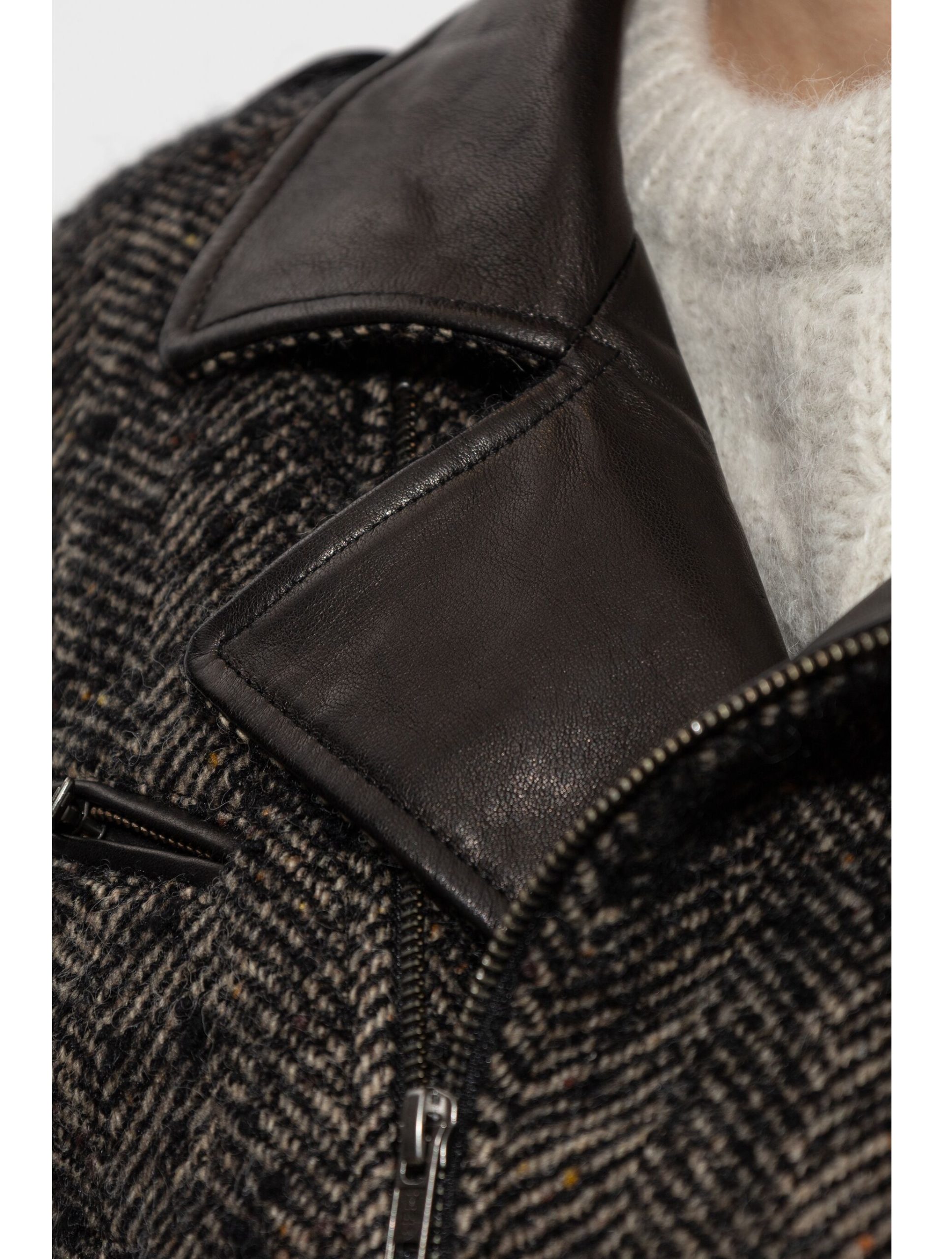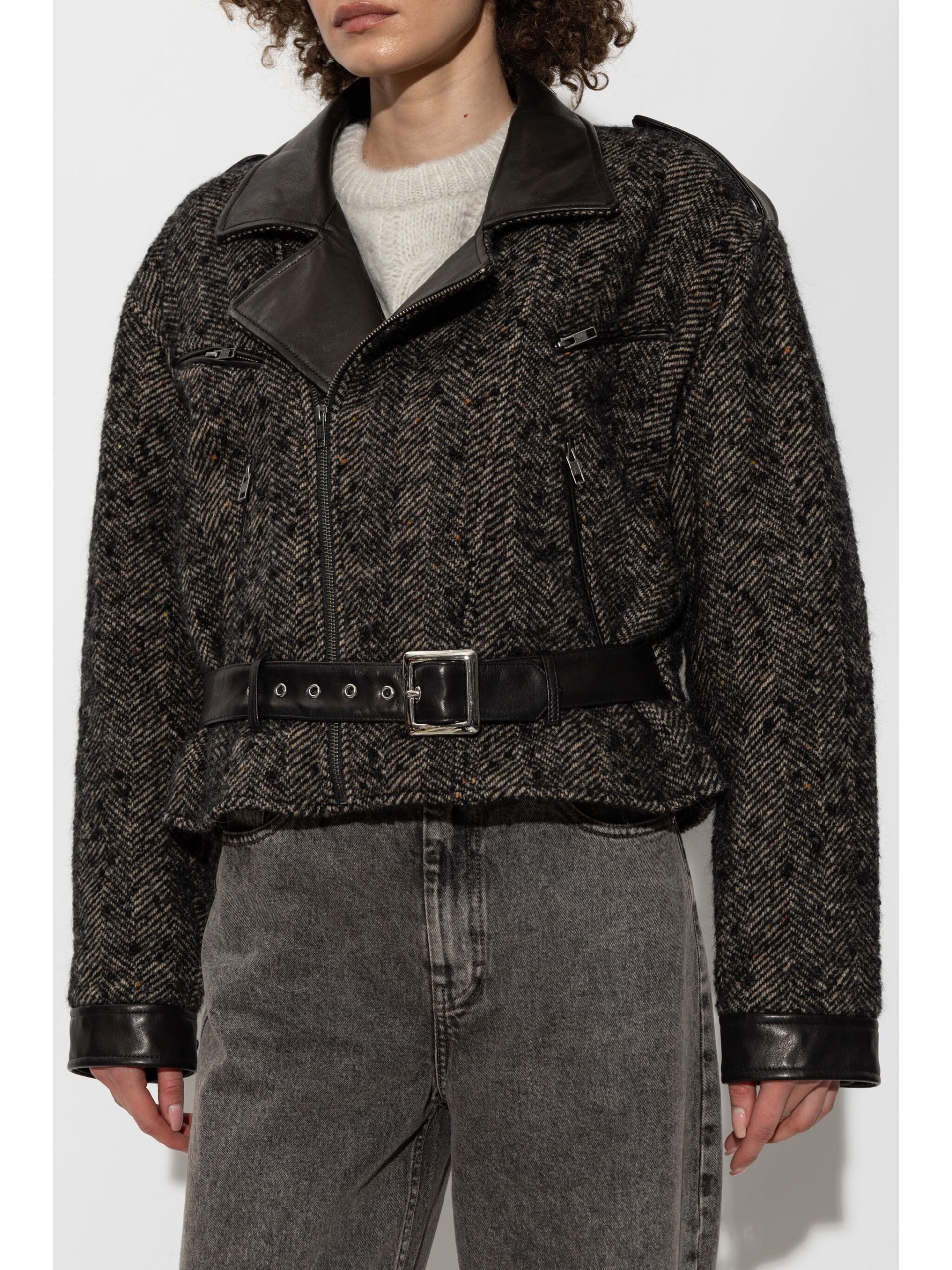 Jacheta biker R13 herringbone-pattern neagra, inchidere cu fermoar, revere crestate, buzunare la piept cu fermoar, brau in talie si tiv drept. 71% lana 19% nylon 7% mohair 3% poliester