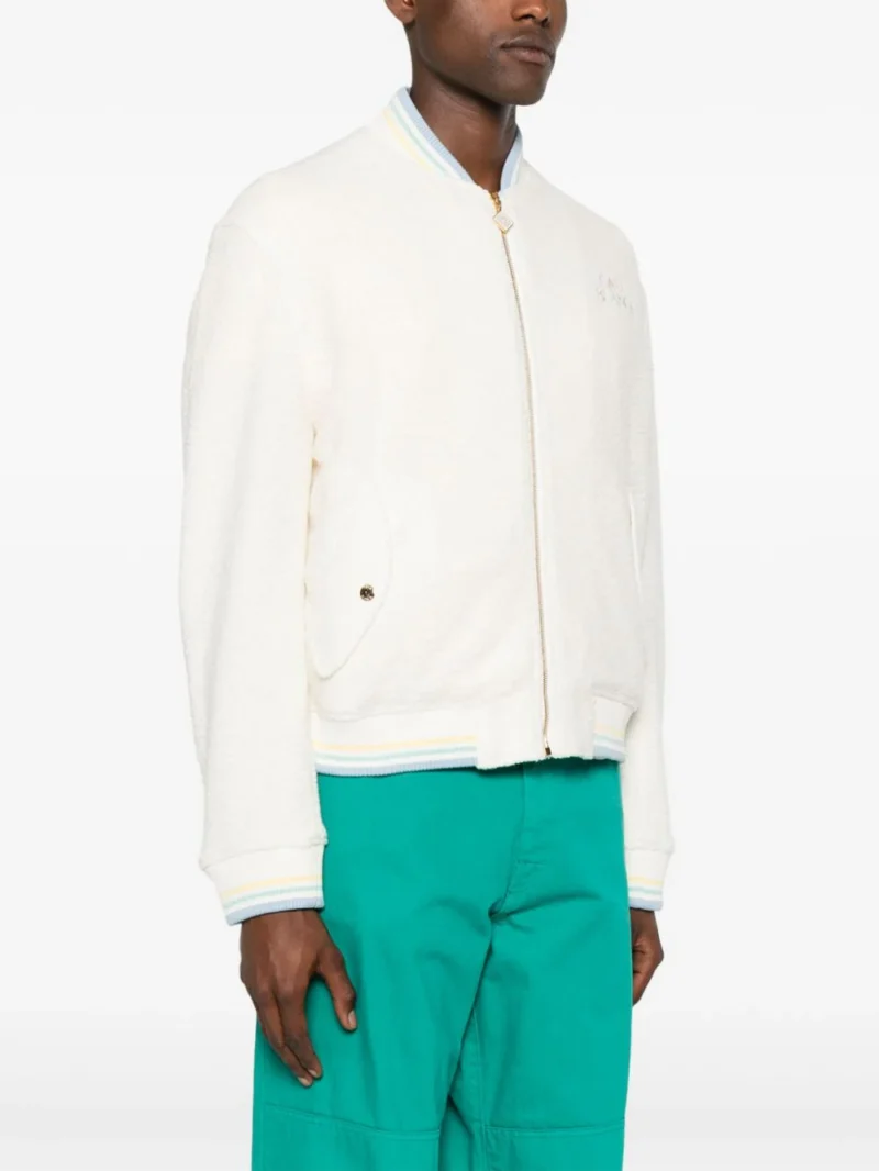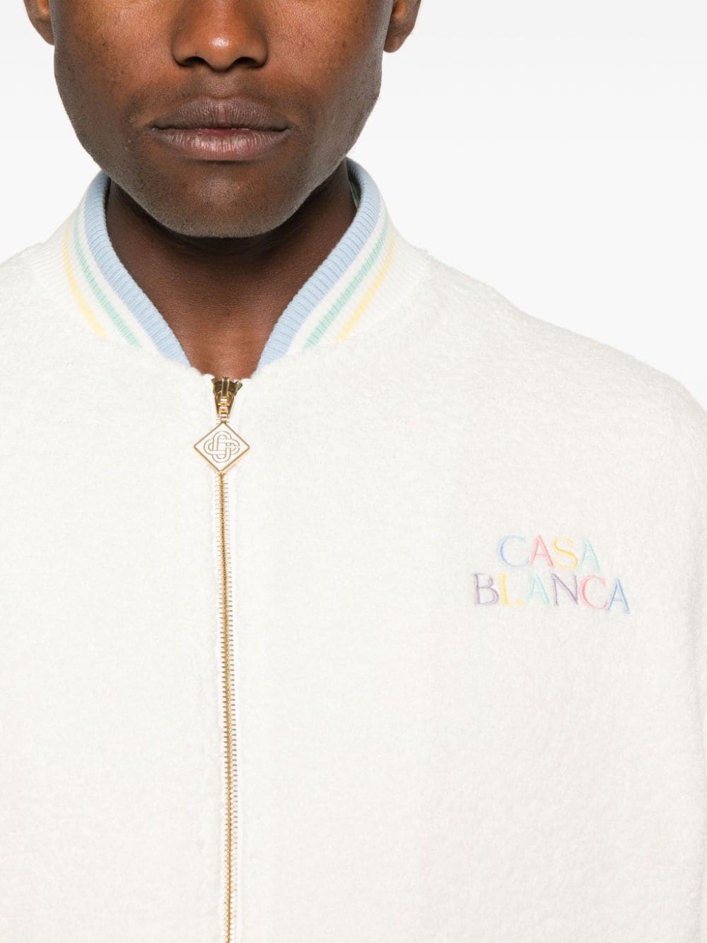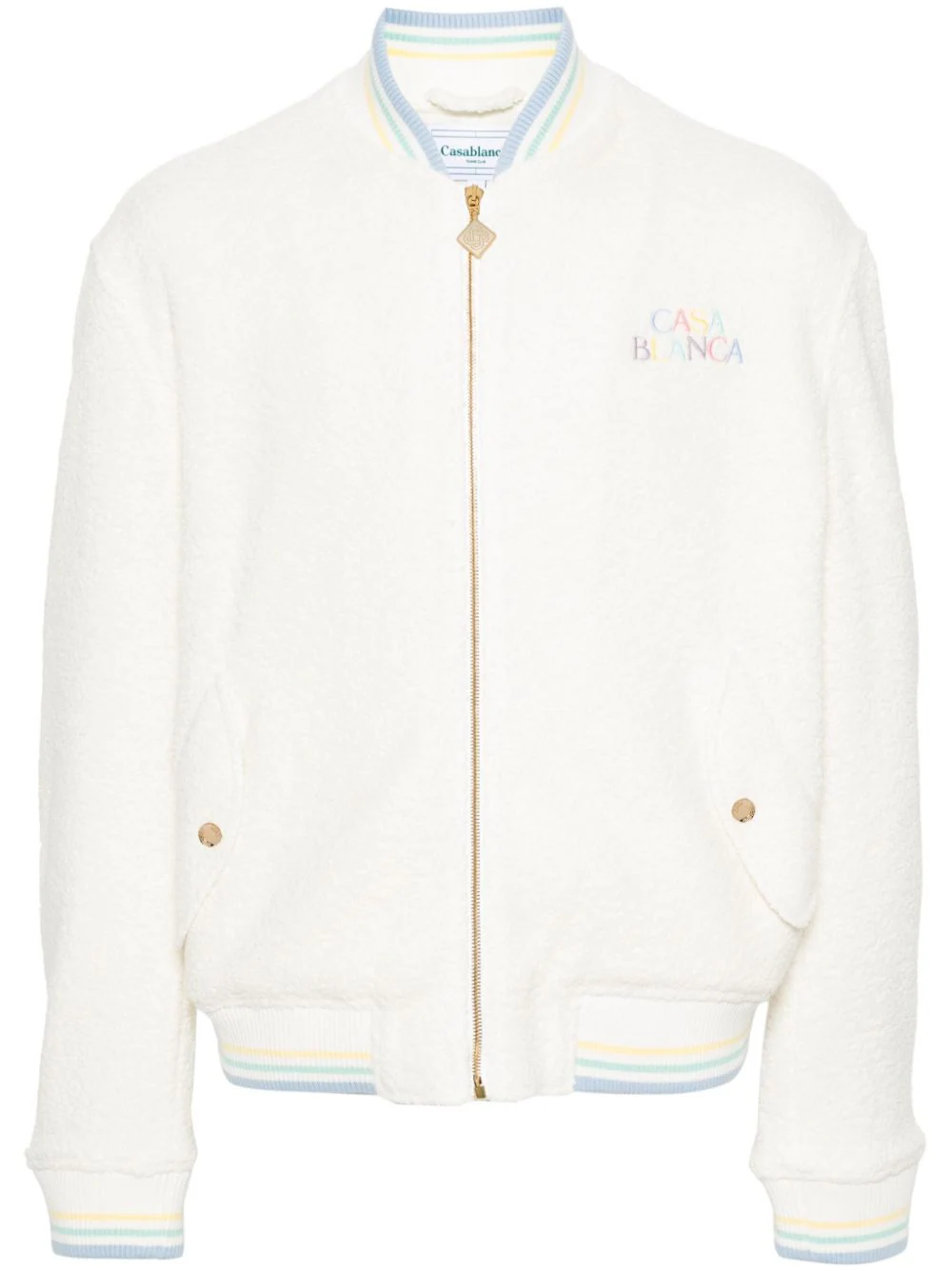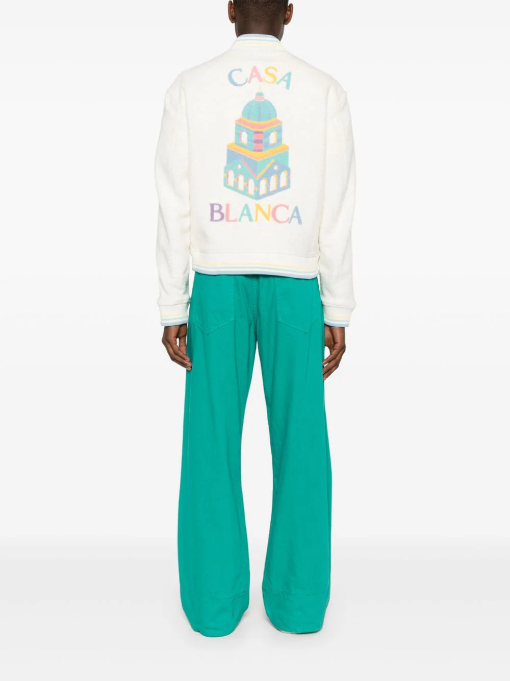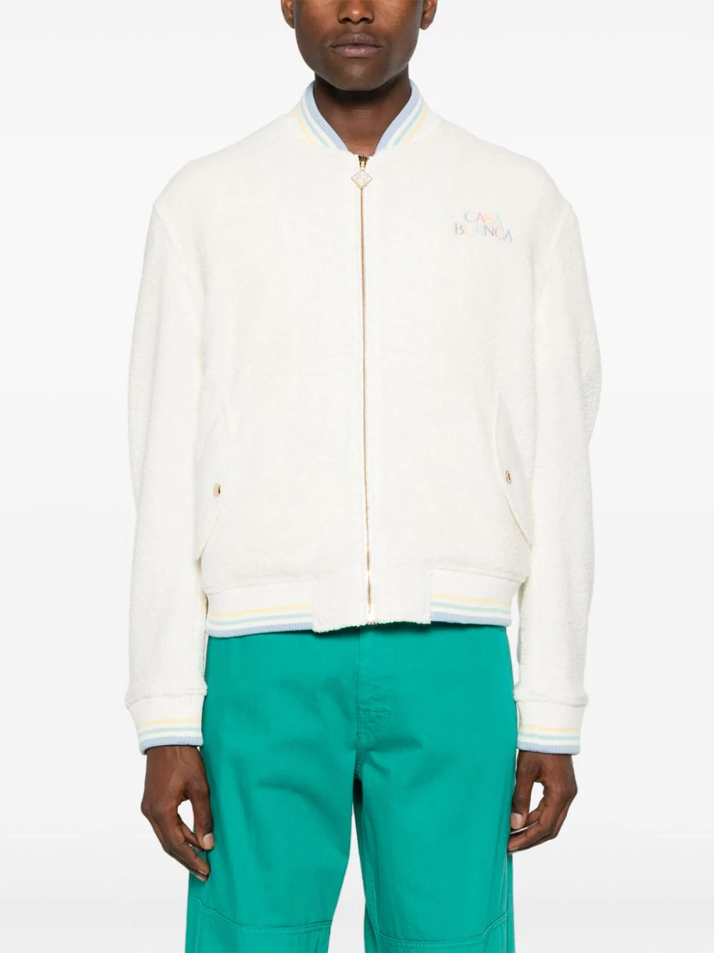 Jacheta bomber din mix de materiale. cu guler baseball, inchidere cu fermoar, maneci lungi, mansete elastice, grafica Casablanca „Maison Pastelle” imprimata pe partea din spate, buzunare laterale, captuseala din viscoza/bumbac si tiv elastic drept. Potrivita pentru sezonul toamna/iarna. 39% lana; 22% viscoza; 17% poliamida; 14% poliester; 52% viscoza; 48% bumbac.