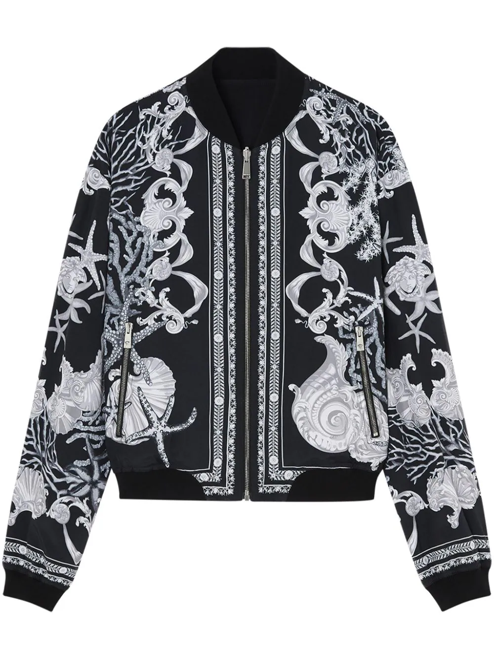 Jacheta bomber neagra din poliester, reversibila monocrom, cu guler tip baseball din tesatura ribbon, inchidere cu fermoar, maneci lungi, mansete elastice, buzunare laterale cu fermoar si capse, grafica Versace „Watercolour Couture-Print”, logo brodat pe laterala si tiv elastic drept. Potrivita penstru sezonul de toamna/iarna. 100% poliester.