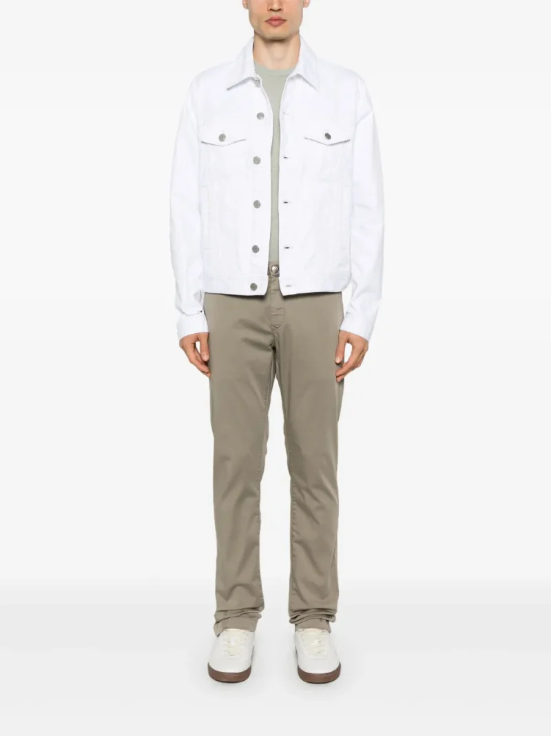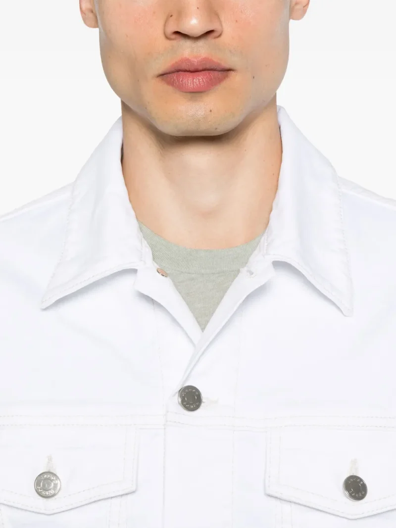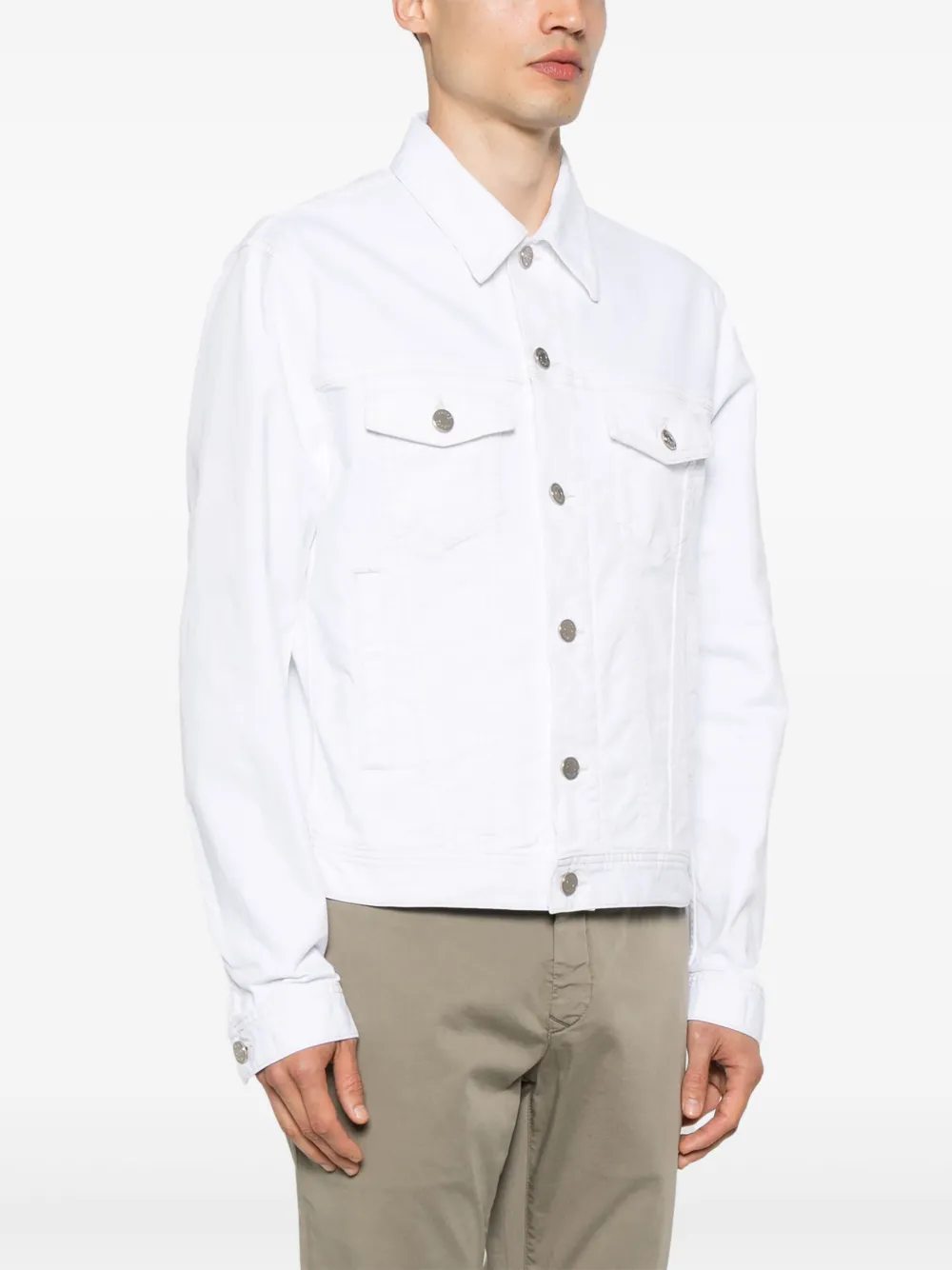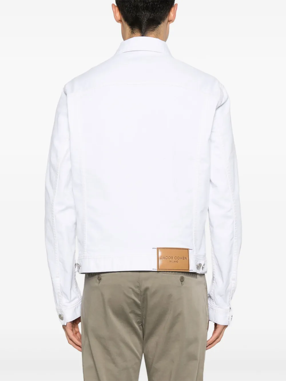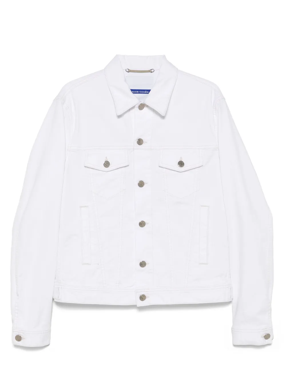 Jacheta denim Jacob Cohen alb, din bumbac denim, cu guler clasic, inchidere cu nasturi metalici, maneci lungi, mansete cu nasturi, eticheta din piele cu logo Jacob Cohen cusuta la spate si tiv drept. Potrivita pentru sezonul primavara/vara. 3% elastan; 97% bumbac.