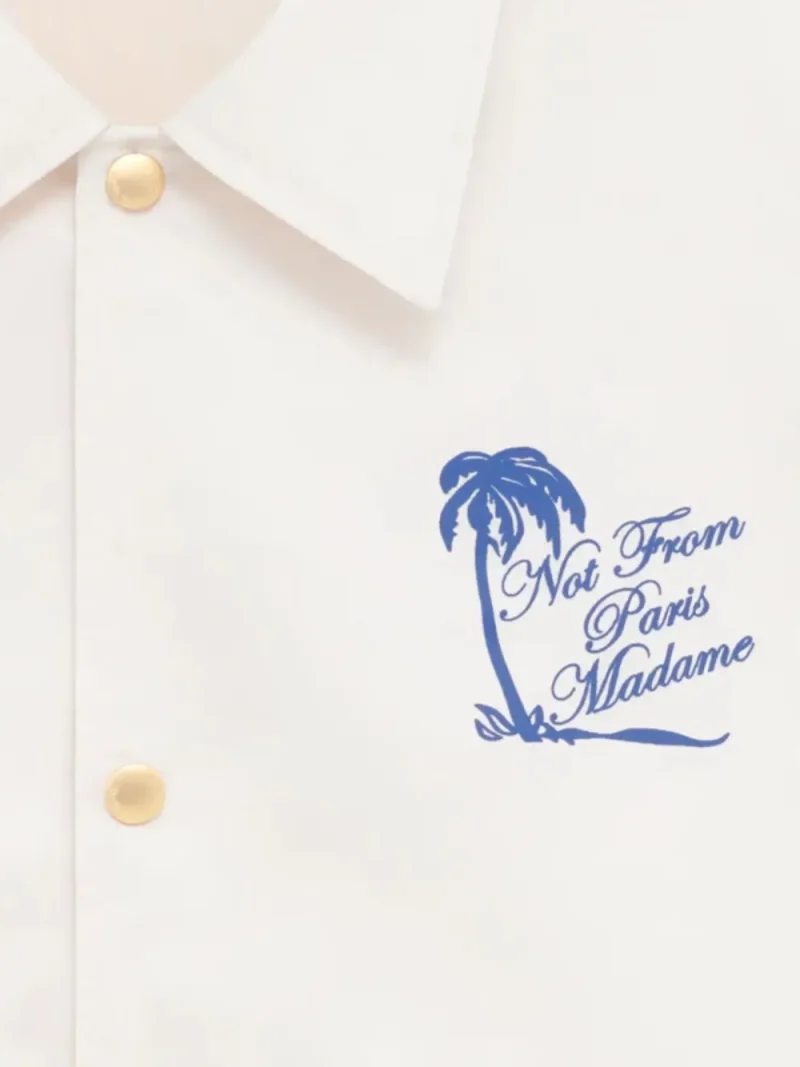 Jacheta Drole De Monsieur Buttoned Graphic alb, design overshirt, cu guler clasic, inchidere cu nasturi gravati, buzunare cu refileti, grafica Slogan Palmier imprimata pe piept si spate si tiv elastic. Potrivita pentru sezonul primavara/vara. 100% nylon.