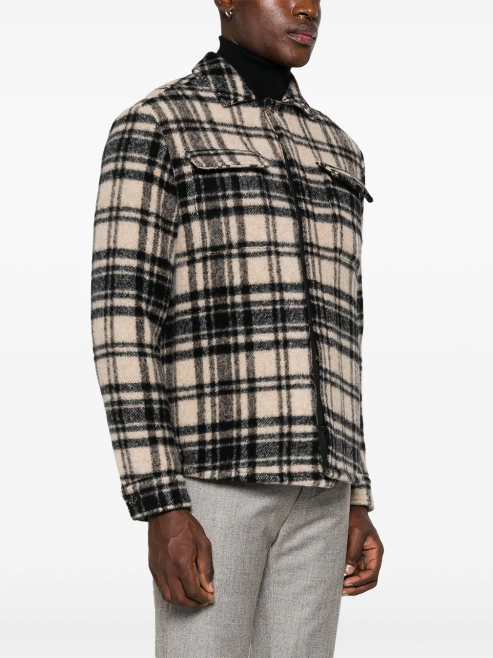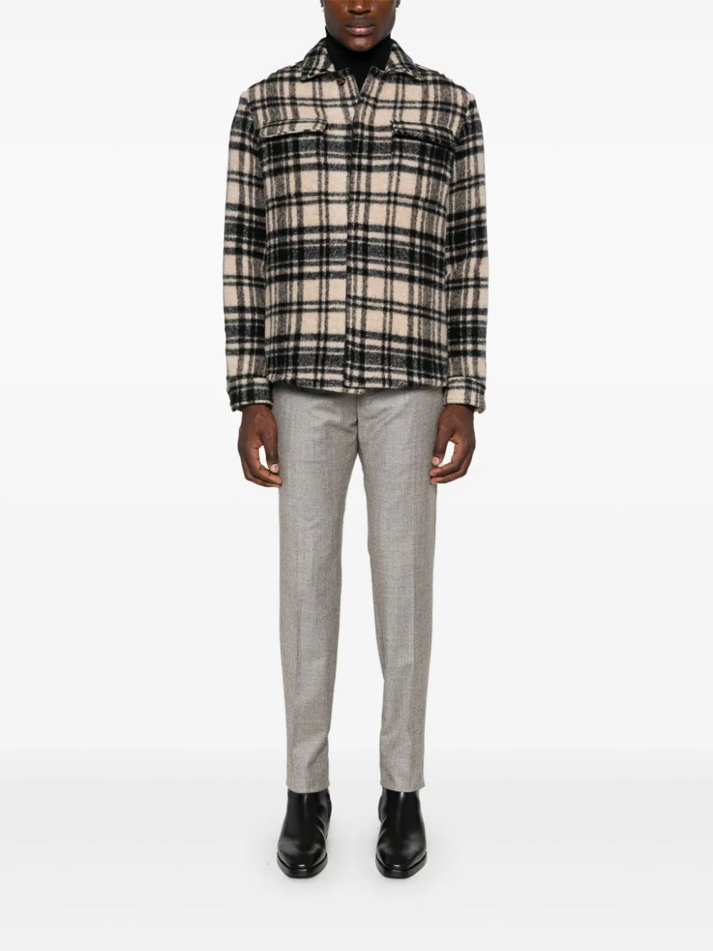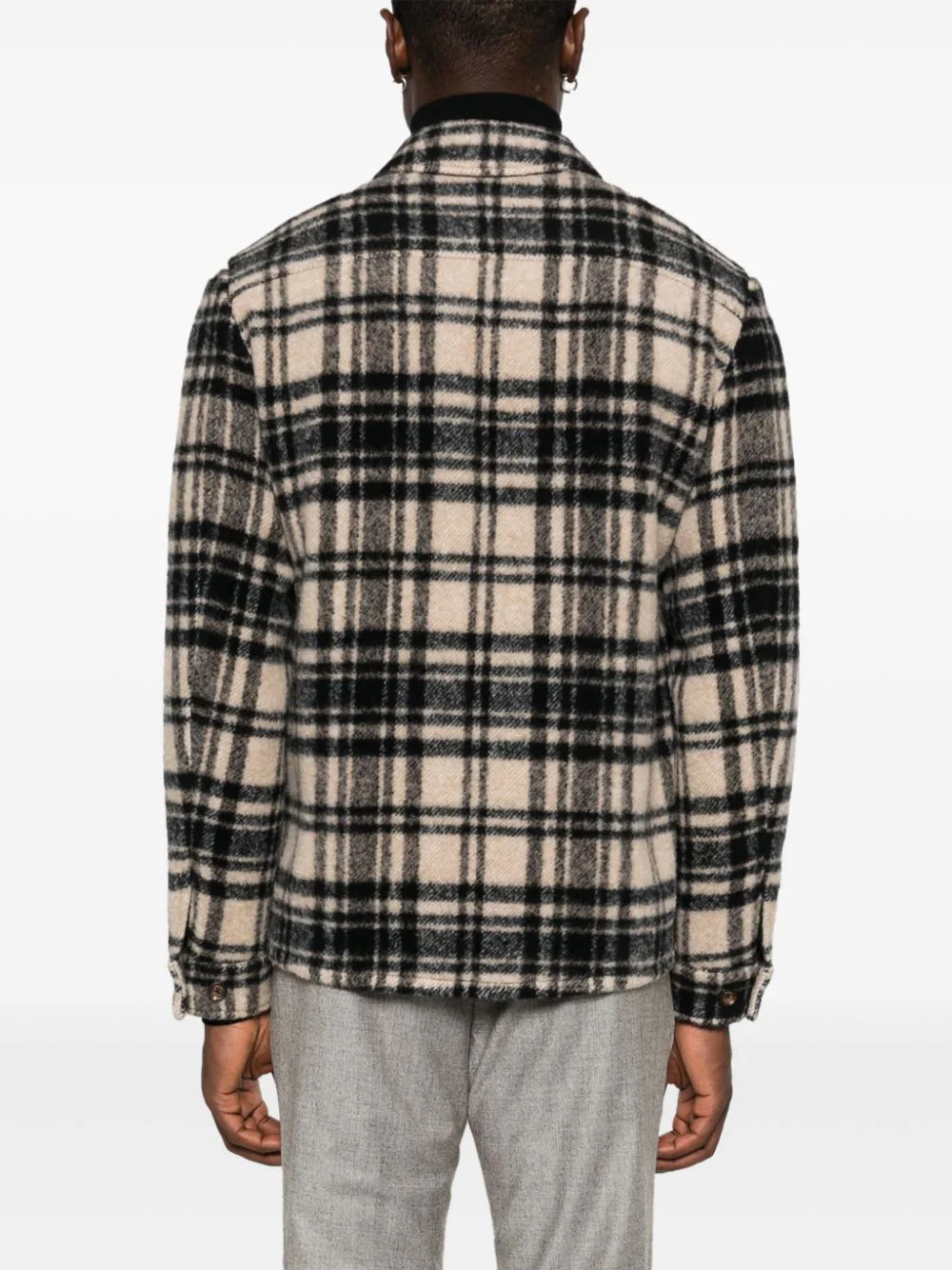Jacheta Eleventy Checkered multicolor, tip camasa, din lana, cu guler clasic, inchidere cu nasturi ascunsi, maneci lungi, mansete cu nasturi, buzunare aplicate la piept, grafica Checked in tesatura si tiv curbat. Potrivita pentru sezonul toamna/iarna. 100% poliester; 100% pblana de capra; 45% lana; 45% alpaca; 10% poliamida.