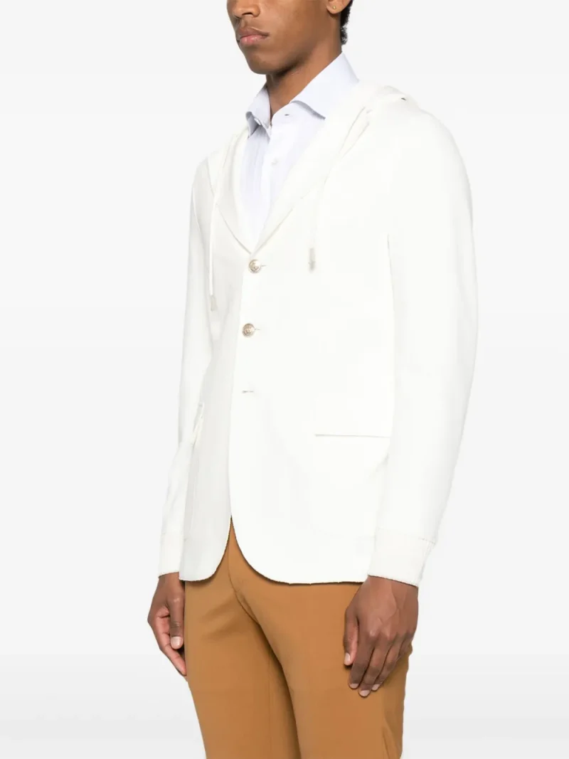 Jacheta Eleventy Hooded alb, din bumbac, cu gluga si snur, inchidere cu nasturi metalici, maneci lungi, buzunare cu clapeta pe lateral si tiv drept. Potrivit pentru sezonul toamna/iarna. 83% bumbac; 3% elastan; 14% poliamida; 64% lana; 34% poliamida.