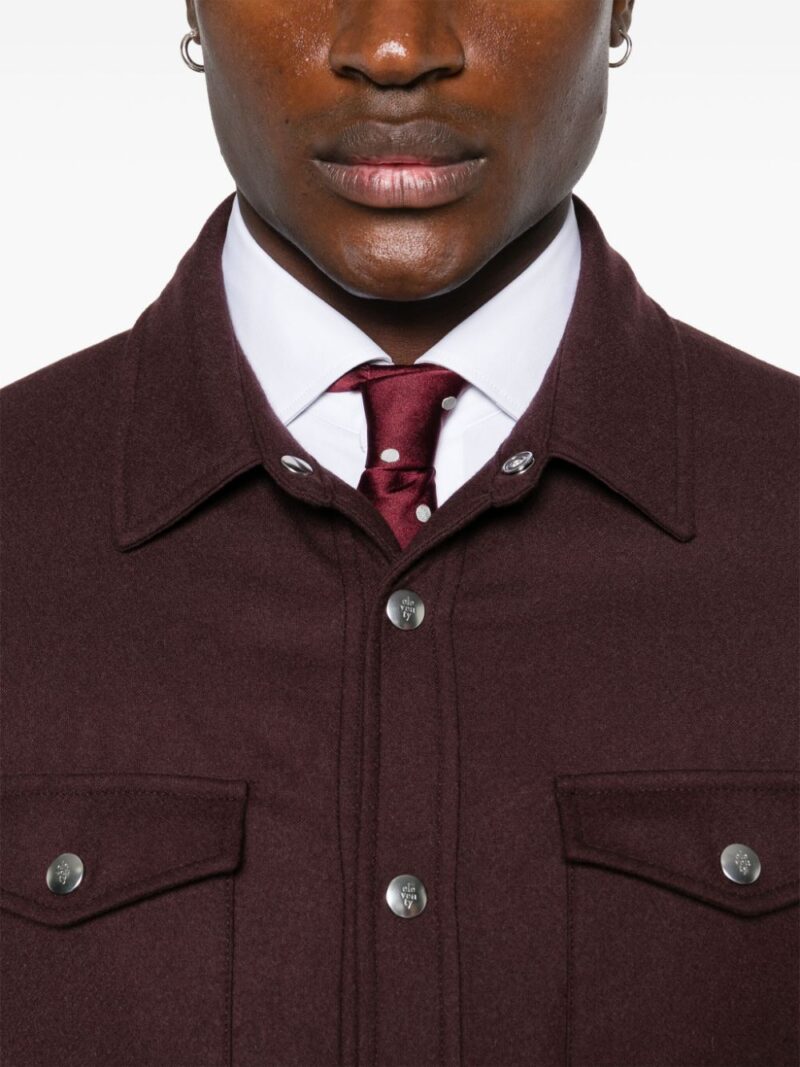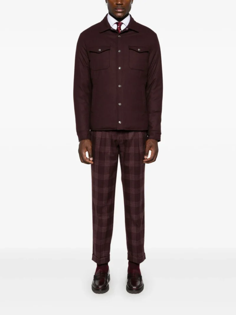 Jacheta Eleventy Padded visiniu, din lana, tip camasa, cu guler clasic, inchudere capse cu logo gravat, maneci lungi, mansete cu capse, buzunare laterale, buzunare aplicate la piept, umplutura din puf de gasca, captuseala din poliester si tiv drept. Potrivita pentru sezonul toamna/iarna. 100% poliester; 100% puf de gasca; 100% lana.