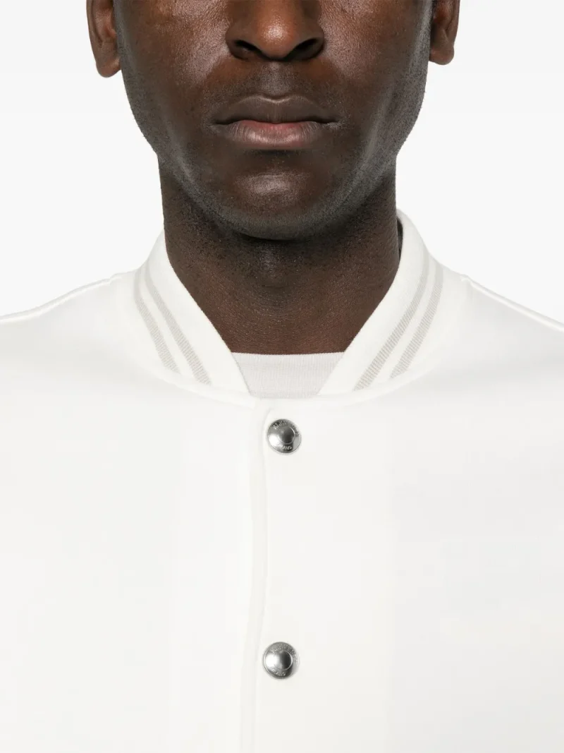 Jacheta Eleventy Panelled Bomber alb, din piele, cu guler tip baseball, inchidere cu capse, maneci lungi, mansete elastice ribbed, buzunare laterale, captuseala din poliamida si tiv elastic drept. Potrivita pentru sezonul primavara/vara. 100% piele de miel; 68% bumbac; 32% poliamida; 100% poliamida.