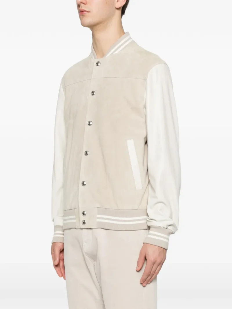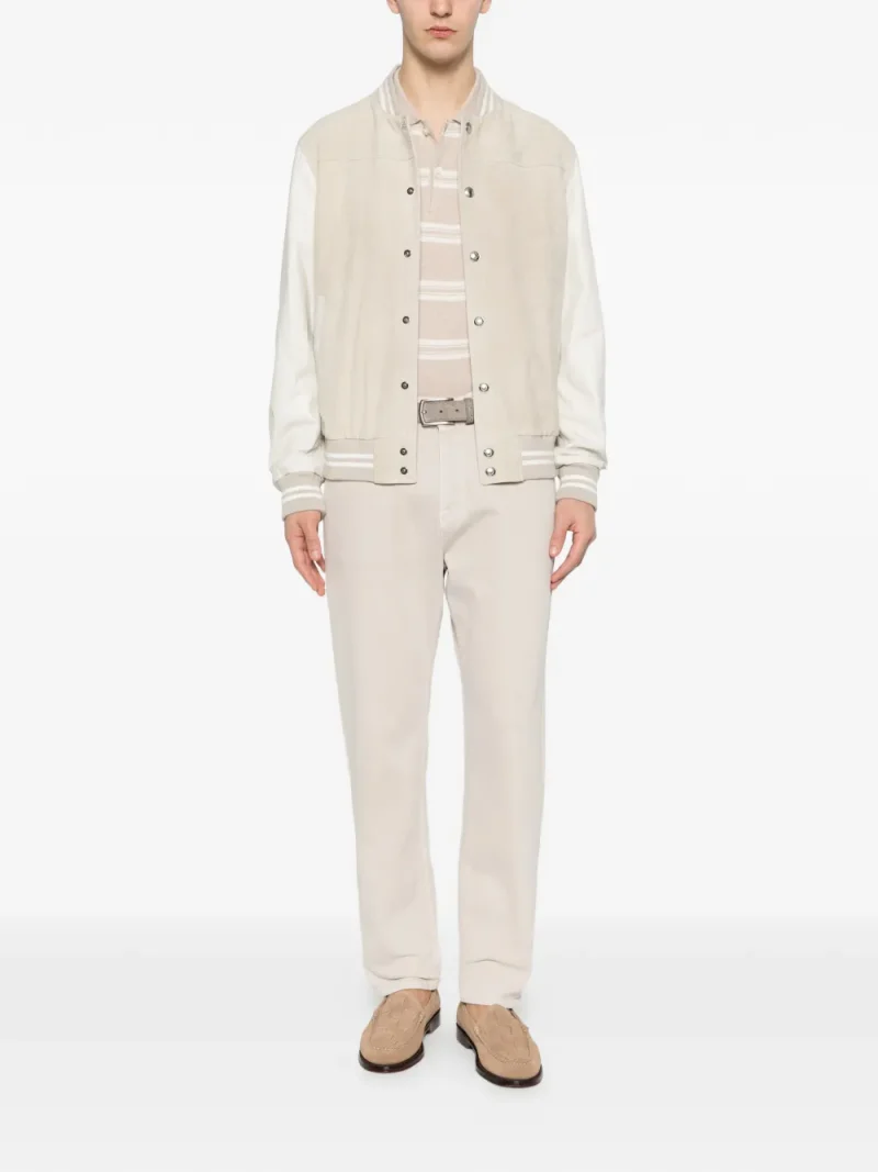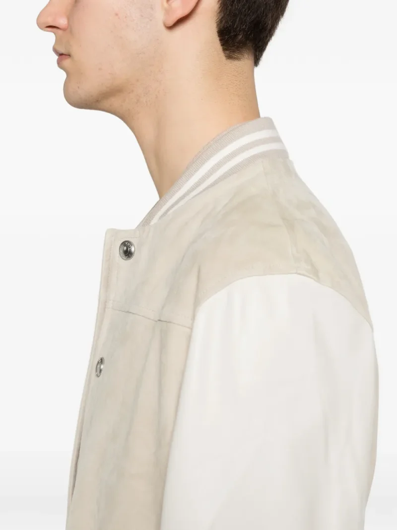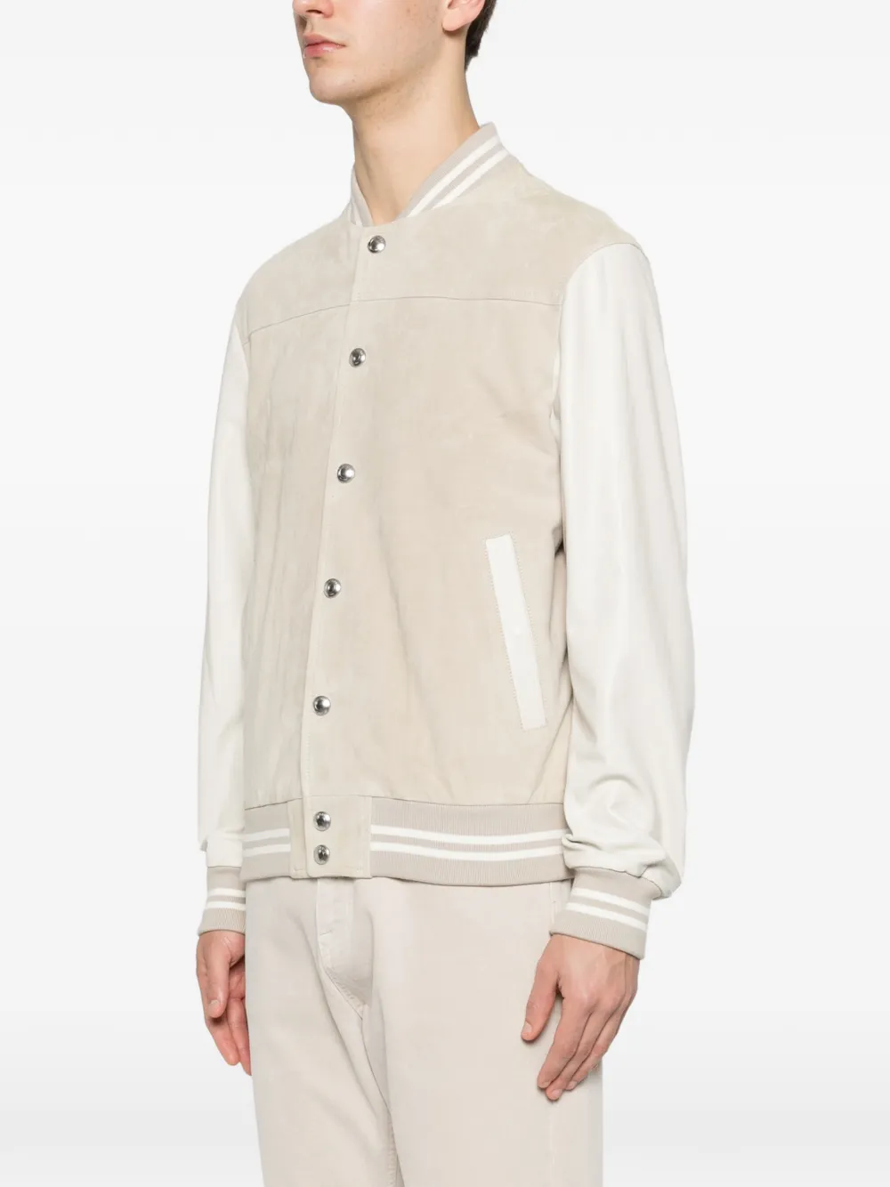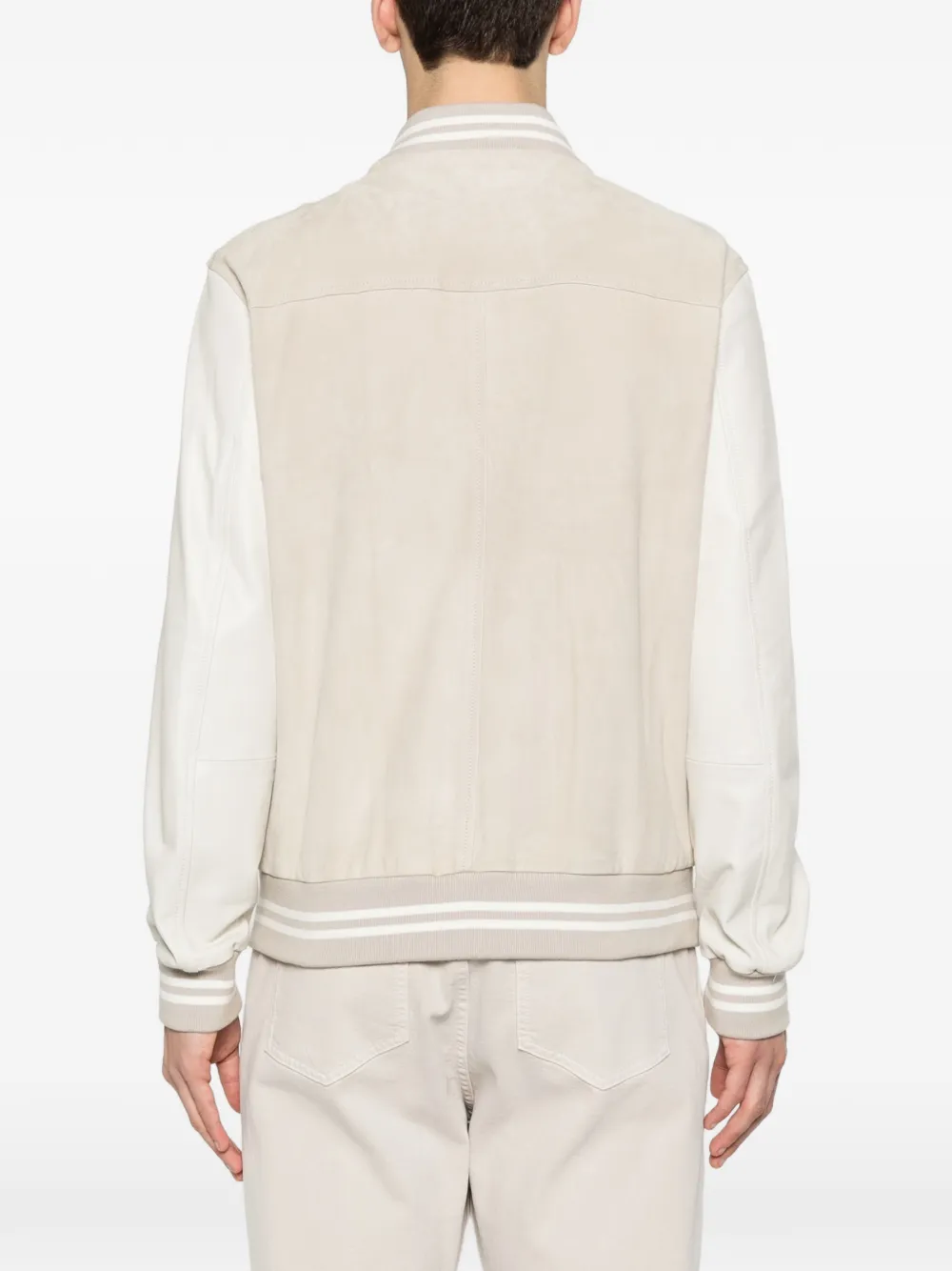 Jacheta Eleventy Striped Bomber bej, realizata din panouri de piele intoarsa, bomber style, cu guler baseball, maneci lungi, inchiedere cu capse, buzunare laterale si terminatii rbbed. Potrivita pentru sezonul primavara/vara. 100% piele de miel; 100% piele nappa de capra; 100% poliamida.