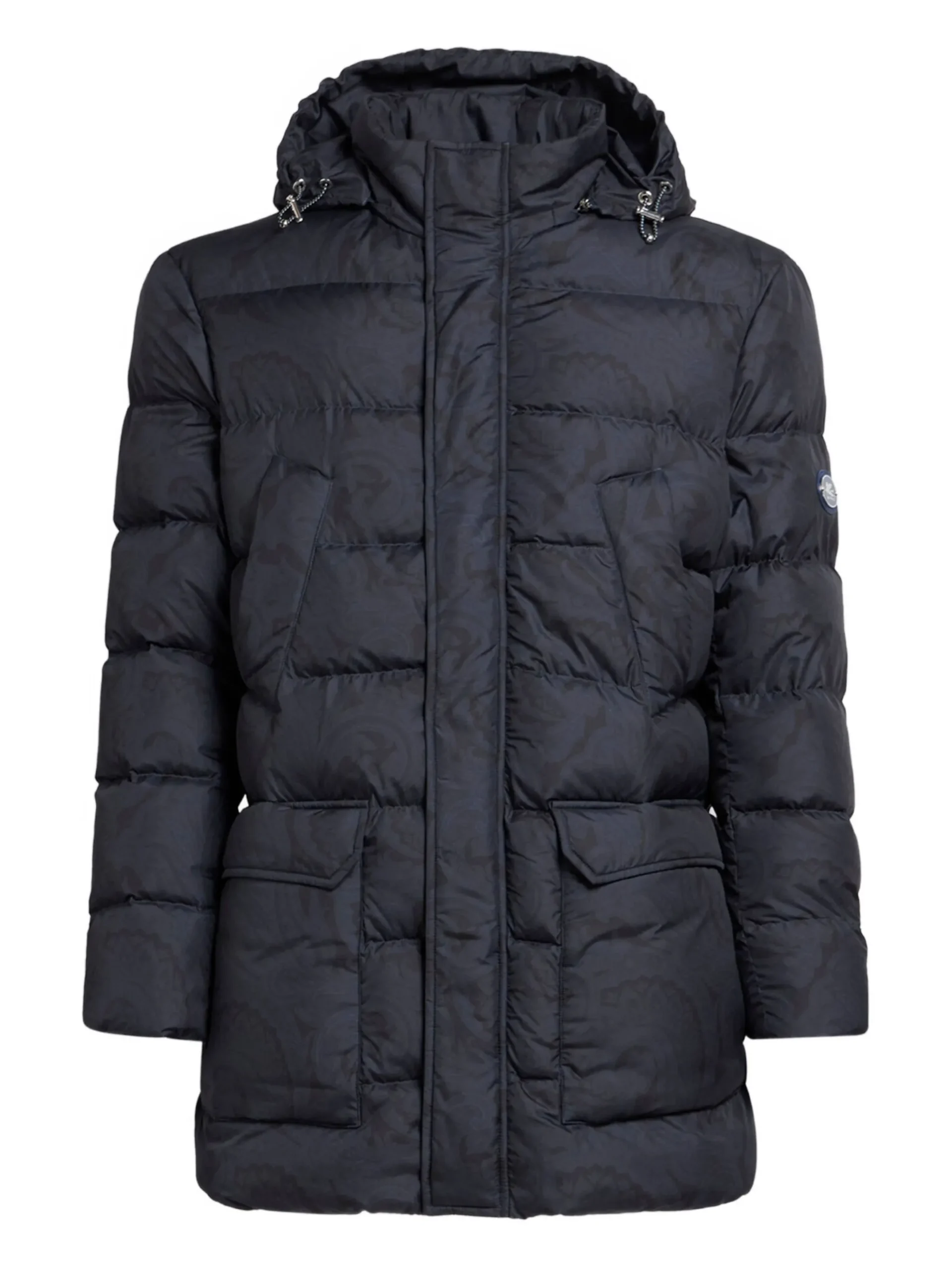 Jacheta ETRO quilted hooded negru, inchidere cu fermoar, maneci lungi, gluga cu snur, patru buzunare frontale, model Paisley, design captusit. 100% poliester