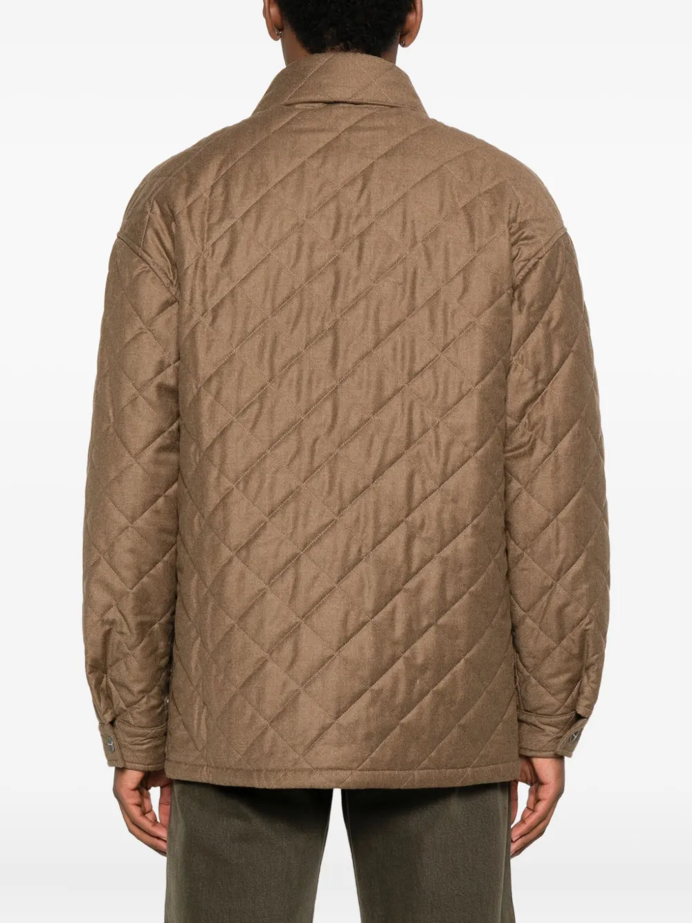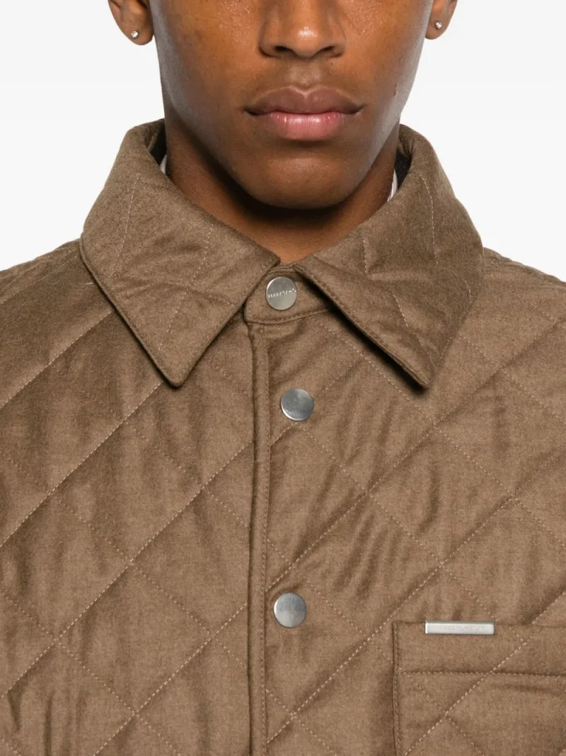 Jacheta Ferragamo Quilted Diamond Pattern maro, construita din lana, cu guler clasic, inchidere cu capse, maneci lungi, mansete cu capse, buzunare aplicate lateral, buzunar la piept, matlasata integral si cu tiv drept. Potrivita pentru sezonul toamna/iarna. 100% lana.