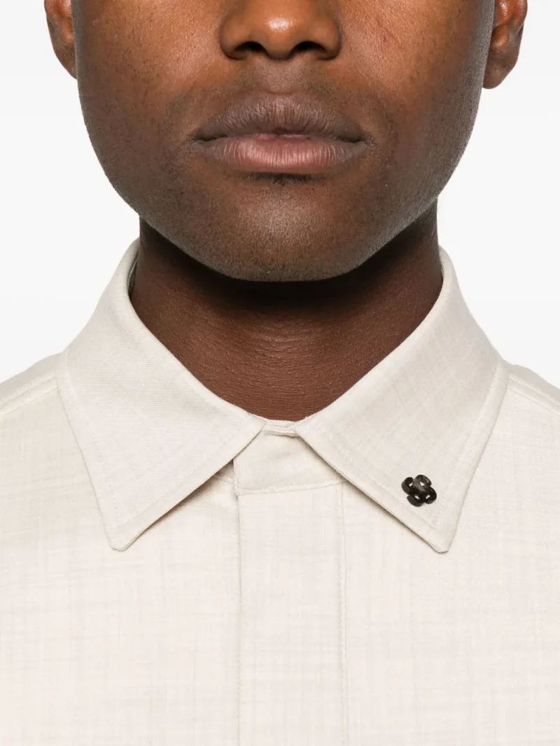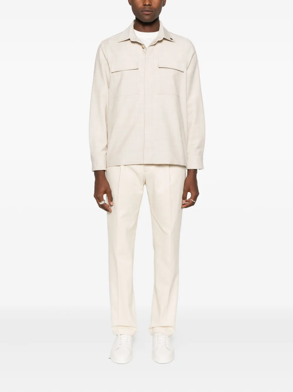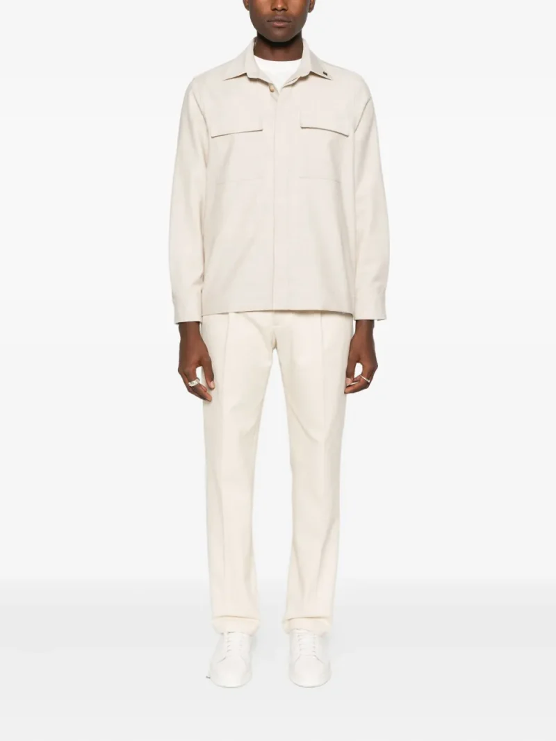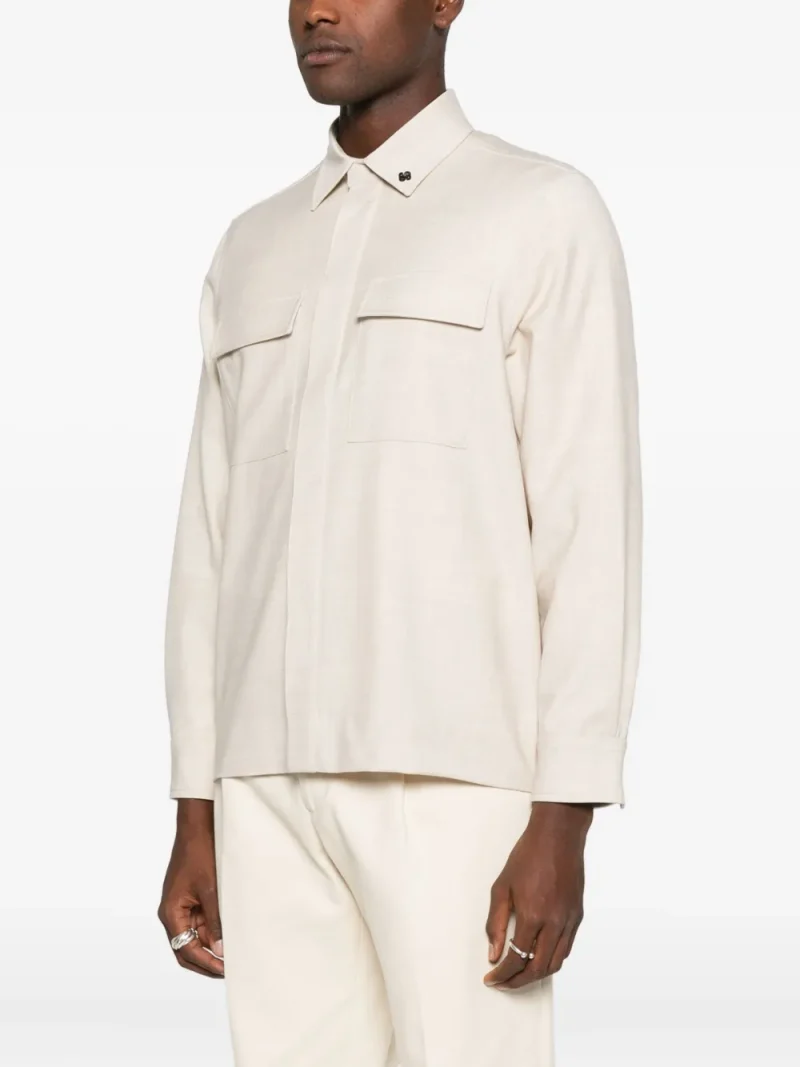 Jacheta Gran Sasso Flap-Pocket Shirt bej, din lana, cu guler clasic decorat cu logo metalic, inchidere cu nasturi ascunsi, maneci lungi, buzunare aplicate la piept si tiv drept. Potrivita pentru sezonul toamna/iarna. 52% lana; 43% poliester; 5% elastan.