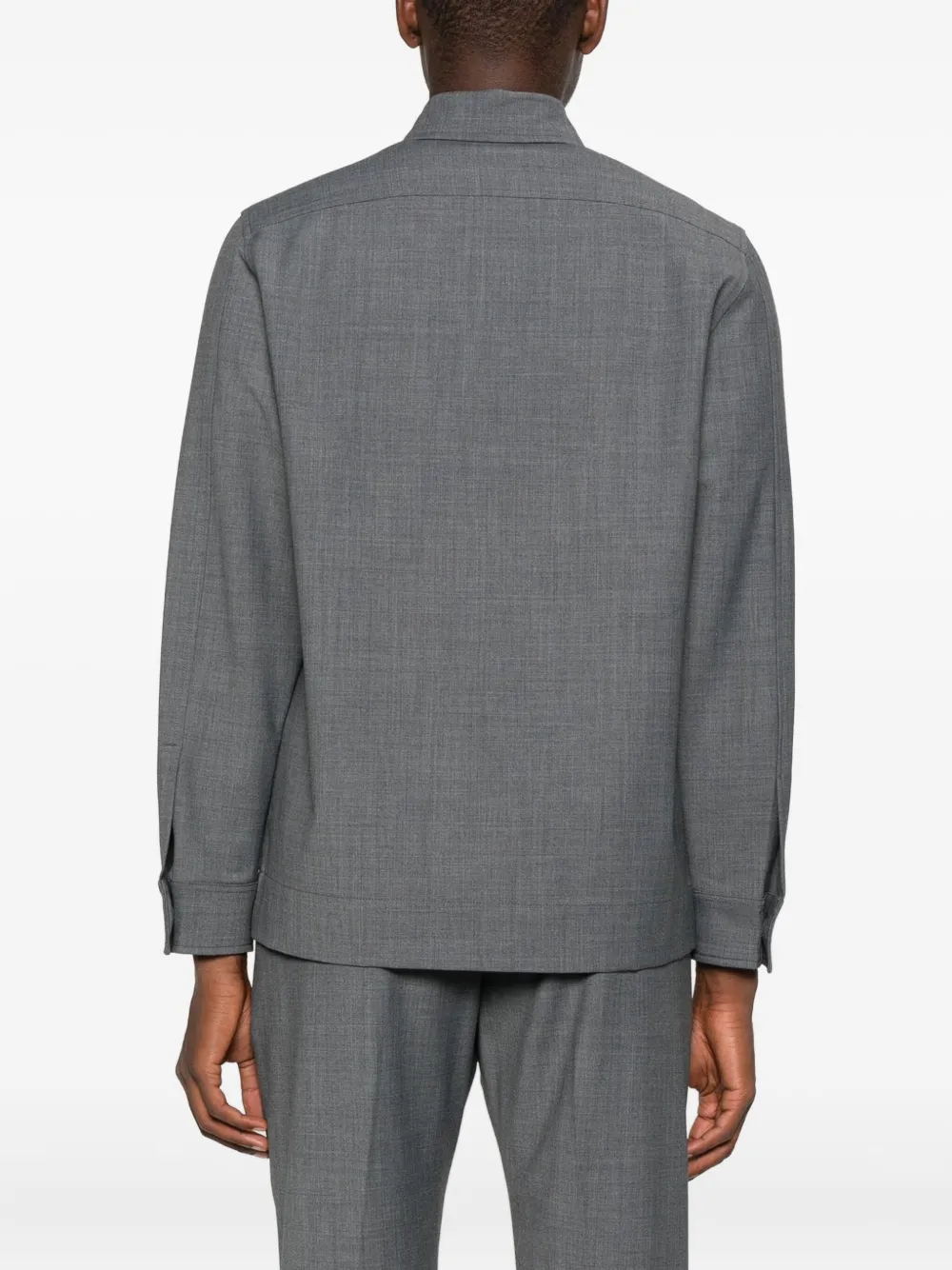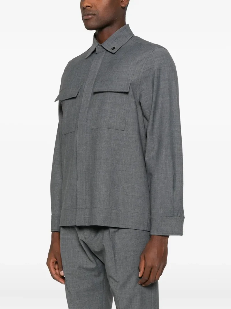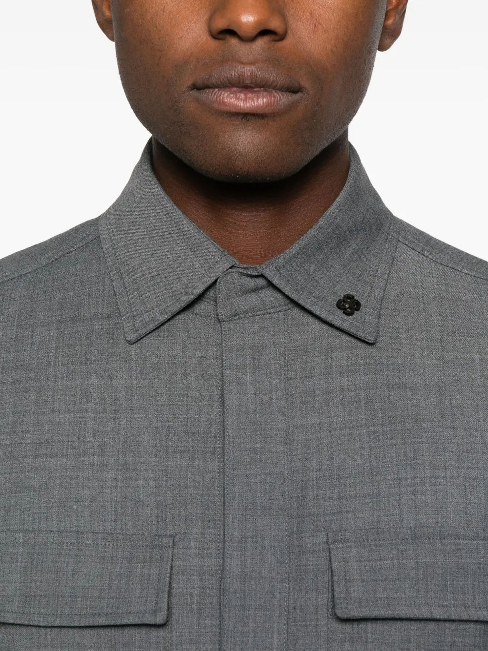 Jacheta Gran Sasso Flap-Pocket Shirt gri, din lana, cu guler clasic decorat cu logo metalic, inchidere cu nasturi ascunsi, maneci lungi, buzunare aplicate la piept si tiv drept. Potrivita pentru sezonul toamna/iarna. 52% lana; 43% poliester; 5% elastan.