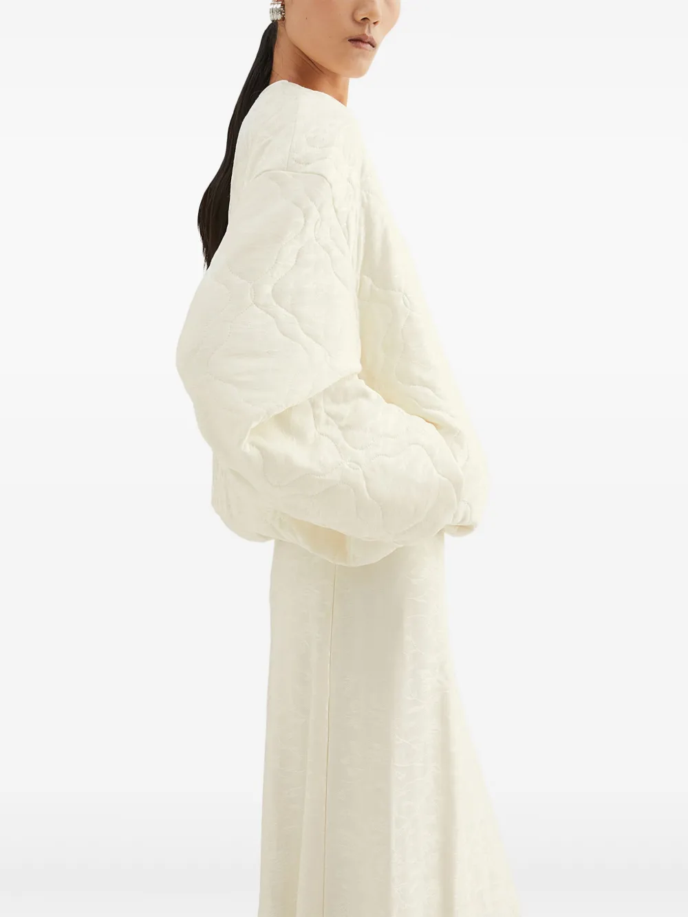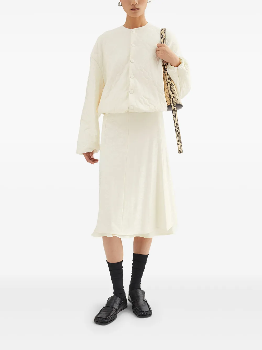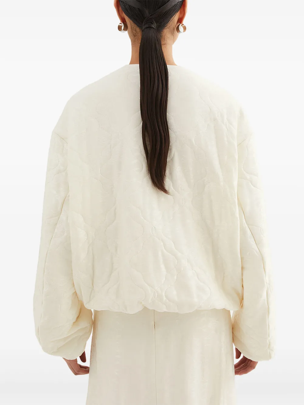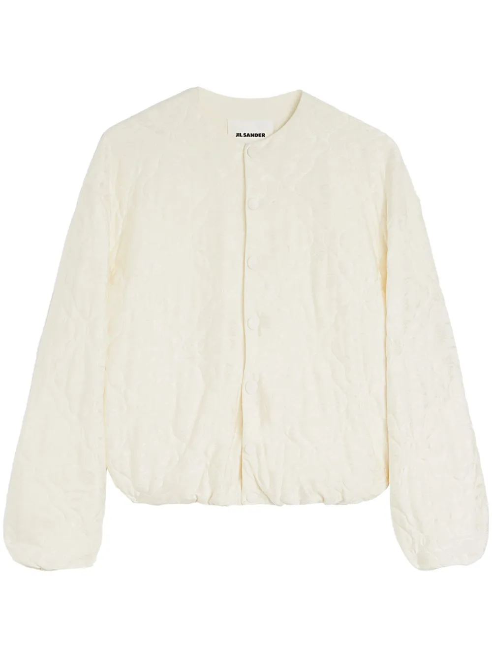 Jacheta JIL SANDER Jacquard Bomber alb, din viscoza, cu guler rotund, inchidere cu capse, maneci lungi, mansete elastice, matlasata integral si tiv elastic drept. Potrivita pentru sezonul primavara/vara. 96% viscoza; 4% elastan.