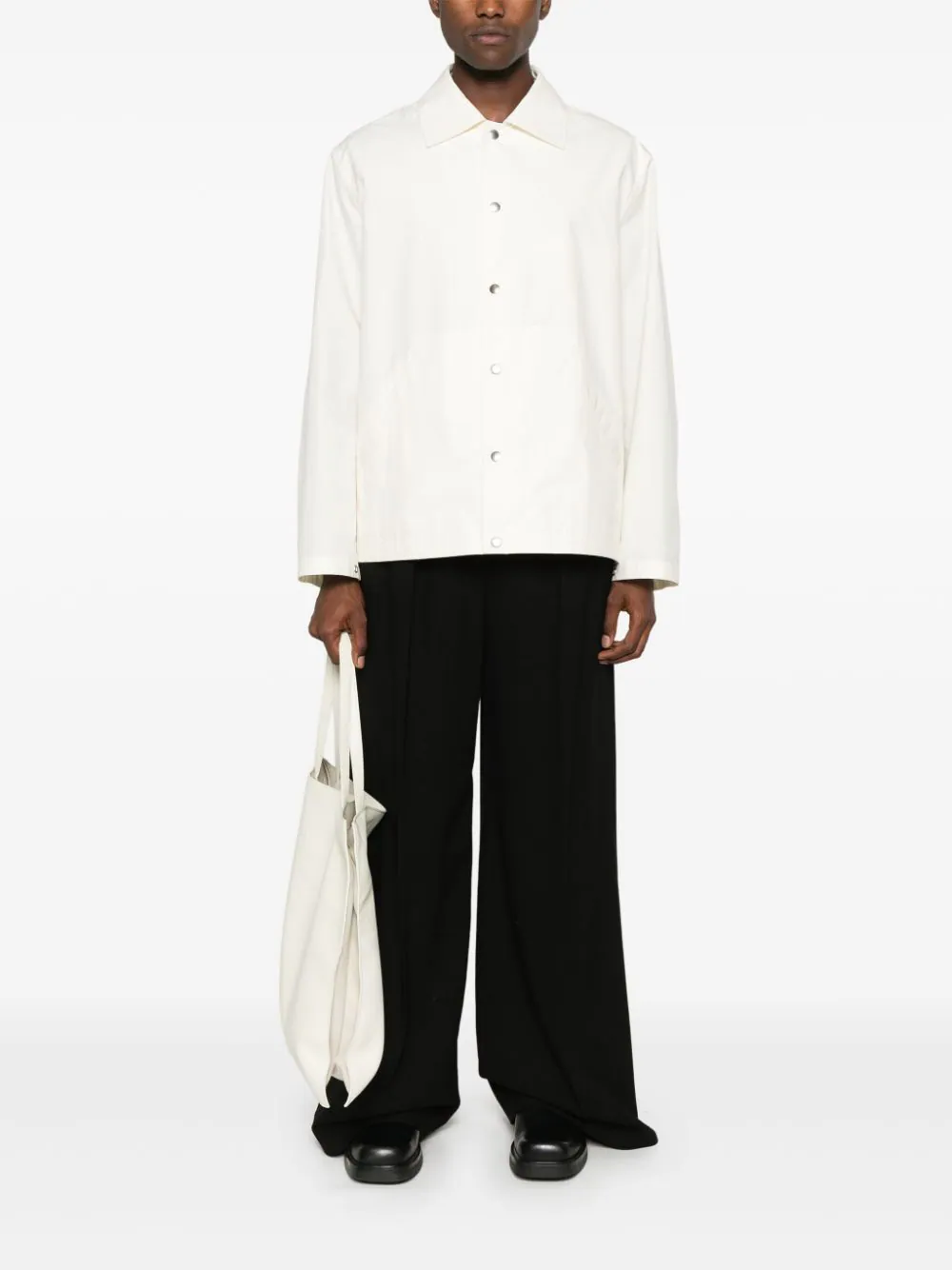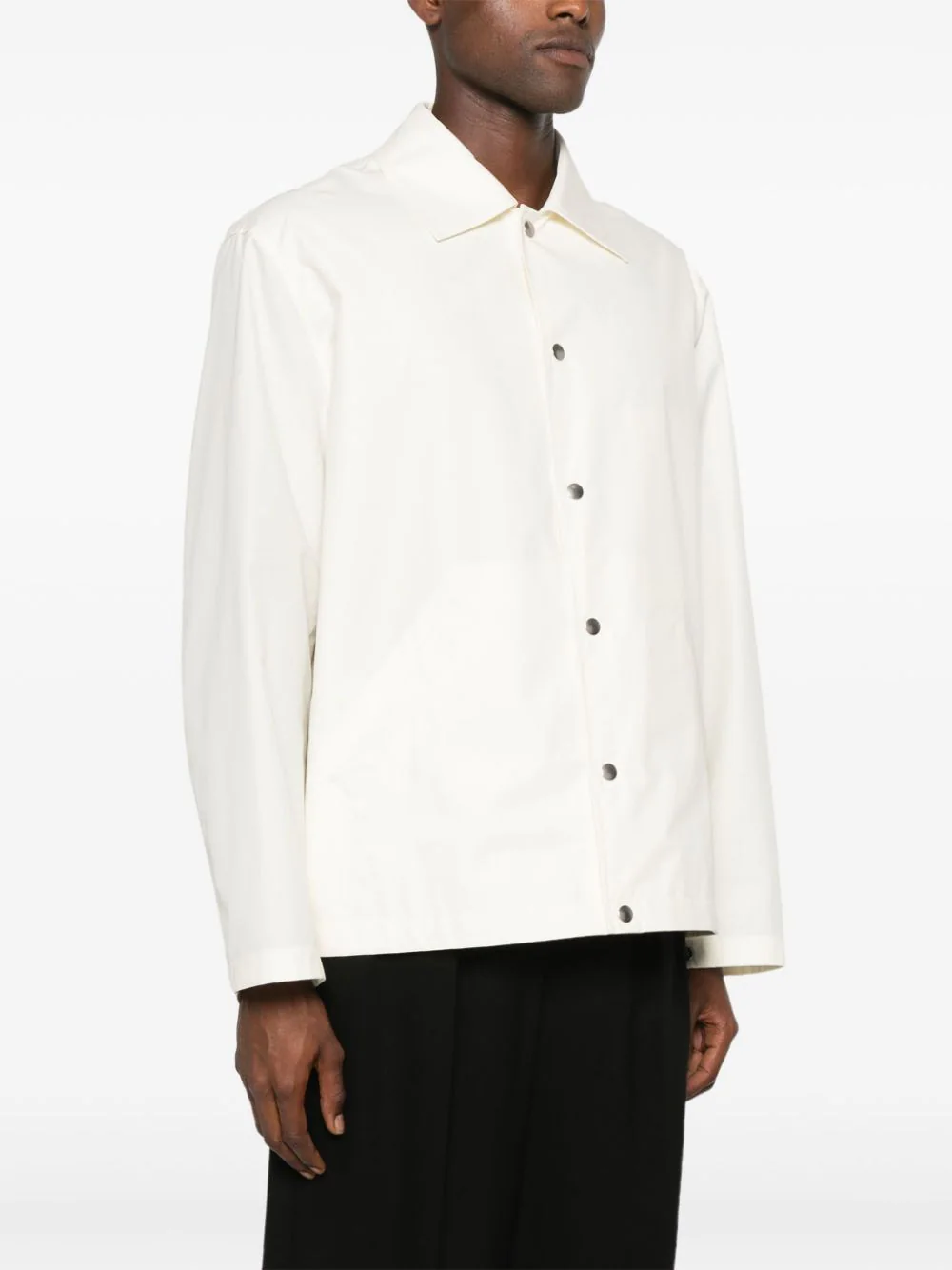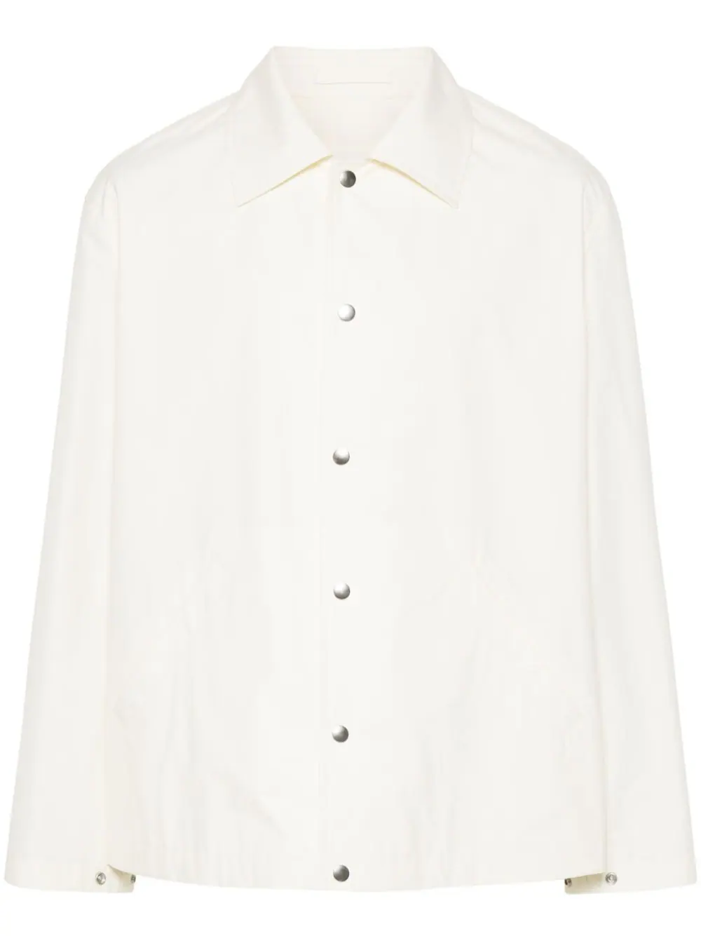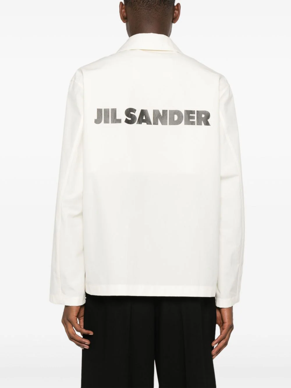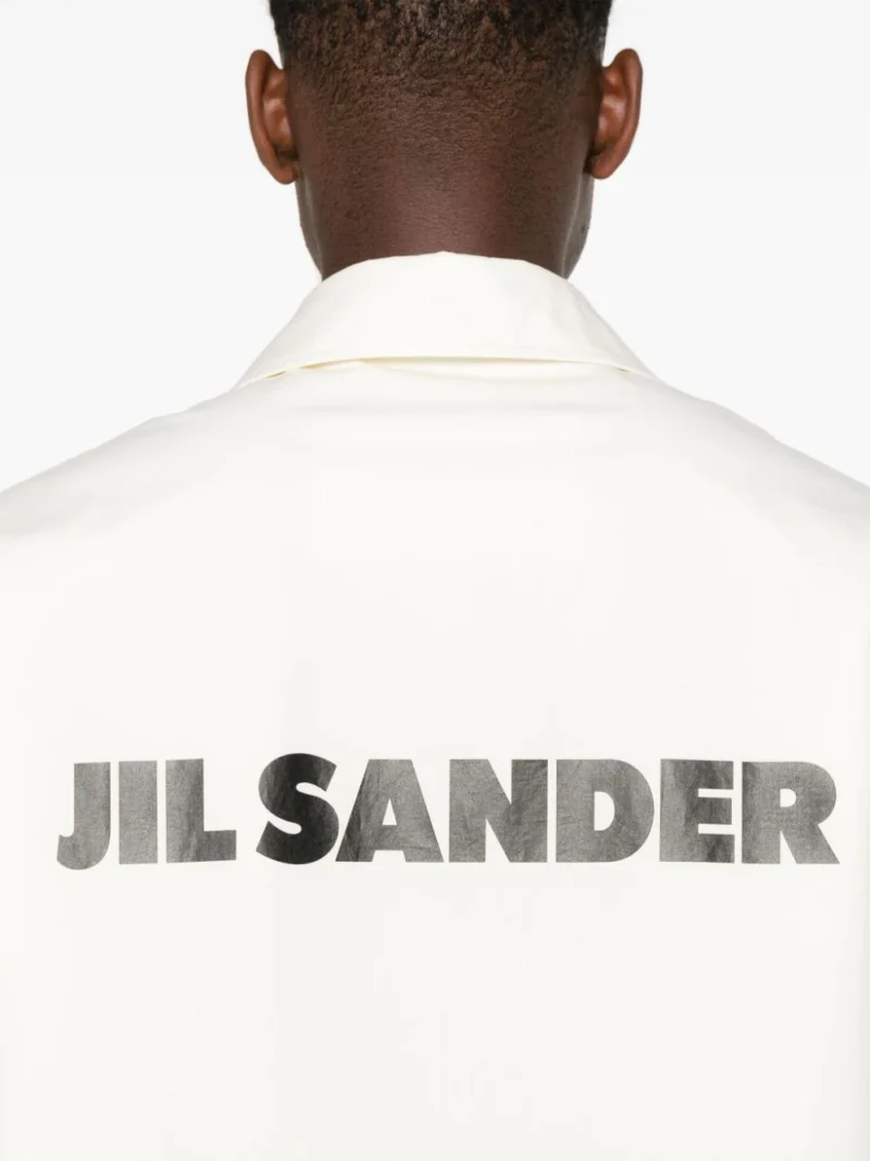 Jacheta JIL SANDER Logo-Print alb, din bumbac, cu guler clasic, inchidere cu capse, maneci lungi, mansete cu capse, buzunare tip welt pe laterale, logo JILL SANDER supradimensionat imprimat pe partea din spate si tiv drept. Potrivita pentru sezonul toamna/iarna. 100% bumbac.