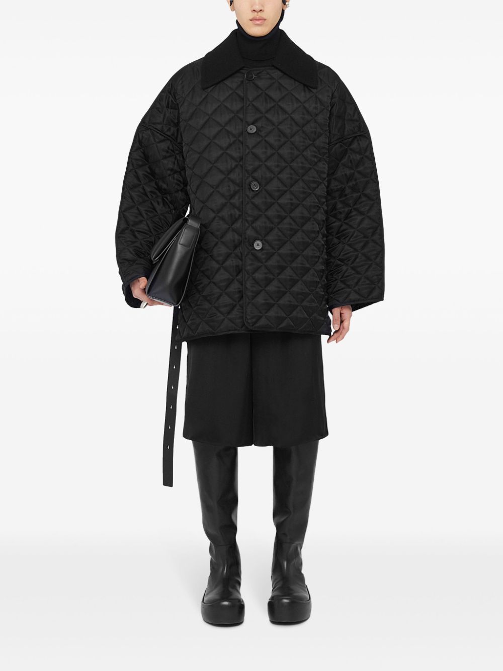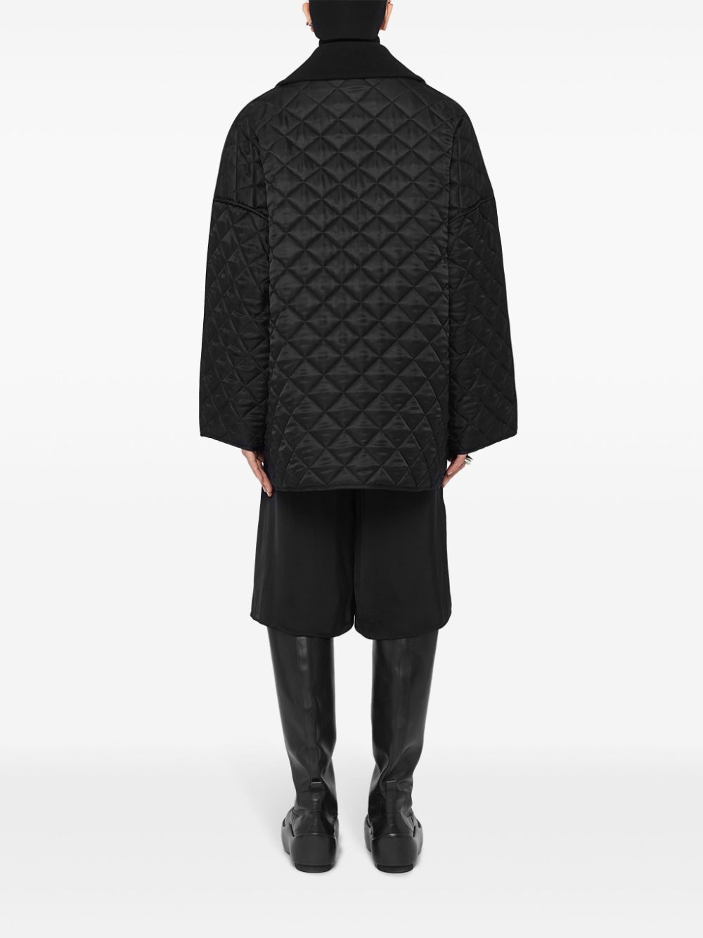 Jacheta JIL SANDER Quilted negru, din viscoza, design matlasat integral, cu guler tip spread oversized, inchidere cu nasturi, umeri cazuti, maneci lungi evazate, buzunare laterale si tiv elastic drept. Potrivita pentru sezonul toamna/iarna. 100% viscoza.