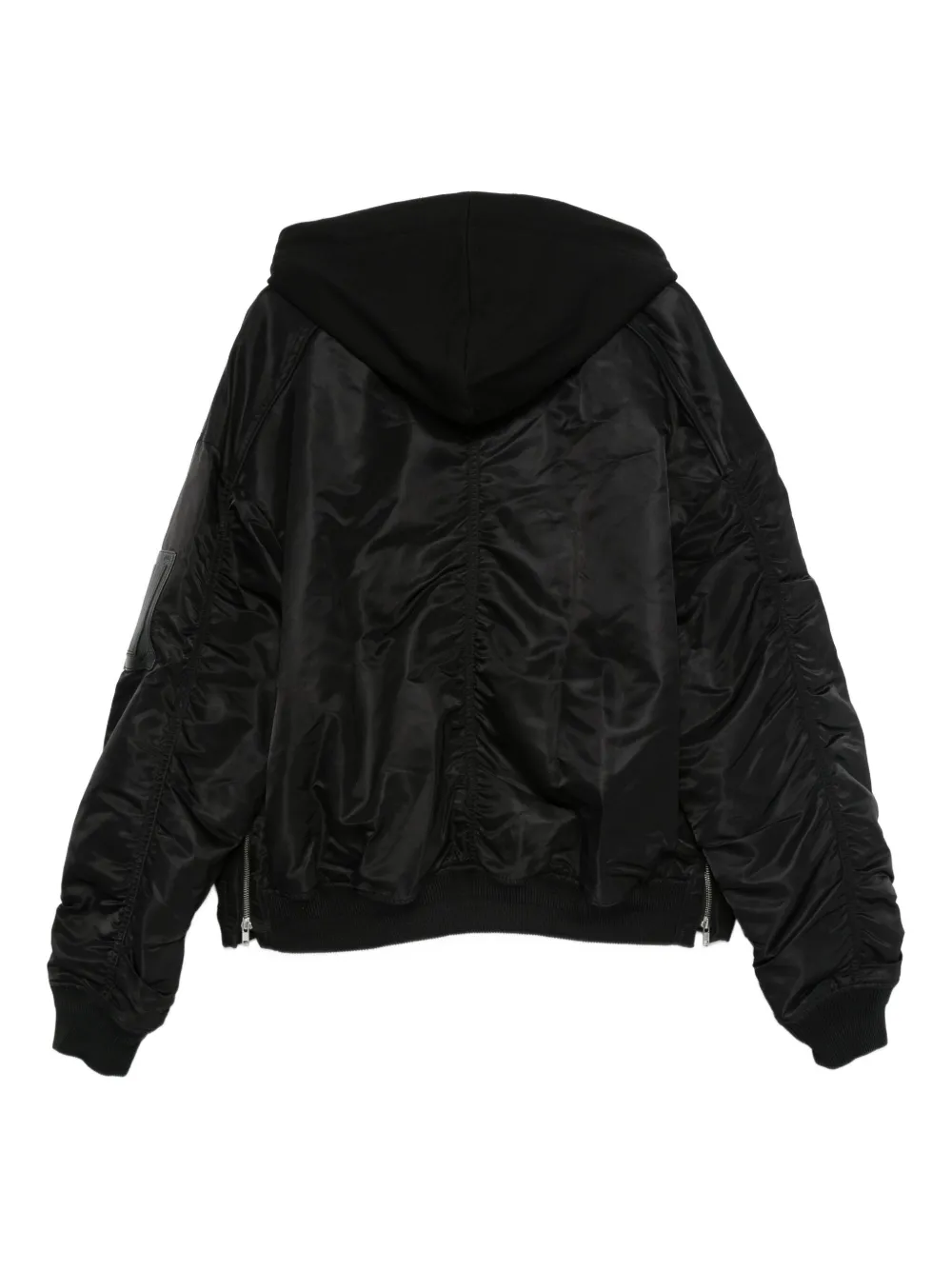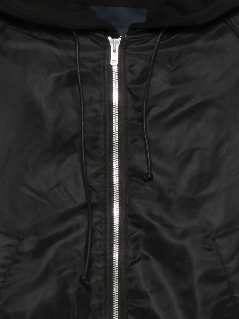 Jacheta Juun.J Hooded Bomber negru, cu guler tip baseball, gluga si snur, inchidere cu fermoar bidirectional, maneci lungi decorate cu pliuri, mansete elastice, buzunare tip welt, fermoare laterale si tiv elastic drept. Potrivita pentru sezonul primavara/vara. 100% nailon.,