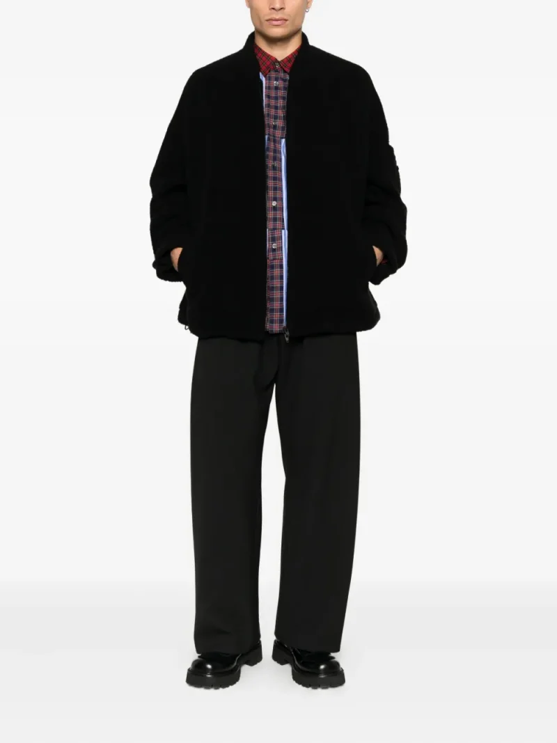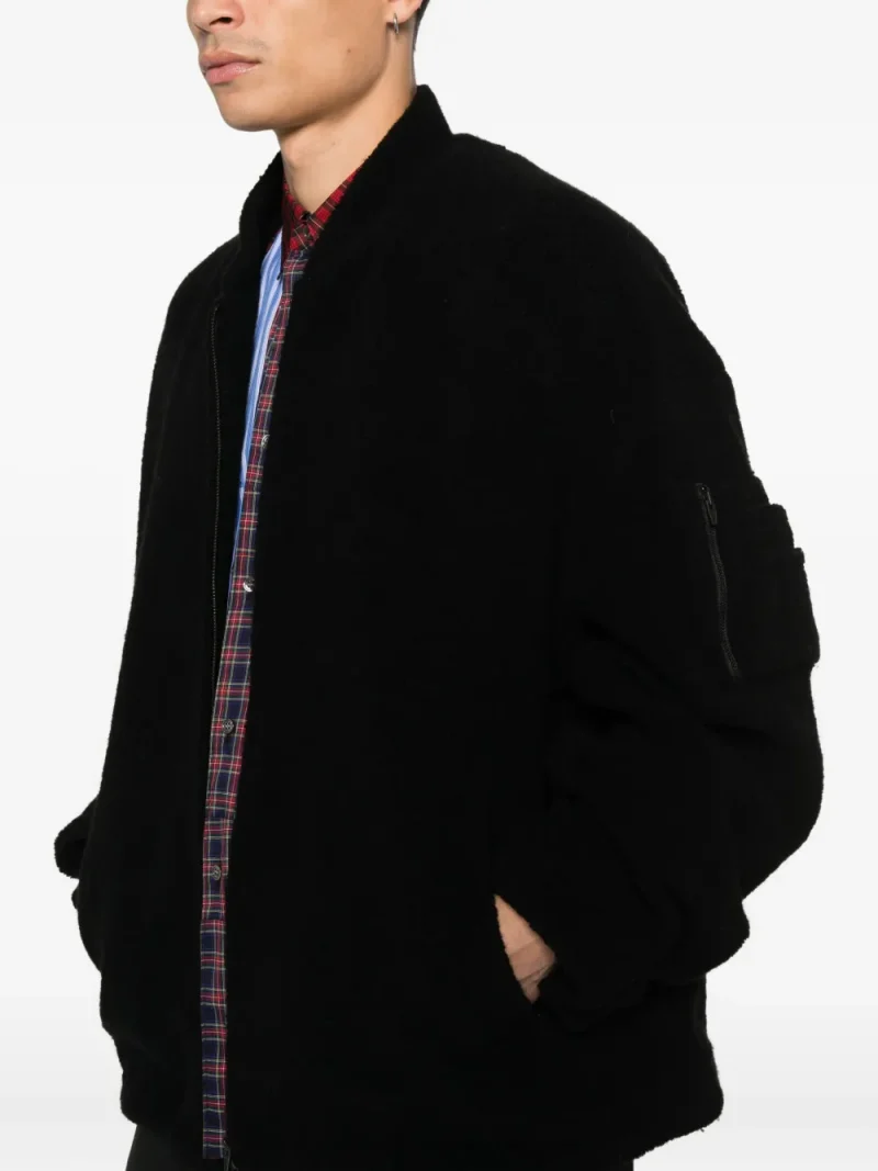 Jacheta Juun.J Zipped negrum, din lana, cu guler baseball, inchdiere cu fermoar, maneci lungi, buzunare laterale, buzunar pe o maneca si tiv drept. Potrivit a pentru sezonul toamna/iarna. 53% lana; 35% poliester; 12% nylon.