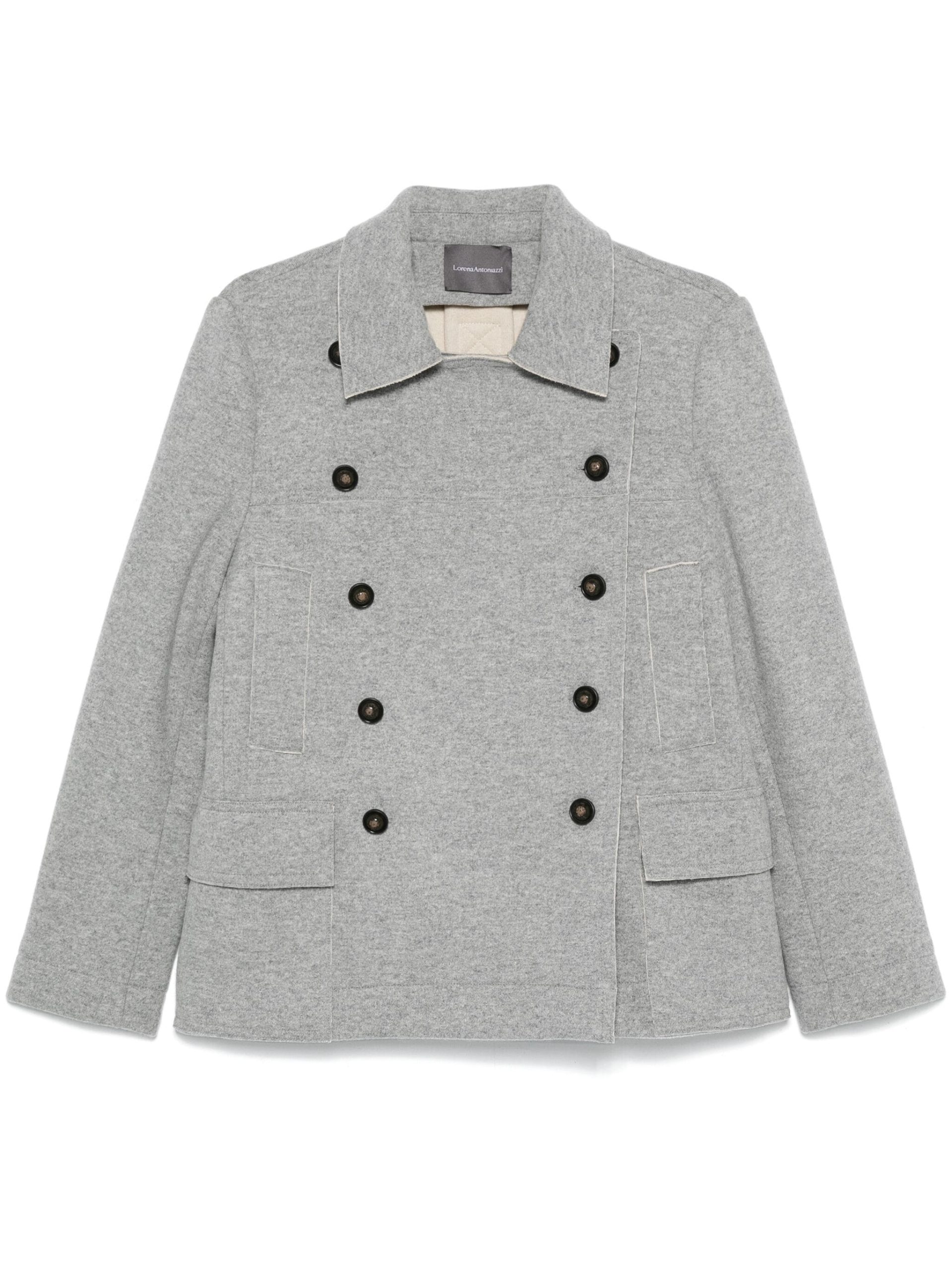 Jacheta Lorena Antoniazzi double-breasted gri, amestec de lana, inchidere cu 2 randuri de nasturi, doua buzunare laterale, doua buzunare cu clapa, finisaj texturat si tiv drept. 90% lana 9% casmir 1% nylon