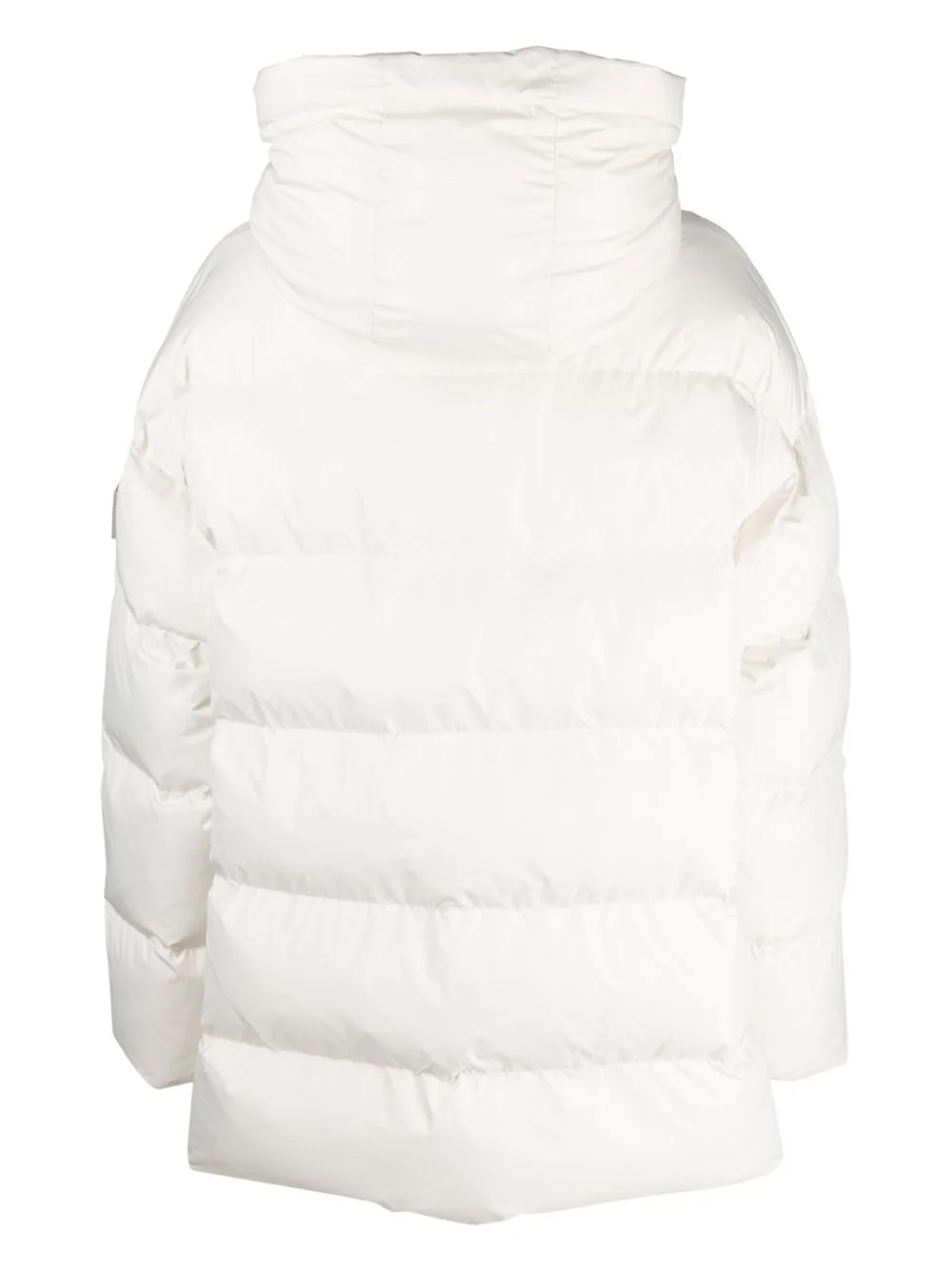 Jacheta alba din fibre sintetice, matlasata, cu guler inalt, gluga, snur si inchidere cu fermoar dublu, maneci lungi, mansete elastice, buzunare laterale si tiv drept. Potrivita pentru sezonul toamna/iarna. 100% poliester; 100% poliamida.