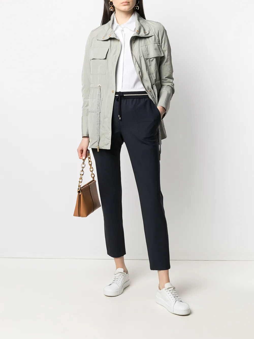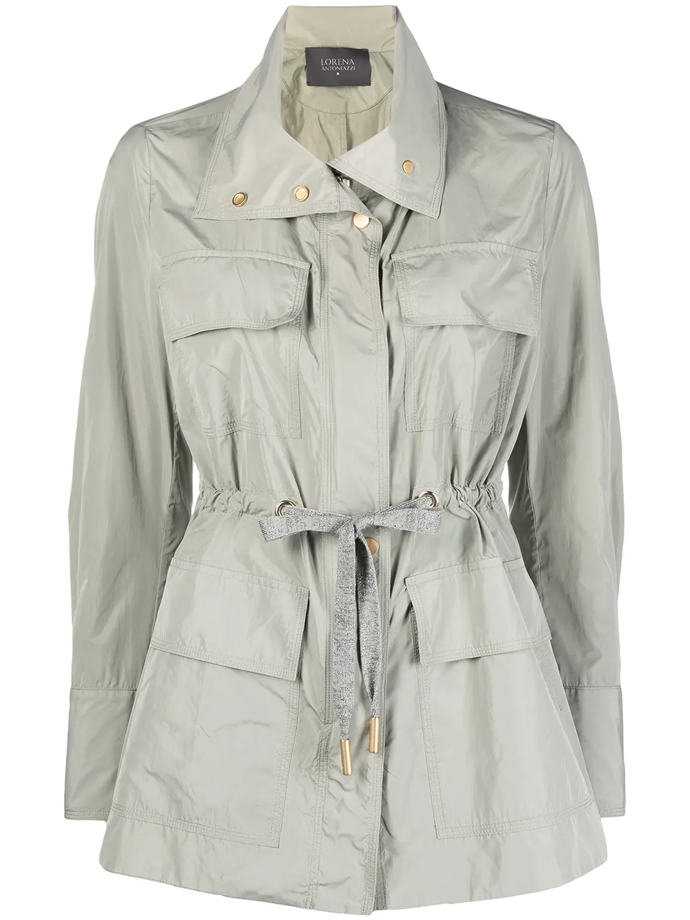Jacheta Lorena Antoniazzi Tie-Waist Windbreaker gri, din poliester, cu guler inalt, inchiedere cu fermoar, maneci lungi, buzunare aplicate pe laterate si la piept, snur textil in jurul taliei si tiv drept. Potrivita pentru primavara/vara. 100% poliester.