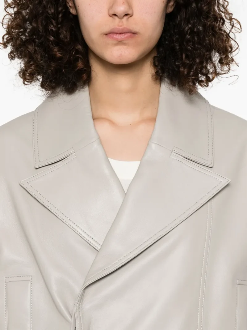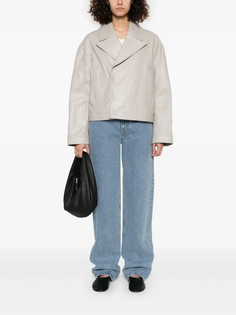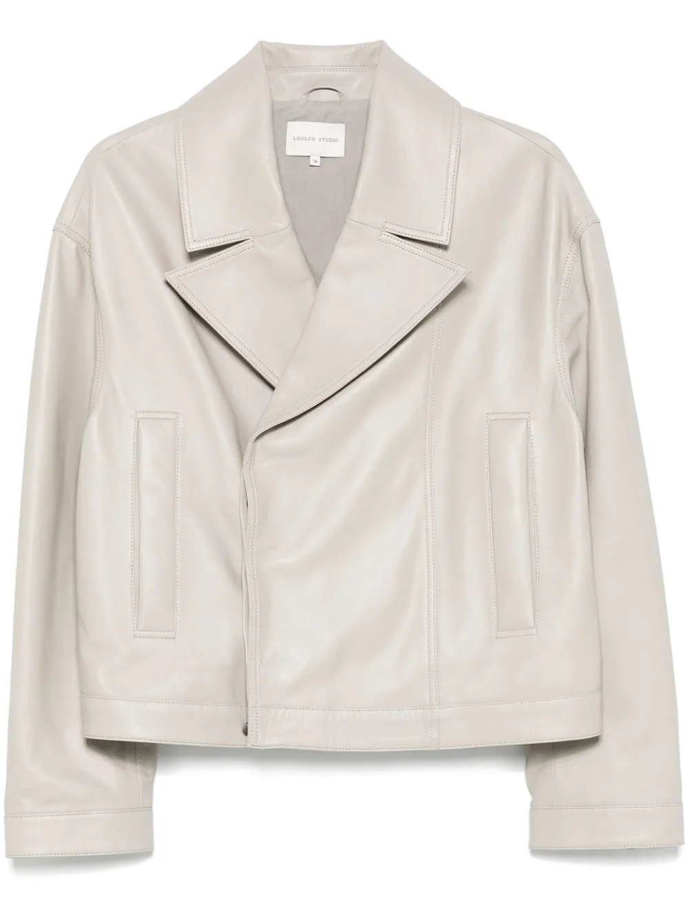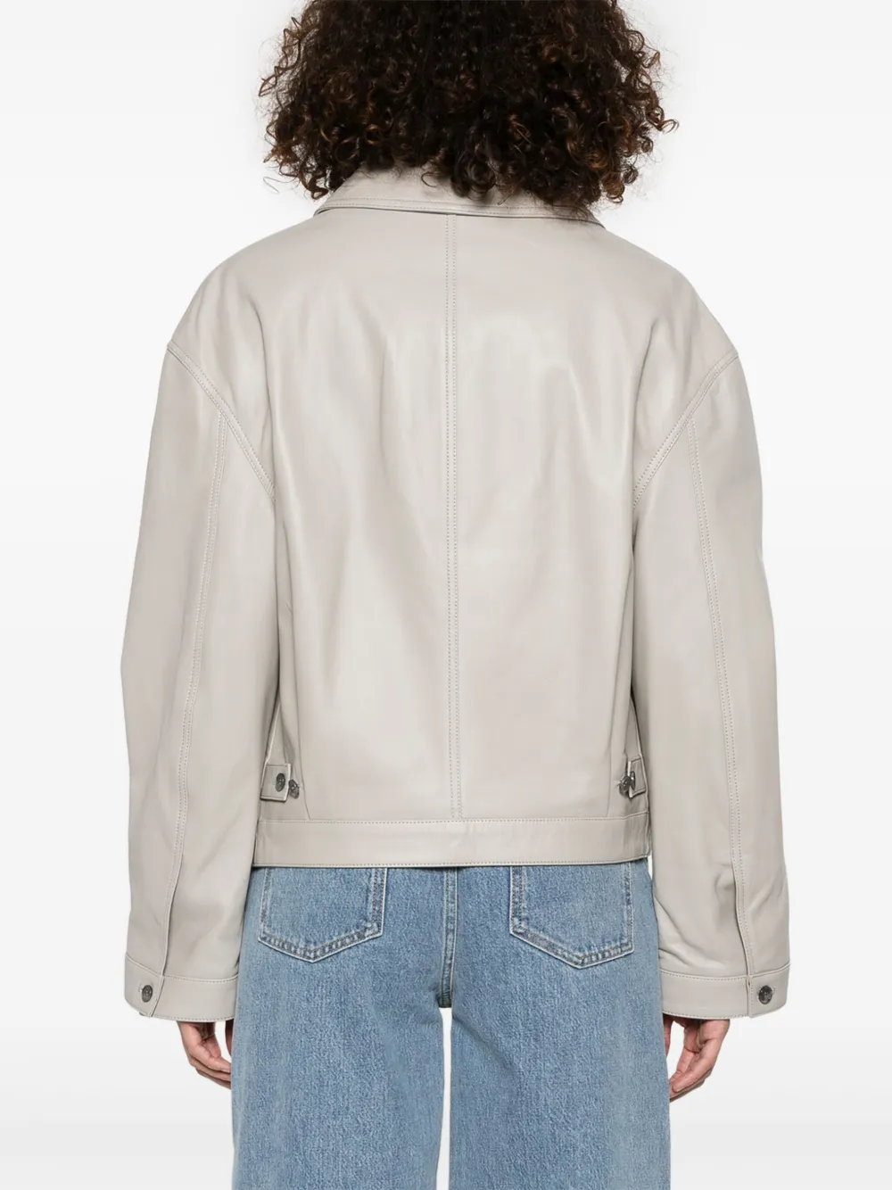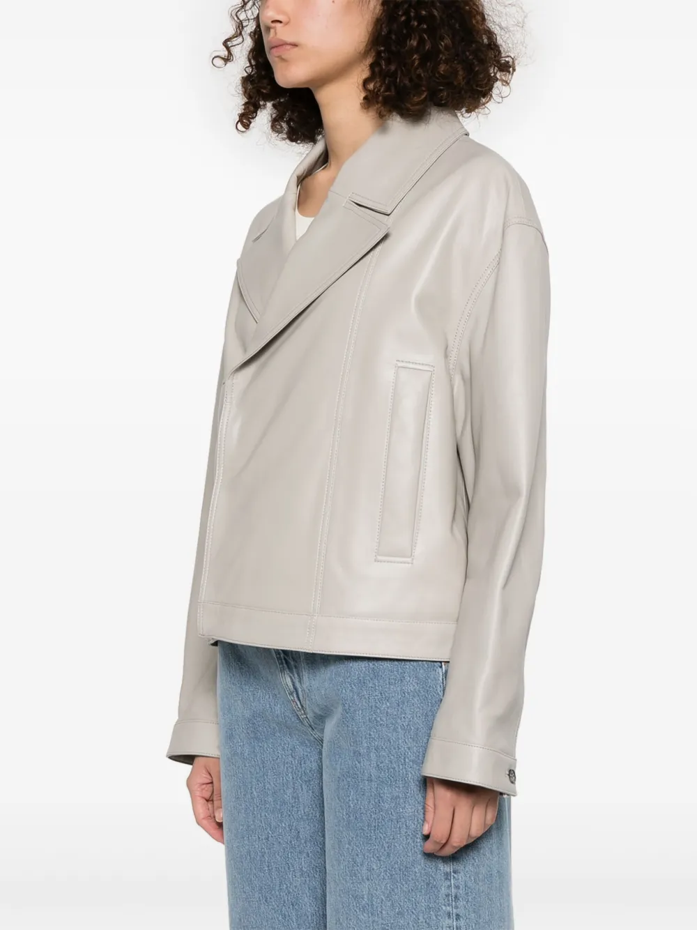 Jacheta Loulou de Saison Kaipan Biker gri, din piele, cu guler biker, inchidere cu fermoar ascuns, umeri cazuti, maneci lungi, mansete cu nasturi si tiv drept. Potrivita pentru sezonul primavara/vara. 100% viscoza; 100% bumbac; 100% piele de miel.