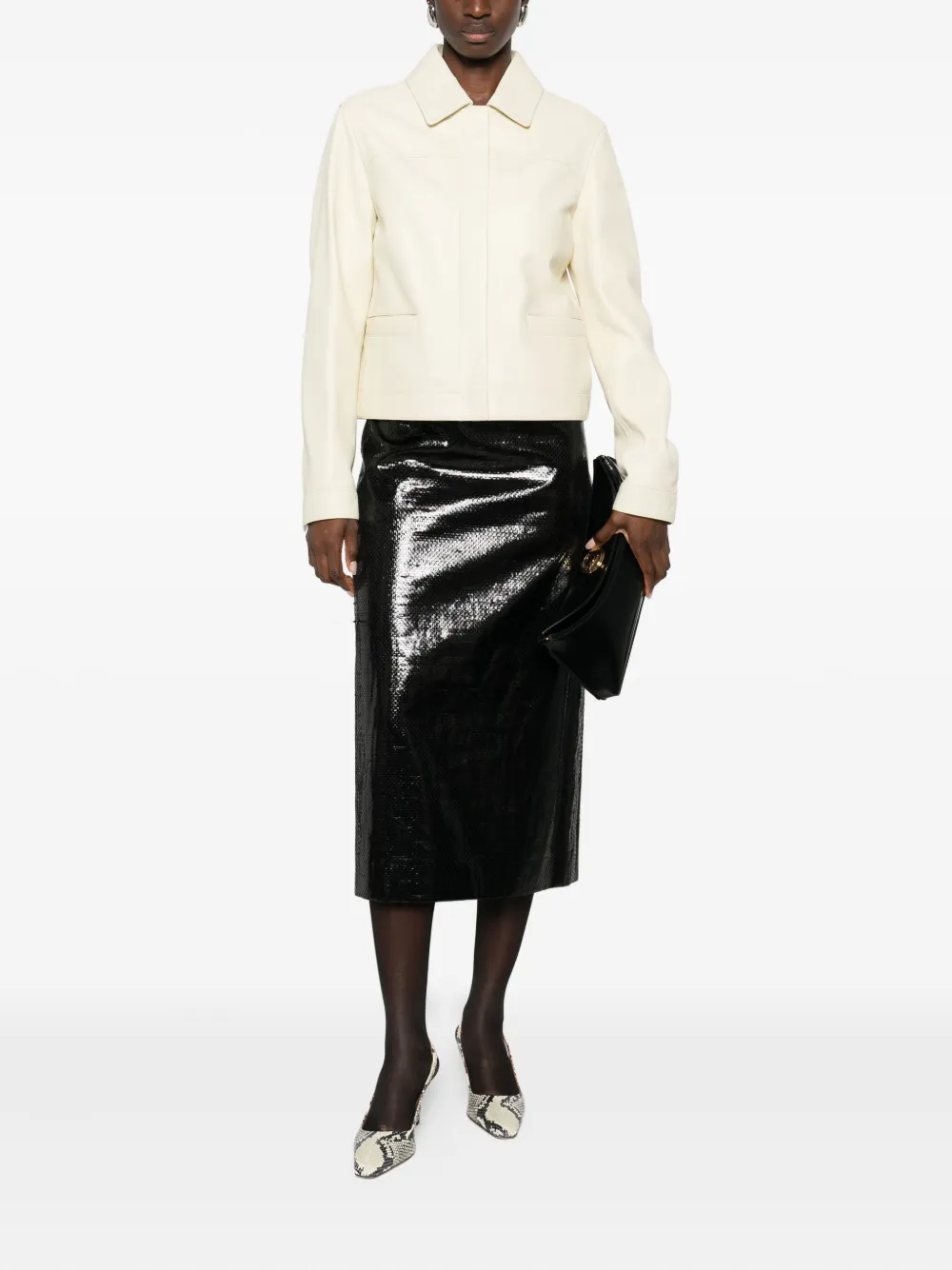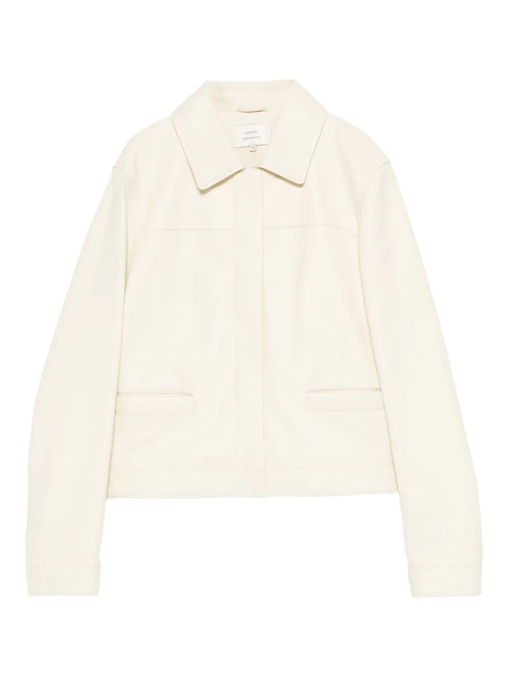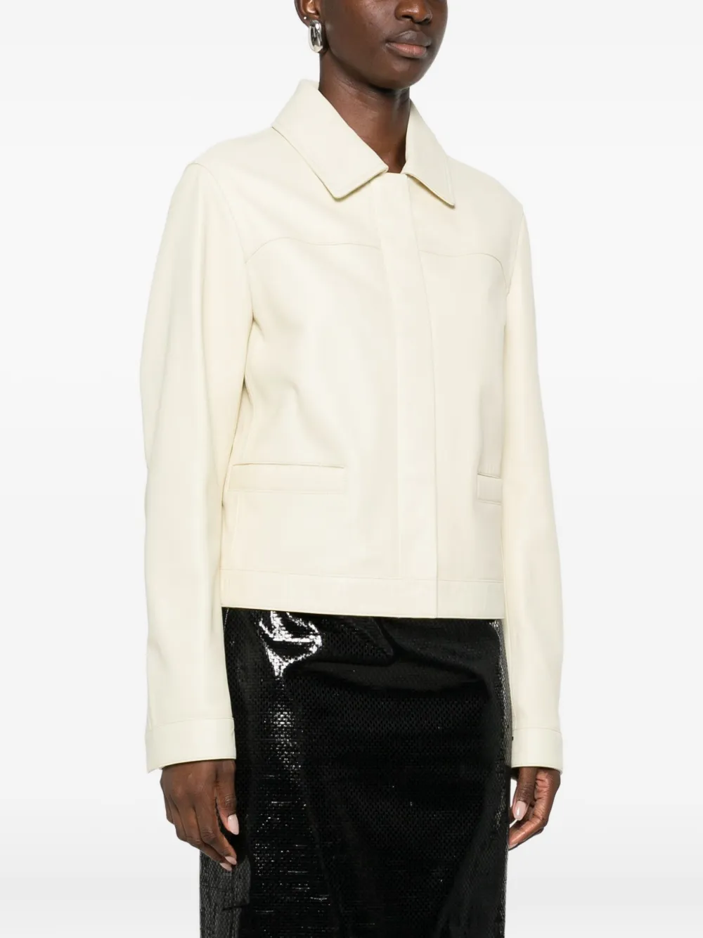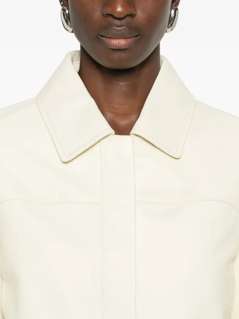 Jacheta LouLou de Saison Zip-Up ecru, realizata din piele, straight-fit cu silueta structurata, guler clasic, inchidere cu capse si nasturi ascunsi, buzunare laterale cu refileti, captuseala din viscoza si tiv drept. Potrivita pentru sezonul toamna/iarna. 100% viscoza; 100% piele de miel.