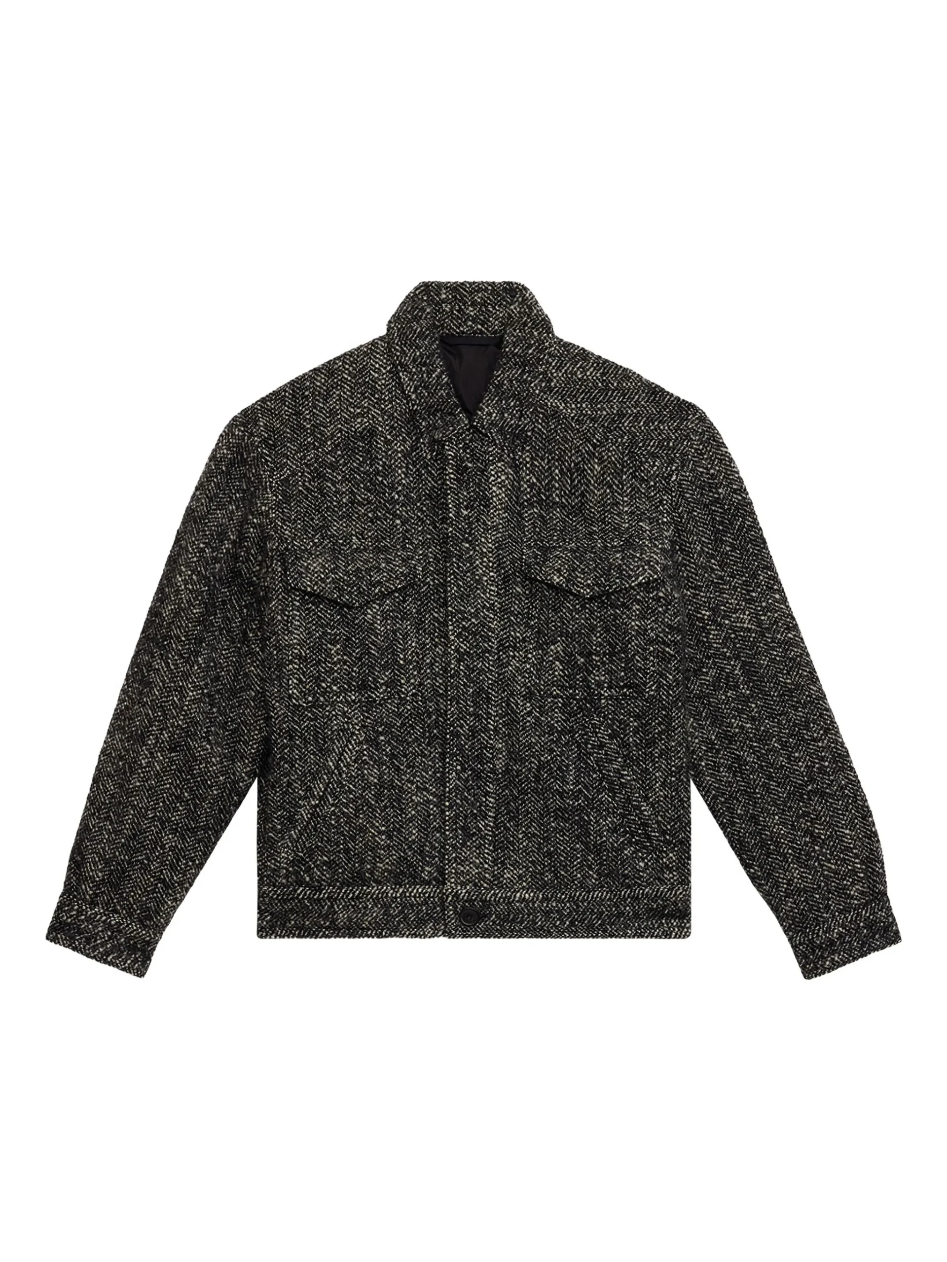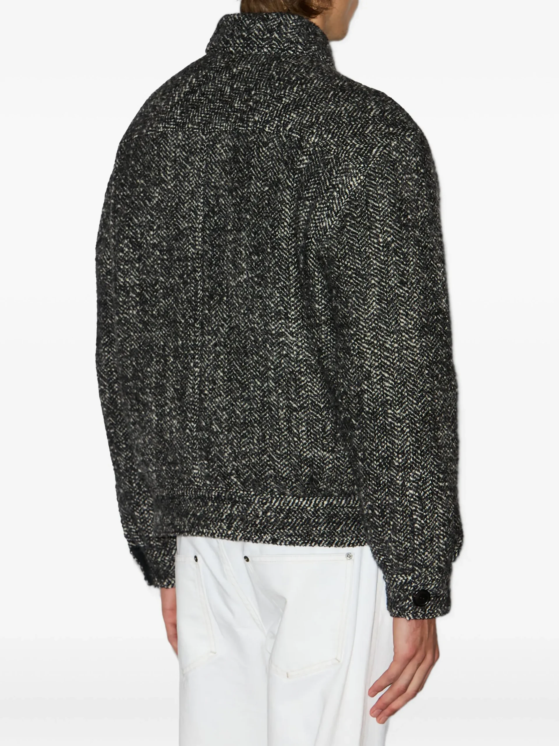 Jacheta Isabel Marant Folco neagra, cu model herringbone, inchidere frontala ascunsa, buzunare cu clapeta si tiv drept. 67% lana 17% poliester 16% acril
