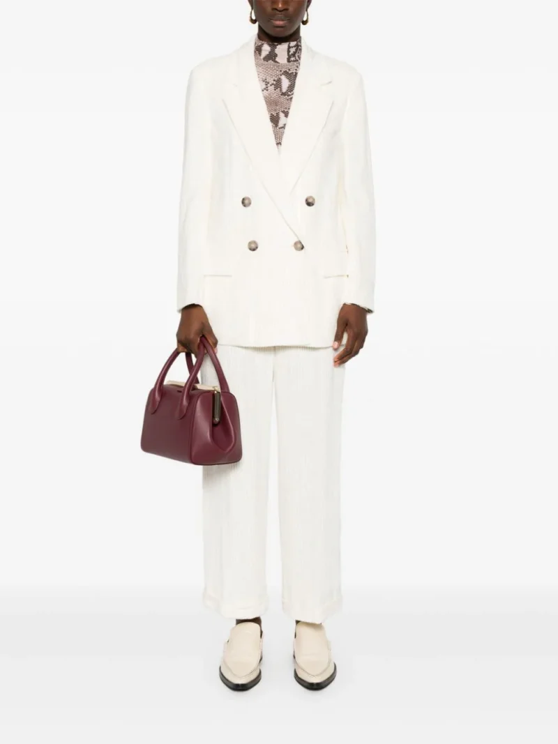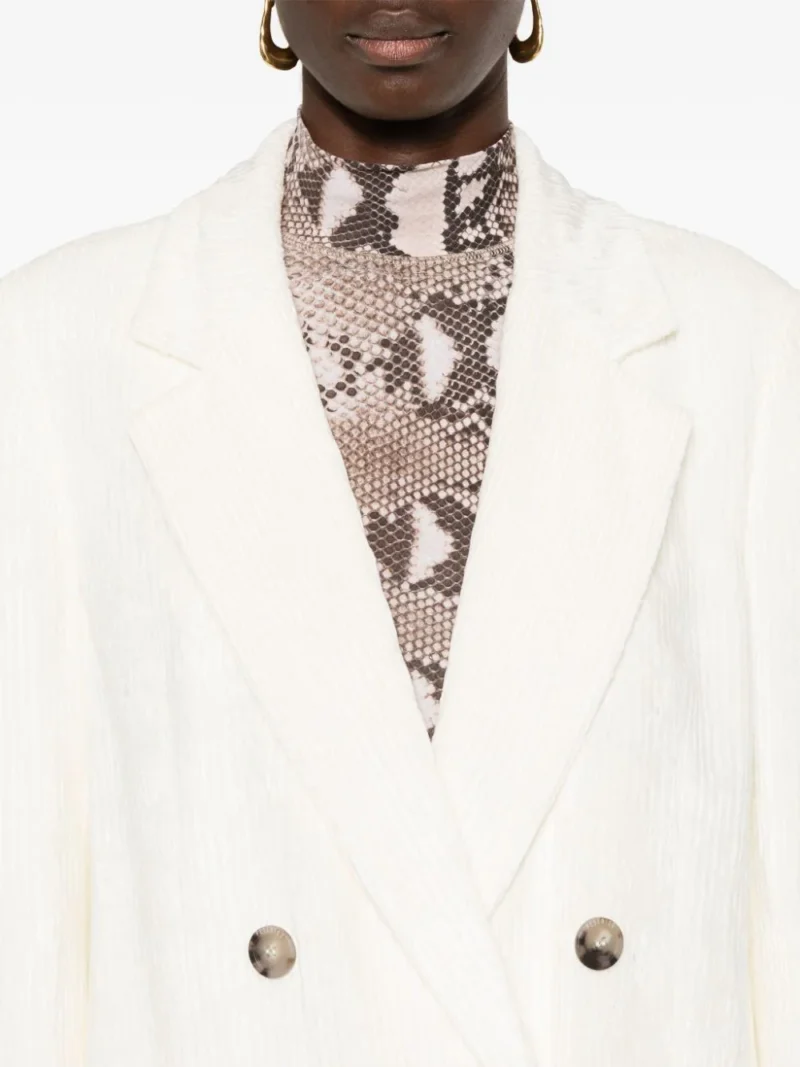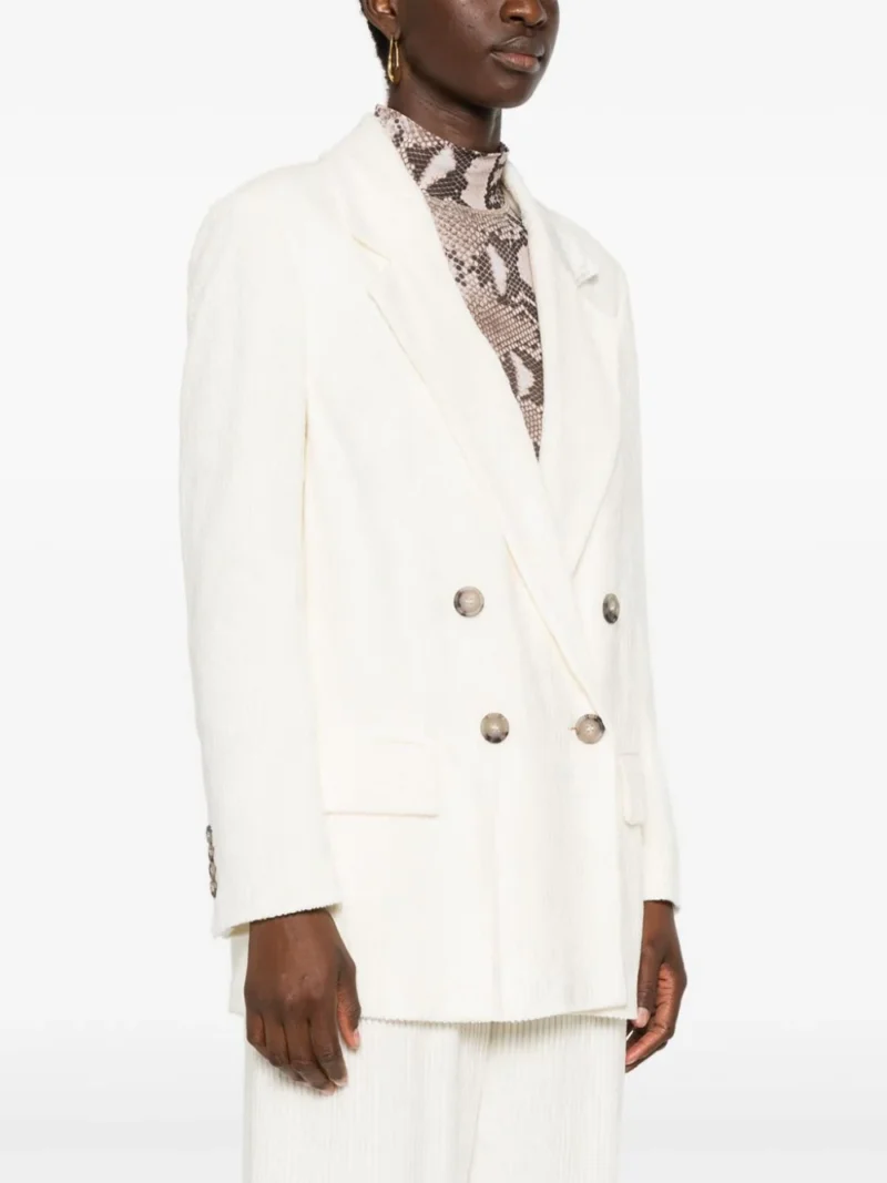 Jacheta Peserico Double-Breasted alb, din viscoza velur, cu decolteu in V, inchidere dubla cu nasturi, guler crestat, umeri conturati, maneci lungi, mansete cu nasturi, buzunare laterale cu clapete, slit la spate si tiv drept. Potrivit pentru sezonul toamna/iarna. 100% viscoza; 100% viscoza.