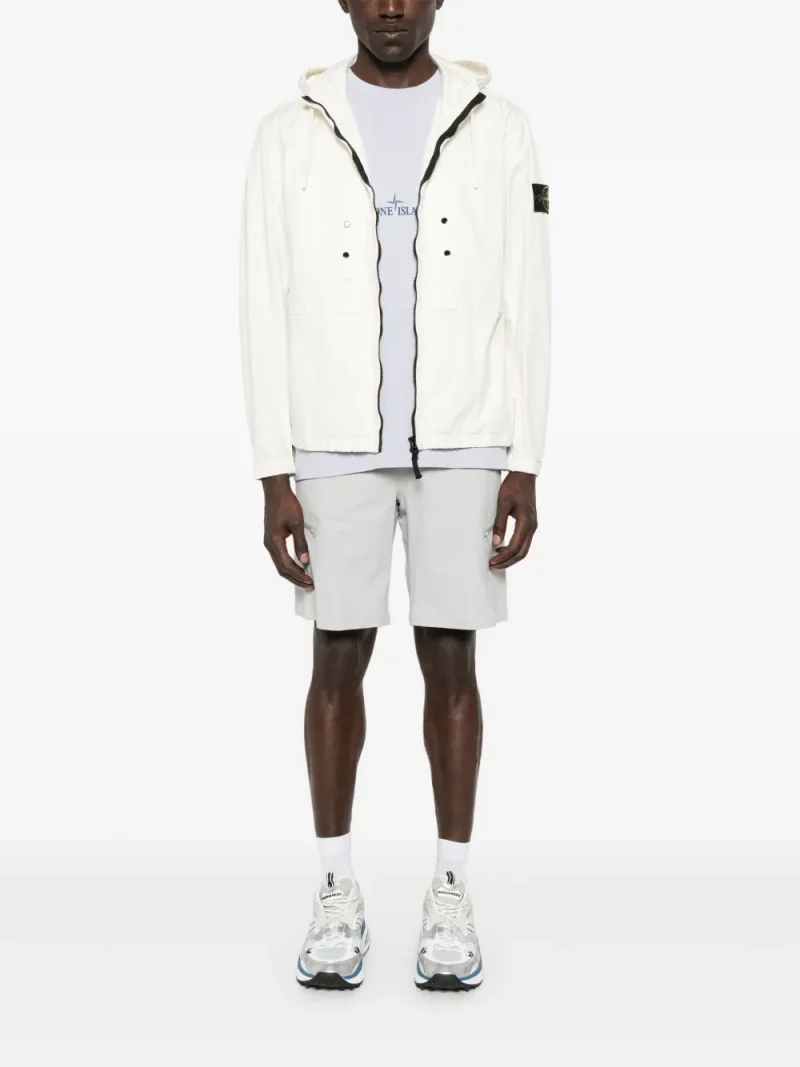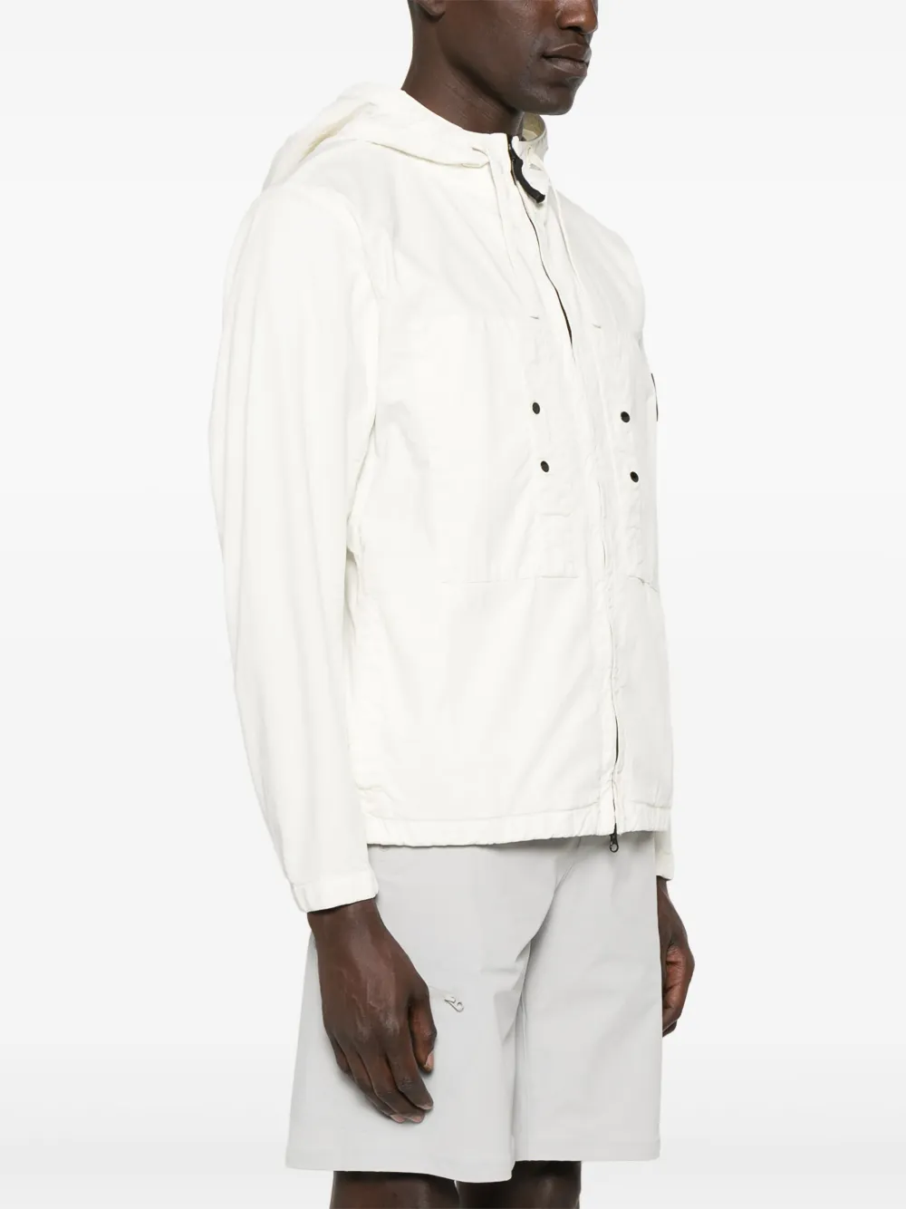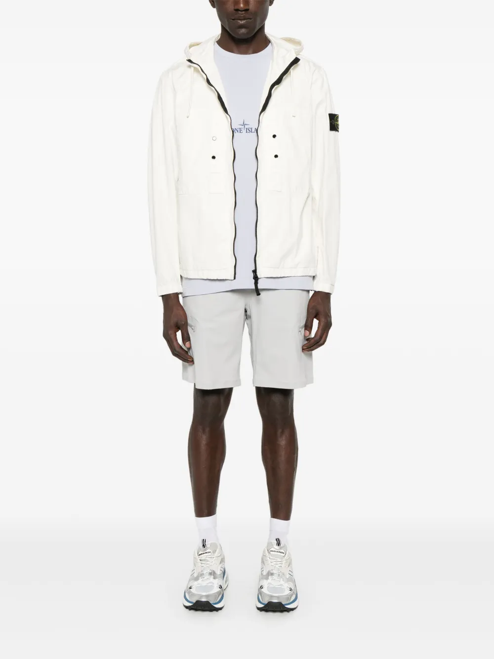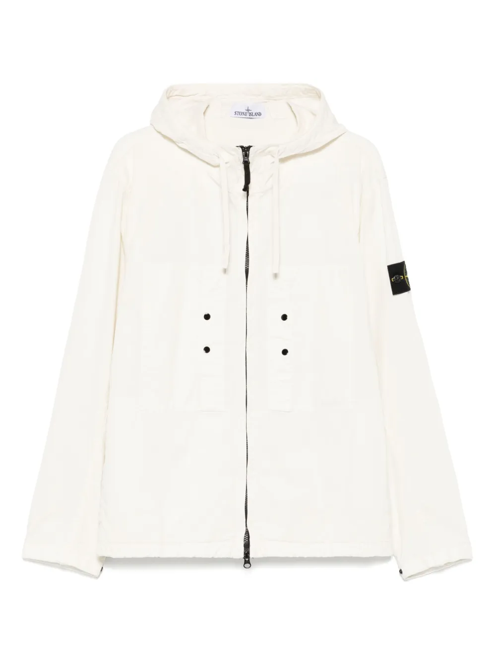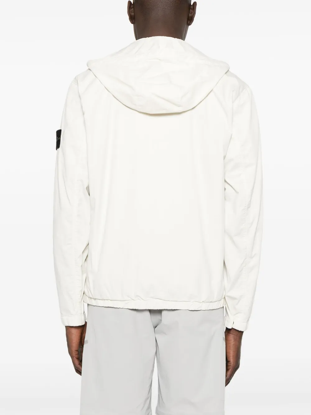 Jacheta Stone Island Compass-Badge alb, din bumbac, cu gluga si snur, inchidere cu fermoar dublu, maneci lungi, buzunare la piept cu inchidere capsa, eticheta detasabila Compass Badge pe o maneca si tiv drept. Potrivita pentru sezonul primavara/vara. 97% bumbac; 3% elastan.