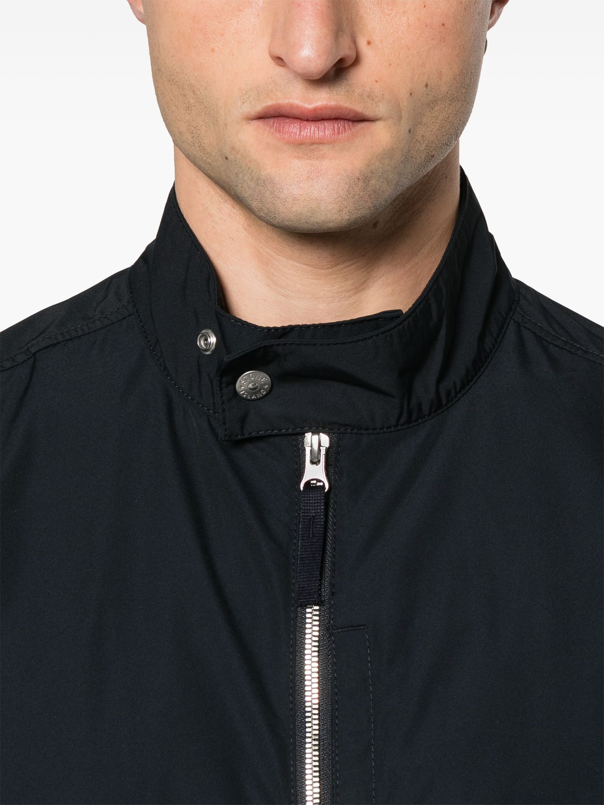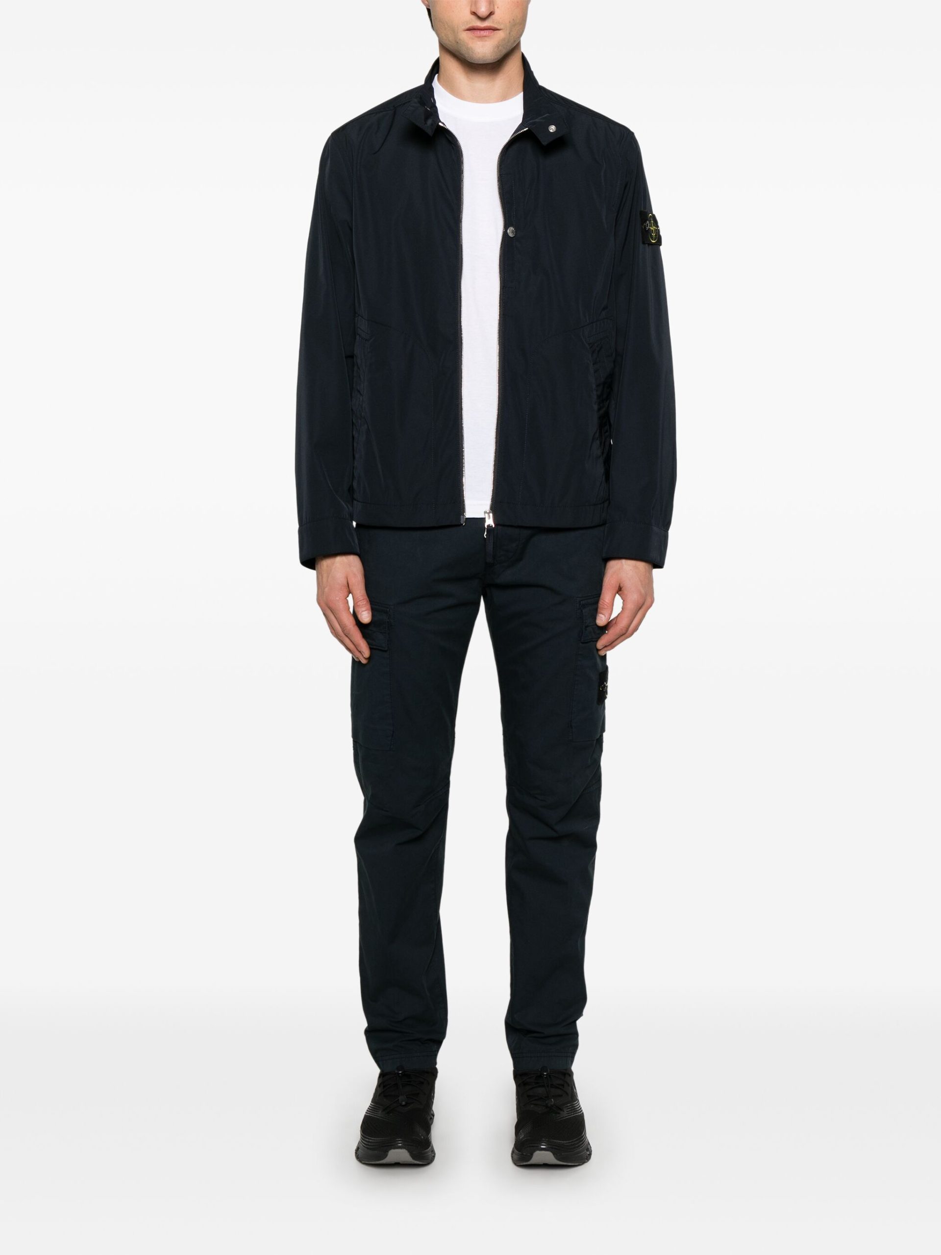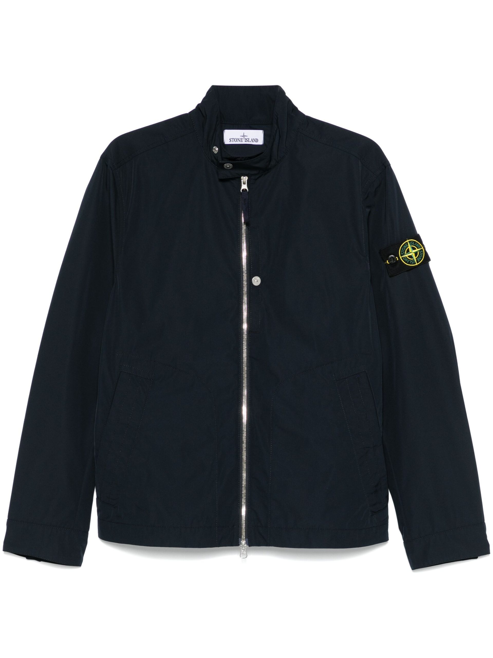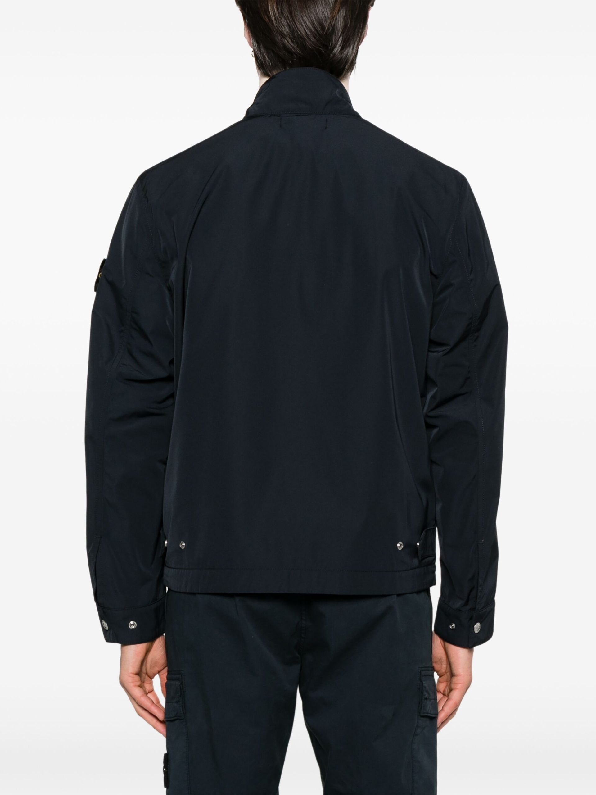 Jacheta Stone Island Compass-Badge negru, cu guler clasic, inchidere cu fermoar, maneci lungi, mansete cu capse, logo Compass cusut pe o manecasi tiv drept. Potrivita pentru sezonul toamna/iarna. 100% poliester