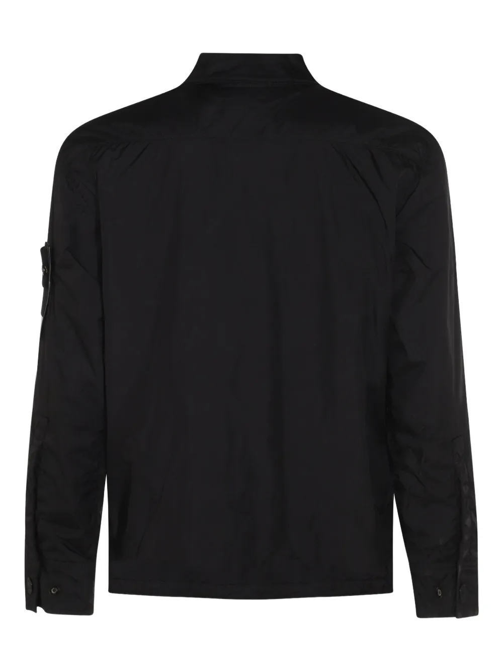 Jacheta Stone Island Compass-Motif negru, din poliamida, cu guler clasic, inchidere cu nasturi ascunsi, maneci lungi, mansete cu capse, buzunar cu clapeta asimetrica aplicat la piept, eticheta logo Compass Badge pe o maneca si tiv drept. Potrivita pentru sezonul toamna/iarna. 100% poliamida.