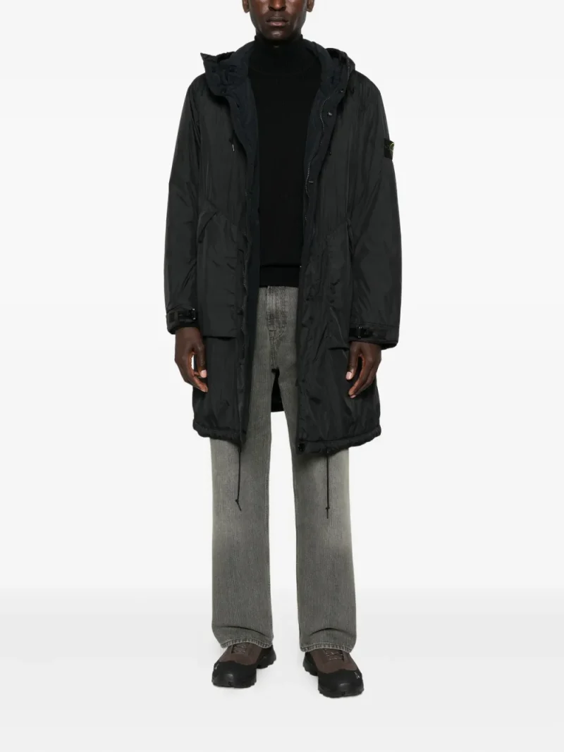 Jacheta Stone Island Hooded Drawstring negru, cu gluga si nasturi, inchidere cu nasturi si fermoar, maneci lungi, buzunare diagonale cu inchidere fermoar, logo Compass Badge detasabil pe o maneca si tiv cu inchidere snur. Potrivita pentru sezonul toamna/iarna. 100% viscoza; 100% poliamida.