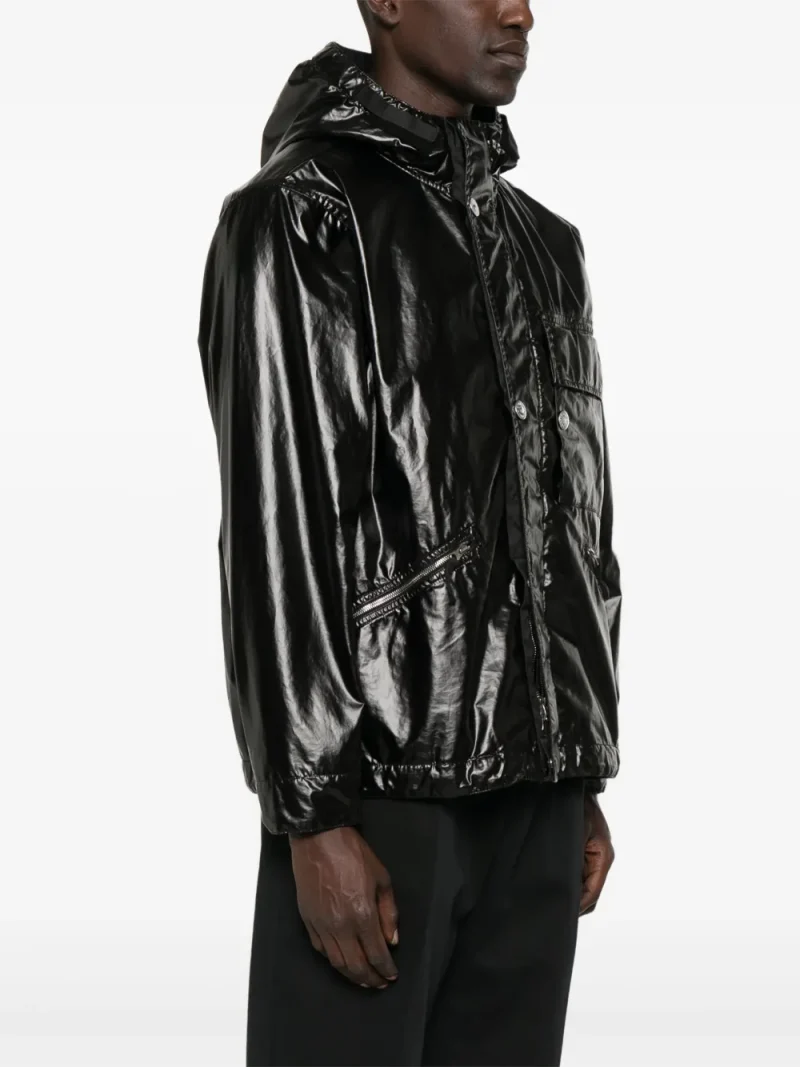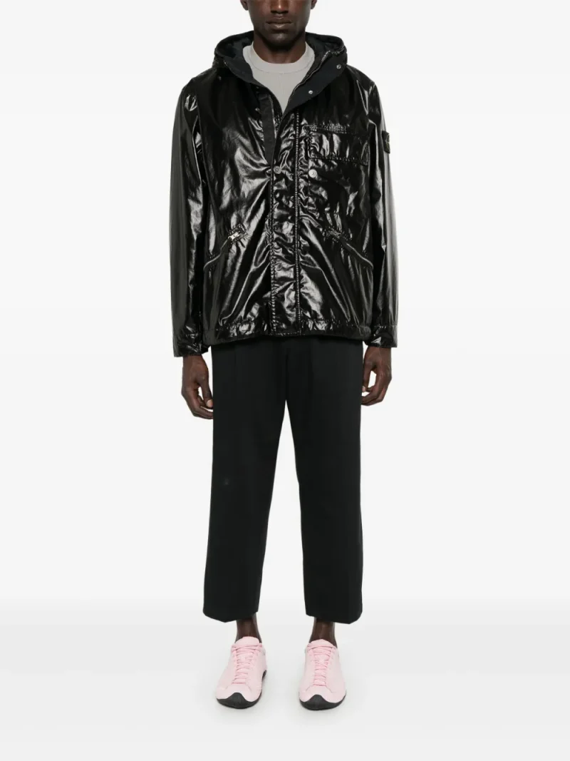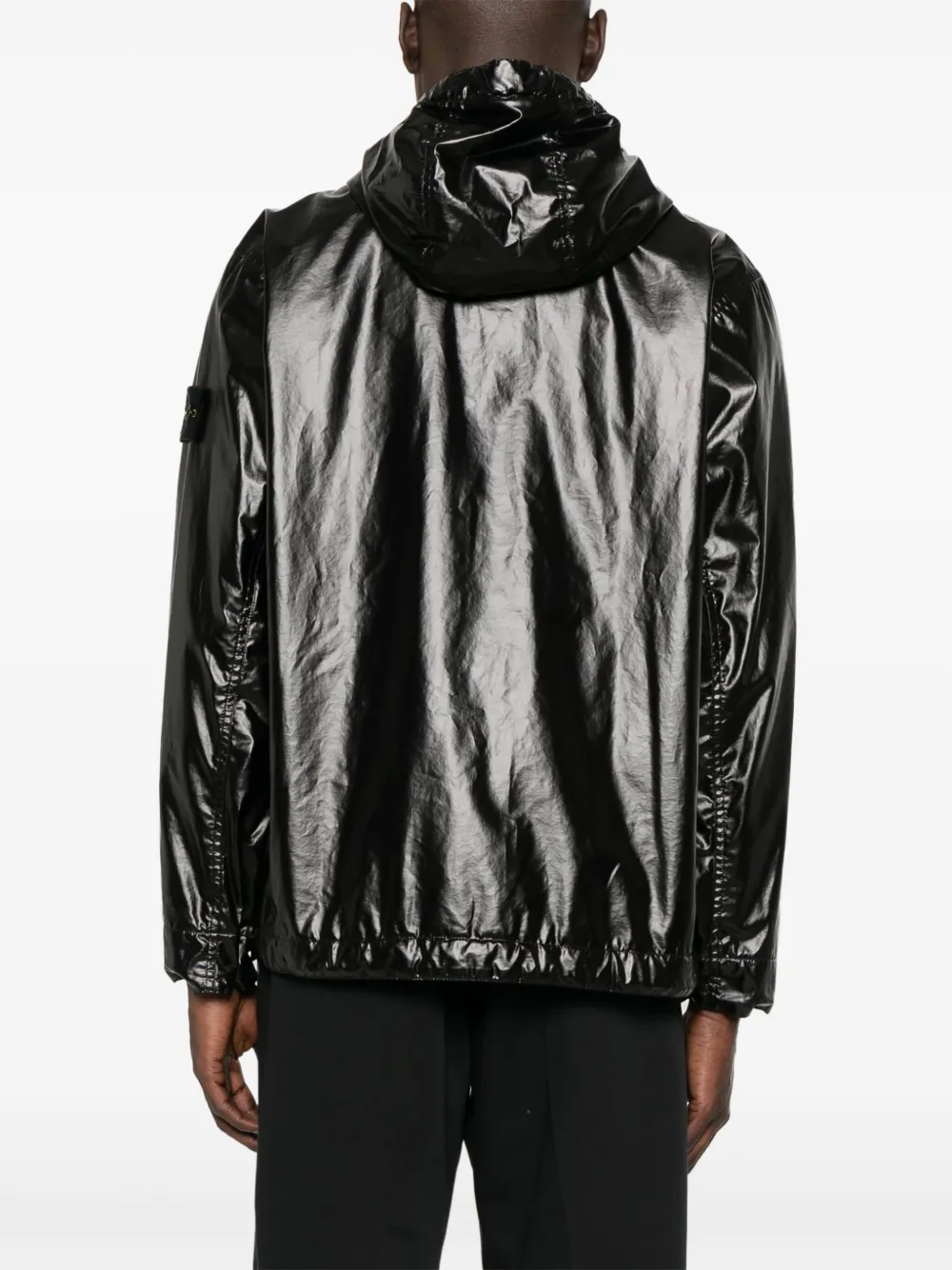 Jacheta Stone Island Mussola Gommata negru, din bumbac cu efect lucios, cu gluga si guler inalt, inchidere cu capse, maneci lungi, semnatura Compass Badge detasabila, buzunare laterale cu fermoar, buzunar aplicat la piept si tiv cu inchidere elastic, Potrivita pentru sezonul primavara/vara. 100% bumbac; 100% poliuretan; 100% poliamida.