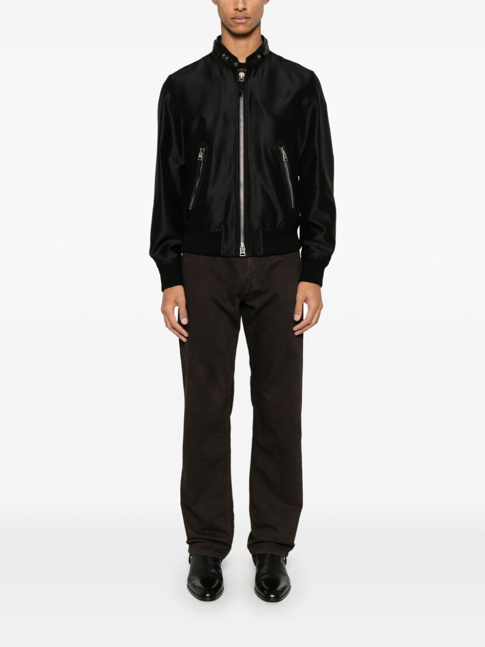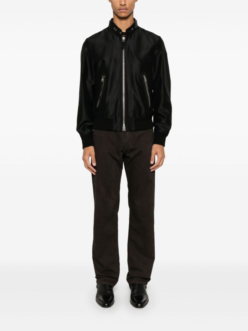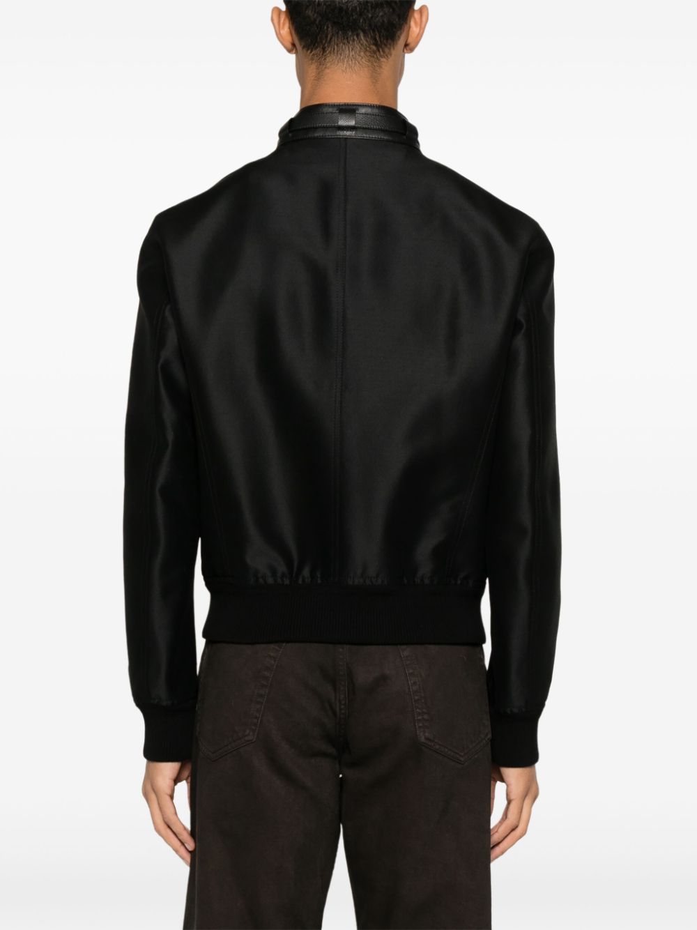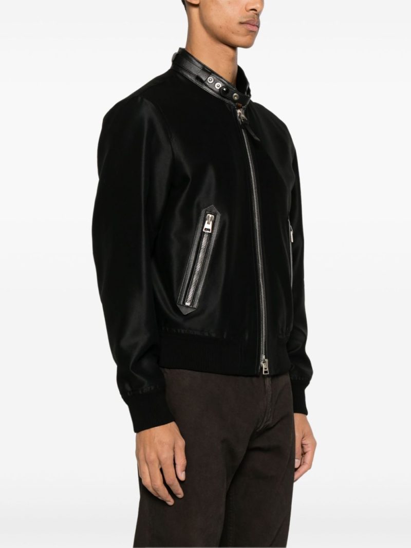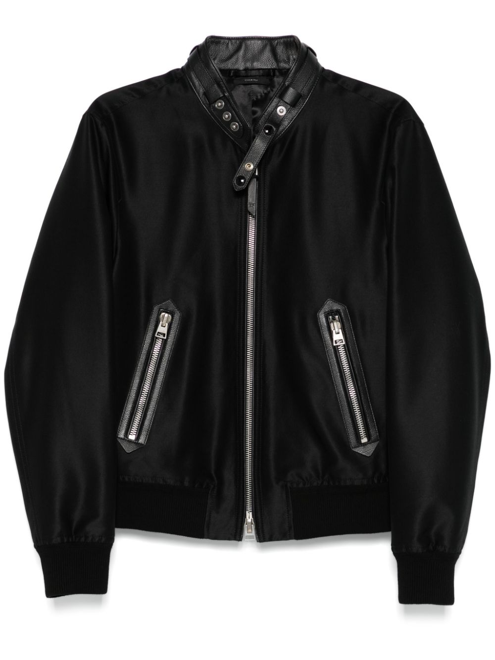 Jacheta Tom Ford Bomber negru, din lana si matase, cu gule inalt, maneci lungi, mansete elastice, inchidere cu fermoar dublu si capse, buzunare laterale cu fermoar, captuseala din viscoza premium si tiv elastic drept. Potrivita pentru sezonul primavara/vara. 100% viscoza; 84 % lana; 16% matase.